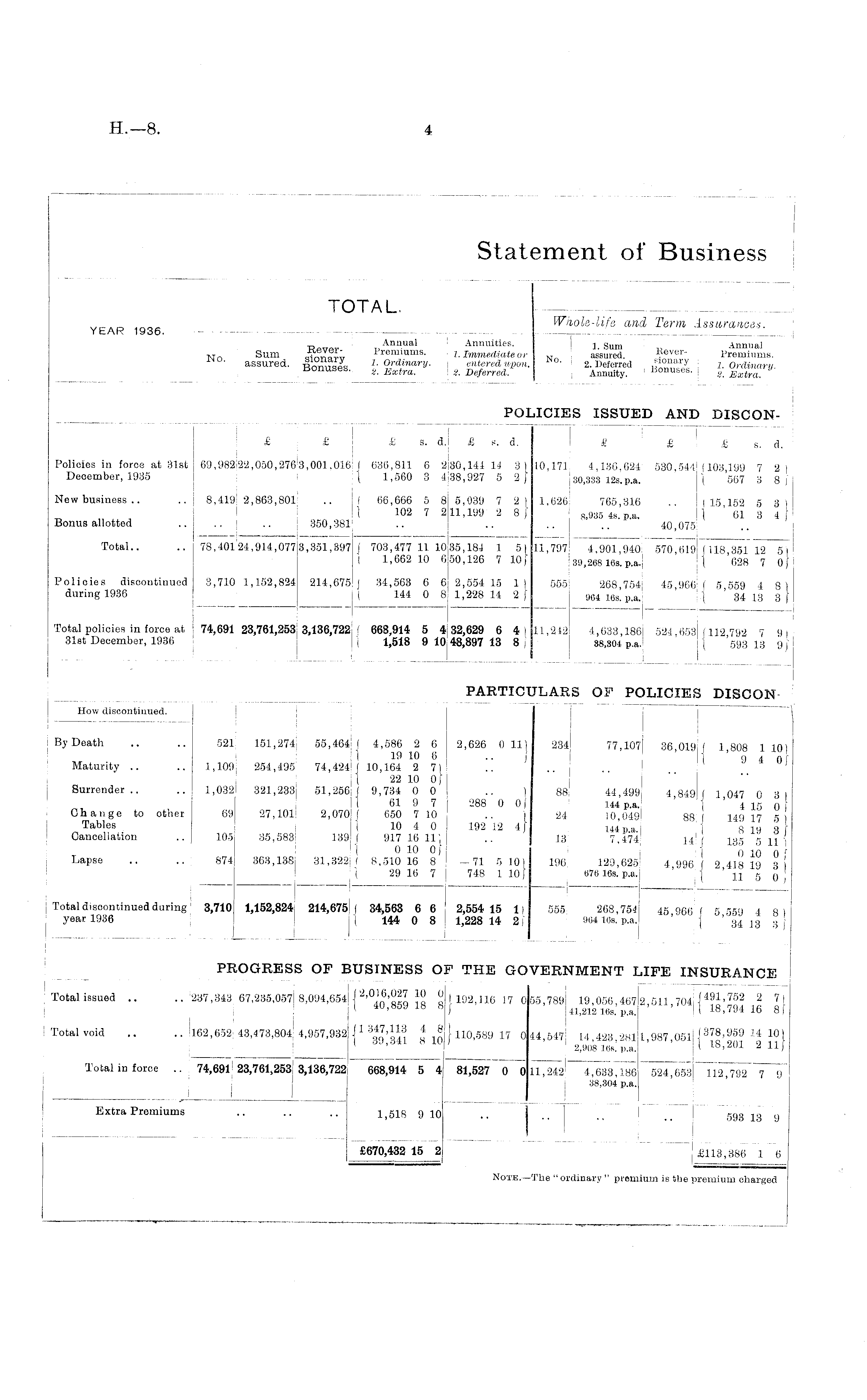 TOTAL. vcAo ,00* Whole-life and Term Assurance*. Y t/\r\ iaoO' ' -.— ■■■— — ■ ——-■ ■ —;- —— ■ ■ —— .———______ —_— , ■R_™v i Annual Annuities. 1.8am i „ Annual No Sum ijonS" Premiums. j j, Imme .diate or N assured. Eever " ! Premiums. No - assured. f o °^ s r J s I- Ordinary. entered upon. No - 2. Deferred ,fZZl 1. Ordinary. Bonuses,. g fefra. | 2. Deferred. Annuity. ! BonUBeb - <>. Extra. ' POLICIES ISSUED AND DISCON- £ £ a, s. a. £ p. a. £ £ £ s. a. Policies in force at 31st 69,982(22,050,27613,001,016] 636,811 6 230,141 14 3) 10,171; 4 136 624 530 544 (103 199 7 2 I December, 1935 \ l,S60 3 4 38,927 5 2} 30,333 12 8 .p.aJ ( 's67 3 8| New buBiness .. .. 8,419)2,863,801 .. I 66,666 5 8 5,039 7 2) 1,626 765,316 ; .. 115 152 5 3 1 _ 1 102 7 211,180 2 8} 8,935 4s. p.aj ' 61 3 4 f Bonus allotted .. .. .. 350,381 .. .. .. 40,075 Total.. .. 78,401 24, 914,0778,851,897 | 703,477 11 1035,18J 1 51 11,797 4,9Ol,94oi 570 619 f 118 331 12 S I I 1,662 10 650,126 7 10f 39,26816s. p.a. \ '628 7 Of Polioies discontinued 3,710 1,152,824 214,675 J 34,563 6 6 2,554 15 1) 555 268 754 45 966 f 5 559 4 8] during 1936 ( 144 0 8 1,228 14 2f 964 16s! p.a. \\ ' 34 IS 3 | Total policies in force at 74,691 23,761,253 3,136,722 ( 668,914 5 4 32,629 6 4)11,242 4,633,186 524 653(112 792 7 91 ■ 31st December, 1936 j 1,518 9 10 48,897 13 8] 88,304 p.a. { '593 13 9} PARTICULARS OF POLICIES DISCON How discontinued. ~~° _. ______^___^___________-__. ByDeath .. .. 68l| 151,274! 55,464 f 4,586 2 6 2,626 0 11 234 77,107 36 019 f 1808 1101 I ( 19 10 8 .. l ' q 4 n Maturity .. .. 1,109! 254,495! 74,424U 10,164 2 7) ' |1 22 10 0 f Surrender.. .. 1,032 321,233 51,2561] 9,734 0 0 .. ) 88 44,499 4 849 f 1047 0 4 1 1 61 9 7 288 0 0 ( 144 p.a. ' 4 16 0 Change to other 69 27,101 2,070 f 650 7 10 .. i 24 10 049 88 1 149 17 <i Tables | 10 4 0 192 12 i) U 4 Pa 8 14 S Cancellation .. 105 35,583| 139 f 917 16 11', .. 13 ! 7 474 14 | ig 5 511 It 0 10 0) I ! 0 10 0 Lapse .. .. 874 363,138 31,322 ( 8,510 16 8 -71 5 10] 196 129,625 4 996 2 418 19 3) 1 29 16 7 j 748 1 10) 67616s. p.a. j ' n 5 0 Totaldisoontinuedduring 3,710 1,152,824 214,675 ( 34,563 6 6 2,554 15 1| 555i 268,754 45 966'f 5 559 4 8) year 1936 j 144 0 8 1,228 14 2) 96416s. p.a. !| ' 34 13 3 | PROGRESS OF BUSINESS OP THE GOVERNMENT LIFE INSURANCE Totalised .. .. |237, 343. 67,235,057J 8,094,654 { 2 10 " I 192,116 17 0 55,789 19,056,467 2,511,704 i^l'l 52 2 7 l ' I 41,212 16s. p.a. I -*■" ' ' 9 _: 16 8 [ I Totalvoid .. .. Il62,652| 43,473,804 4,957,932 j lb «.llS } 110,589 17 0 44,547 14,423,2811,987,051 I 378 ' 939 U 1O 1 I l 2,908 16s. p.a. I 18,201 2 11J Total in force .. 74,691 23,761 S 253J 3,136,722 668,914 5 4 81,527 0 011,242 524,653 Tl27792~TT 38,304 p.a. Extra Premiums 1,518 9 10 .. .. .. .. 598 13 9 _ J £670,432 15 2 £113,386 1 6 Note.—The " ordinary " premium ie the premium charged