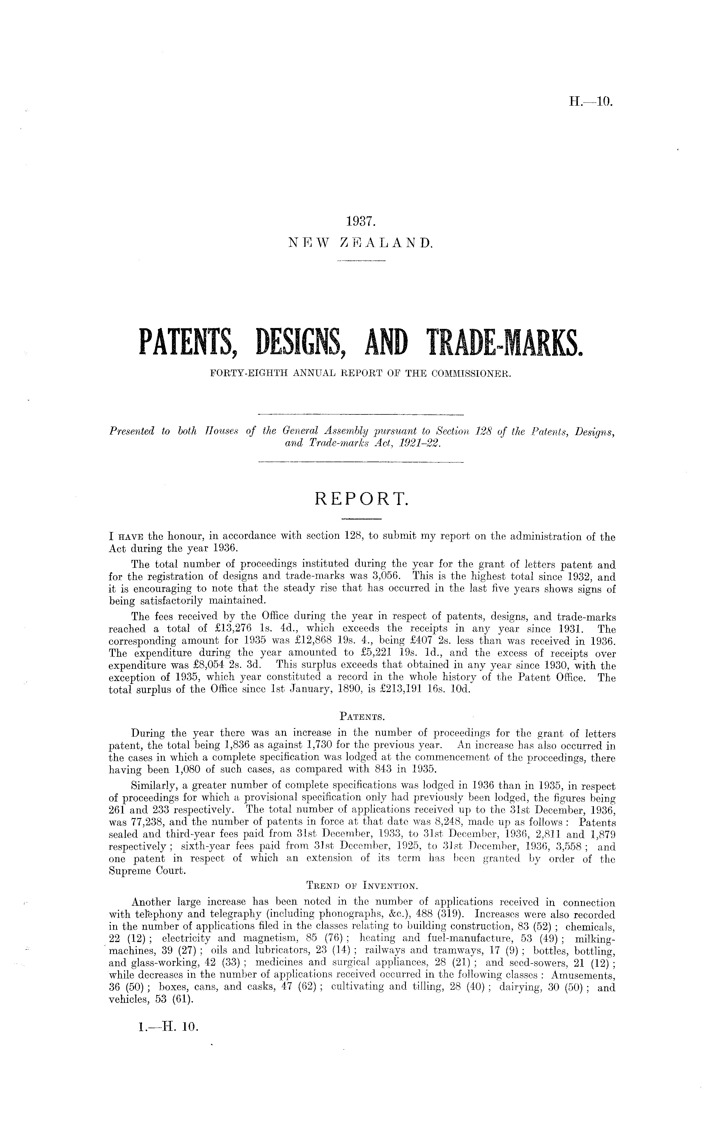 I have the honour, in accordance with section 128, to submit my report on the administration of the Act during the year 1936. The total number of proceedings instituted during the year for the grant of letters patent and for the registration of designs and trade-marks was 3,056. This is the highest total since 1932, and it is encouraging to note that the steady rise that has occurred in the last five years shows signs of being satisfactorily maintained. The fees received by the Office during the year in respect of patents, designs, and trade-marks reached a total of £13,276 Is. 4d., which exceeds the receipts in any year since 1931. The corresponding amount for 1935 was £12,868 19s. 4., being £407 2s. less than was received in 1936. The expenditure during the year amounted to £5,221 19s. Id., and the excess of receipts over expenditure was £8,054 2s. 3d. This surplus exceeds that obtained in any year since 1930, with the exception of 1935, which year constituted a record in the whole history of the Patent Office. The total surplus of the Office since Ist January, 1890, is £213,191 16s. lOd. Patents. During the year there was an increase in the number of proceedings for the grant of letters patent, the total being 1,836 as against 1,730 for the previous year. An increase has also occurred in the cases in which a complete specification was lodged at the commencement of the proceedings, there having been 1,080 of such cases, as compared with 843 in 1935. Similarly, a greater number of complete specifications was lodged in 1936 than in 1935, in respect of proceedings for which a provisional specification only had previously been lodged, the figures being 261 and 233 respectively. The total number of applications received up to the 31st December, 1936, was 77,238, and the number of patents in force at that date was 8,248, made up as follows : Patents sealed and third-year fees paid from 31st December, 1933, to 31st December, 1936, 2,811 and 1,879 respectively ; sixth-year fees paid from 31st December, 1925, to 31st December, 1936, 3,558 ; and one patent in respect of which an extension of its term has been granted by order of the Supreme Court. Trend op Invention. Another large increase has been noted in the number of applications received in connection with tefephony and telegraphy (including phonographs, &c..), 488 (319). Increases were also recorded in the number of applications filed in the classes relating to building construction, 83 (52) ; chemicals, 22 (12) ; electricity and magnetism, 85 (76) ; heating and fuel-manufacture, 53 (49) ; milkingmachines, 39 (27) ; oils and lubricators, 23 (14) ; railways and tramways, 17 (9) ; bottles, bottling, and glass-working, 42 (33) ; medicines and surgical appliances, 28 (21) ; and seed-sowers, 21 (12) ; while decreases in the number of applications received occurred in the following classes : Amusements, 36 (50) ; boxes, cans, and casks, 47 (62) ; cultivating and tilling, 28 (40) ; dairying, 30 (50) ; and vehicles, 53 (61). I.—H. 10.