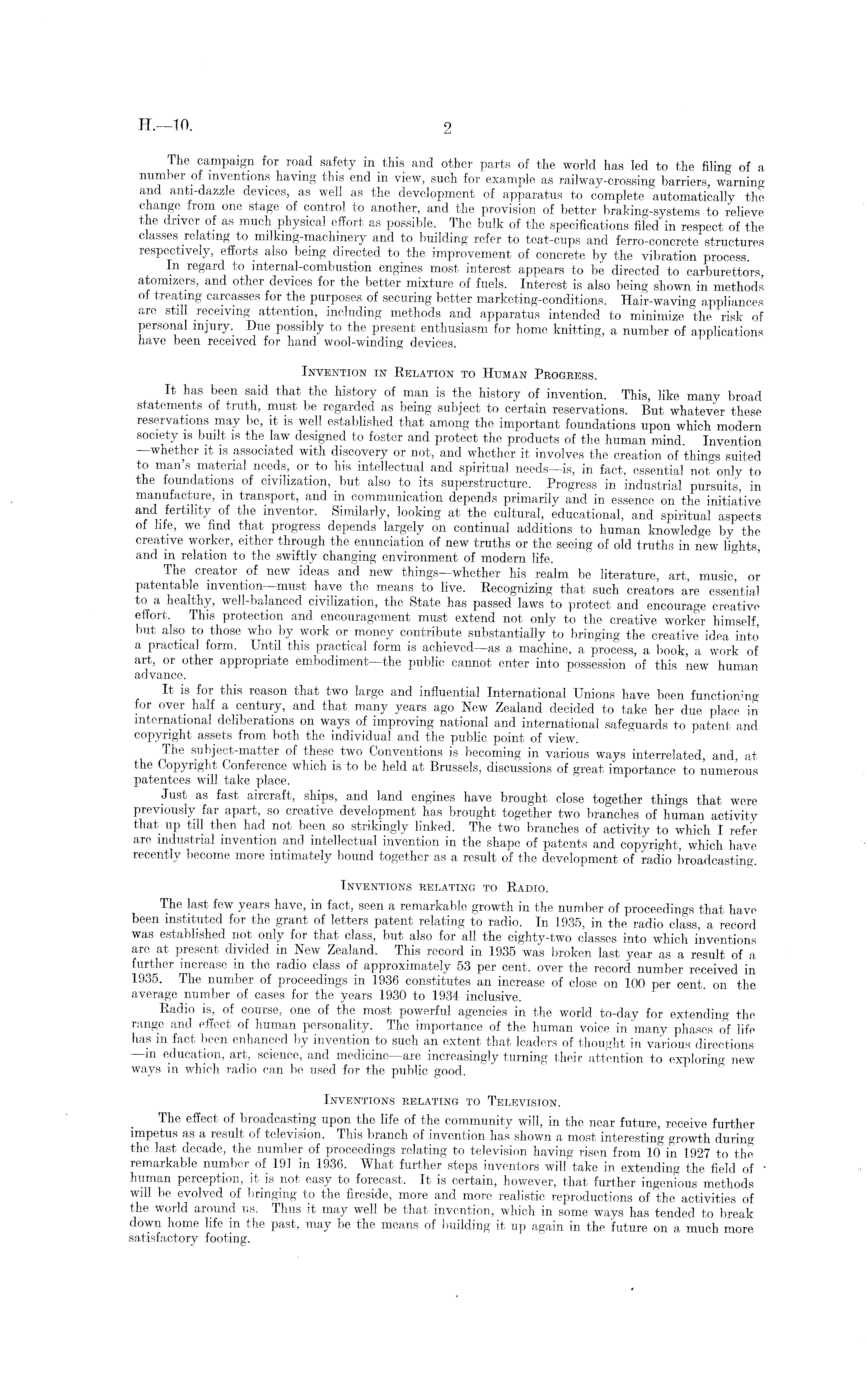 The campaign for road safety in this and other parts of the world has led to the filing of a number of inventions having this end in view, such for example as railway-crossing barriers, warning and anti-dazzle devices, as well as the development of apparatus to complete automatically the change from one stage of control to another, and the provision of better braking-systems to relieve the driver of as much physical effort as possible. The bulk of the specifications filed in respect of the classes relating to milking-machinery and to building refer to teat-cups and ferro-concrete structures respectively, efforts also being directed to the improvement of concrete by the vibration process. In regard to internal-combustion engines most interest appears to be directed to carburettors, atomizers, and other devices for the better mixture of fuels. Interest is also being shown in methods of treating carcasses for the purposes of securing better marketing-conditions. Hair-waving appliances are still receiving attention, including methods and apparatus intended to minimize the risk of personal injury. Due possibly to the present enthusiasm for home knitting, a number of applications have been received for hand wool-winding devices. Invention in Relation to Human Progress. It has been said that the history of man is the history of invention. This, like many broad statements of truth, must be regarded as being subject to certain reservations. But whatever these reservations may be, it is well established that among the important foundations upon which modern society is built is the law designed to foster and protect the products of the human mind. Invention whether it is associated with discovery or not, and whether it involves the creation of things suited to mans material needs, or to his intellectual and spiritual needs—is, in fa,ct, essential not only to the foundations of civilization, but also to its superstructure. Progress in industrial pursuits, in manufacture, in transport, and in communication depends primarily and in essence on the initiative and fertility of the inventor. Similarly, looking at the cultural, educational, and spiritual aspects of life, we find that progress depends largely on continual additions to human knowledge by the creative worker, either through the enunciation of new truths or the seeing of old truths in new lights, and in relation to the swiftly changing environment of modern life. The creator of new ideas and new things—whether his realm be literature, art, music, or patentable invention must have the means to live. Recognizing that such creators are essential to a healthy, well-balanced civilization, the State has passed laws to protect and encourage creative effort. This protection and encouragement must extend not only to the creative worker himself, but also to those who by work or money contribute substantially to bringing the creative idea into a practical form. Until this practical form is achieved—as a machine, a process, a book, a work of art, or other appropriate embodiment—the public cannot enter into possession of this new human advance. It is for this reason that two large and influential International Unions have been functioning for over half a century, and that many years ago New Zealand decided to take her due place in international deliberations on ways of improving national and international safeguards to patent and copyright assets from both the individual and the public point of view. The subject-matter of these two Conventions is becoming in various ways interrelated and at the Copyright Conference which is to be held at Brussels, discussions of great importance to numerous patentees will take place. Just as fast aircraft, ships, and land engines have brought close together things that were previously far apart, so creative development has brought together two branches of human activity that up till then had not been so strikingly linked. The two branches of activity to which I refer are industrial invention and intellectual invention in the shape of patents and copyright, which have recently become more intimately bound together as a result of the development of radio broadcasting. Inventions relating to Radio. The last few years have, in fact, seen a remarkable growth in the number of proceedings that have been instituted for the grant of letters patent relating to radio. In 1935, in the radio class, a record was established not only for that class, but also for all the eighty-two classes into which inventions are at present divided in New Zealand. This record in 1935 was broken last year as a result of a further increase in the radio class of approximately 53 per cent, over the record number received in 1935. The number of proceedings in 1936 constitutes an increase of close on 100 per cent, on the average number of cases for the years 1930 to 1934 inclusive. Radio is, of course, one of the most powerful agencies in the world to-day for extending the range and effect of human personality. The importance of the human voice in many phases of life has in fact been enhanced by invention to such an extent that leaders of thought in various directions —m education, art, science, and medicine—are increasingly turning their attention to exploring new ways in which radio can be used for the public good. Inventions relating to Television. The effect of broadcasting upon the life of the community will, in the near future, receive -further impetus as a result of television. This branch of invention has shown a most interesting growth during the last decade, the number of proceedings relating to television having risen from 10 in 1927 to the remarkable number of 191 in 1936. What further steps inventors will take in extending the field of * human perception, it is not easy to forecast. It is certain, however, that further ingenious methods will be evolved of bringing to the fireside, more and more realistic reproductions of the activitie