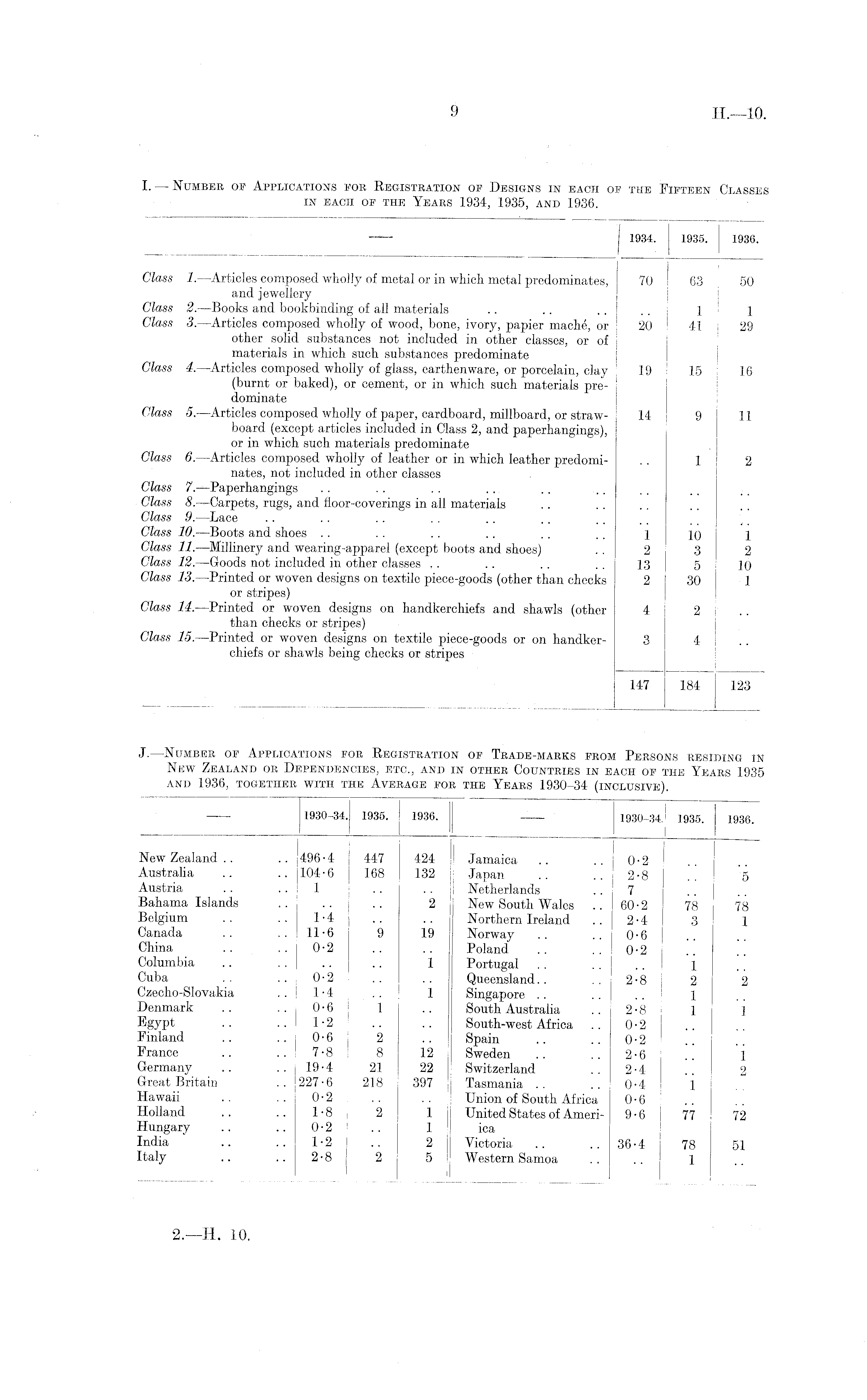 J.—Number of Applications for Registration of Trade-marks from Persons residing in New Zealand or Dependencies, etc., and in other Countries in each of the Years 1935 and 1936, together with the Average for the Years 1930-34 (inclusive).