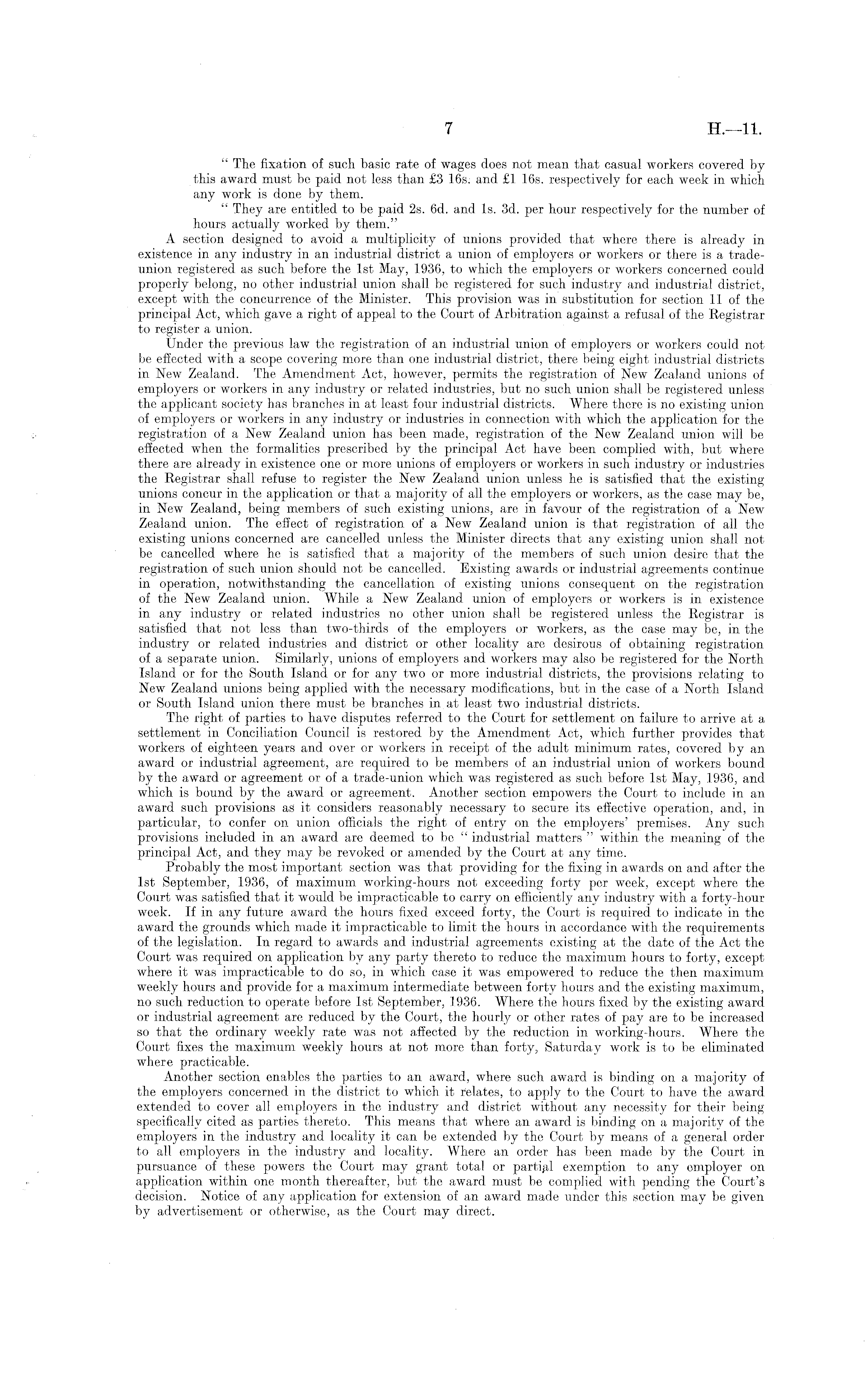 " The fixation of such basic rate of wages does not mean that casual workers covered by this award must be paid not less than £3 16s: and £1 16s. respectively for each week in which any work is done by them. " They are entitled to be paid 2s. 6d. and Is. 3d. per hour respectively for the number of hours actually worked by them." A section designed to avoid a multiplicity of unions provided that where there is already in existence in any industry in an industrial district a union of employers or workers or there is a tradeunion registered as such before the Ist May, 1936, to which the employers or workers concerned could properly belong, no other industrial union shall be registered for such industry and industrial district, except with the concurrence of the Minister. This provision was in substitution for section 11 of the principal Act, which gave a right of appeal to the Court of Arbitration against a refusal of the Registrar to register a union. Under the previous law the registration of an industrial union of employers or workers could not be effected with a scope covering more than one industrial district, there being eight industrial districts in New Zealand. The Amendment Act, however, permits the registration of New Zealand unions of employers or workers in any industry or related industries, but no such union shall be registered unless the applicant society has branches in at least four industrial districts. Where there is no existing union of employers or workers in any industry or industries in connection with which the application for the registration of a New Zealand union has been made, registration of the New Zealand union will be effected when the formalities prescribed by the principal Act have been complied with, but where there are already in existence one or more unions of employers or workers in such industry or industries the Registrar shall refuse to register the New Zealand union unless he is satisfied that the existing unions concur in the application or that a majority of all the employers or workers, as the case may be, in New Zealand, being members of such existing unions, are in favour of the registration of a New Zealand union. The effect of registration of a New Zealand union is that registration of all the existing unions concerned are cancelled unless the Minister directs that any existing union shall not be cancelled where he is satisfied that a majority of the members of such union desire that the registration of such union should not be cancelled. Existing awards or industrial agreements continue in operation, notwithstanding the cancellation of existing unions consequent on the registration of the New Zealand union. While a New Zealand union of employers or workers is in existence in any industry or related industries no other union shall be registered unless the Registrar is satisfied that not less than two-thirds of the employers or workers, as the case may be, in the industry or related industries and district or other locality are desirous of obtaining registration of a separate union. Similarly, unions of employers and workers may also be registered for the North Island or for the South Island or for any two or more industrial districts, the provisions relating to New Zealand unions being applied with the necessary modifications, but in the case of a North Island or South Island union there must be branches in at least two industrial districts. The right of parties to have disputes referred to the Court for settlement on failure to arrive at a settlement in Conciliation Council is restored by the Amendment Act, which further provides that workers of eighteen years and over or workers in receipt of the adult minimum rates, covered by an award or industrial agreement, are required to be members of an industrial union of workers bound by the award or agreement or of a trade-union which was registered as such before Ist May, 1936, and which is bound by the award or agreement. Another section empowers the Court to include in an award such provisions as it considers reasonably necessary to secure its effective operation, and, in particular, to confer on union officials the right of entry on the employers' premises. Any such provisions included in an award are deemed to be " industrial matters " within the meaning of the principal Act, and they may be revoked or amended by the Court at any time. Probably the most important section was that providing for the fixing in awards on and after the Ist September, 1936, of maximum working-hours not exceeding forty per week, except where the Court was satisfied that it would be impracticable to carry on efficiently any industry with a forty-hour week. If in any future award the hours fixed exceed forty, the Court is required to indicate in the award the grounds which made it impracticable to limit the hours in accordance with the requirements of the legislation. In regard to awards and industrial agreements existing at the date of the Act the Court was required on application by any party thereto to reduce the maximum hours to forty, except where it was impracticable to do so, in which case it was empowered to reduce the then maximum weekly hours and provide for a maximum intermediate between forty hours and the existing maximum, no such reduction to operate before Ist September, 1936. Where the hours fixed by the existing award or industrial agreement are reduced by the Court, the hourly or other rates of pay are to be increased so that the ordinary weekly rate was not affected by the reduction in working-hours. Where the Court fixes the maximum weekly hours at not more than forty, Saturday work is to be eliminated where practicable. Another section enables the parties to an award, where such award is binding on a majority of the employers concerned in the district to which it relates, to apply to the Court to have the award extended to cover all employers in the industry and district without any necessity fo