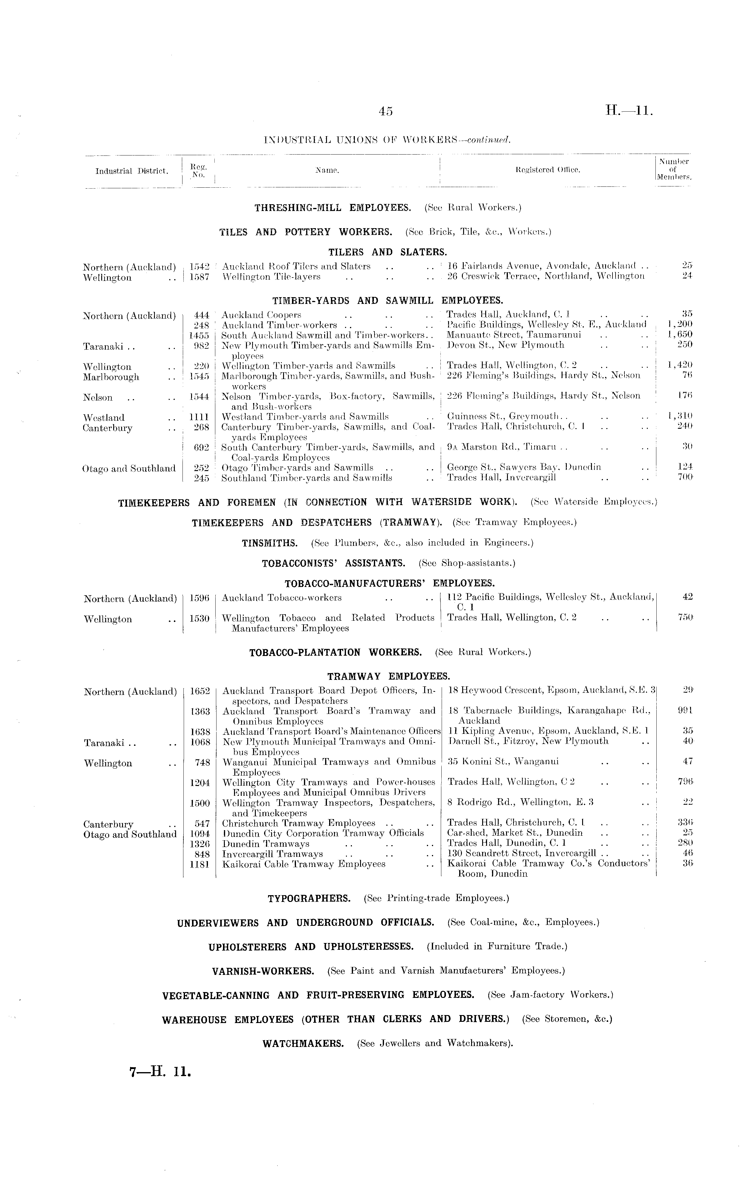 I j Number Industrial District. ; Name. Registered Office. of . iN0 - | j Members. THRESHING-MILL EMPLOYEES. (See Rural Workers.) TILES AND POTTERY WORKERS. (See Brick, Tile, &c., Workers.) TILERS AND SLATERS. Northern (Auckland) j 1542 ( Auckland Roof Tilers and Slaters .. .. 16 Fairlands Avenue, Avondale, Auckland .. j 25 Wellington .. | 1587 ; Wellington Tile-layers .. .. 26 Creswick Terrace, Northland, Wellington 24 TIMBER-YARDS AND SAWMILL EMPLOYEES. Northern (Auckland) 444 Auckland Coopers .. .. .. I Trades Hall, Auckland, C. 1 .. .. 35 248 Auckland Timber-workers .. .. .. Pacific Buildings, Wellesley St. E., Auckland 1,200 1455 South Auckland Sawmill and Timber-workers.. Manuaute Street, Taumarunui .. .. 1,650 Taranaki .. .. 982 New Plymouth Timber-yards and Sawmills Em- Devon St., New Plymouth .. .. 250 ployees Wellington .. 220 Wellington Timber-yards and Sawmills .. Trades Hall, Wellington, C. 2 .. .. 1,420 Marlborough .. 1545 Marlborough Timber-yards, Sawmills, and Bush- 226 Fleming's Buildings, Hardy St., Nelson 76 workers Nelson .. .. 1544 Nelson Timber-yards, Box-factory, Sawmills, 226 Fleming's Buildings, Hardy St., Nelson 176 and Bush-workers Westland .. 1111 Westland Timber-yards and Sawmills .. Guinness St., Greymouth.. .. .. 1,310 Canterbury .. 268 Canterbury Timber-yards, Sawmills, and Coal- Trades Hall, Christchurch, C. 1 .. . . 240 yards Employees 692 South Canterbury Timber-yards, Sawmills, and 9a Marston Rd., Timaru . . .. .. 30 Coal-yards Employees Otago and Southland 252 Otago Timber-yards and Sawmills .. .. George St., Sawyers Bay, Dunedin .. 124 245 Southland Timber-yards and Sawmills .. Trades Hall, Invercargill .. .. 700 TIMEKEEPERS AND FOREMEN (IN CONNECTION WITH WATERSIDE WORK). (See Waterside Employees.) TIMEKEEPERS AND DESPATCHERS (TRAMWAY). (See Tramway Employees.) TINSMITHS. (See Plumbers, &c„ also included in Engineers.) TOBACCONISTS' ASSISTANTS. (See Shop-assistants.) TOBACCO-MANUFACTURERS' EMPLOYEES. Northern (Auckland) 1596 Auckland Tobacco-workers .. 112 Pacific Buildings, Wellesley St., Auckland, 42 C. 1 Wellington .. 1530 Wellington Tobacco and Related Products Trades Hall, Wellington, C. 2 .. .. 750 Manufacturers' Employees TOBACCO-PLANTATION WORKERS. (See Rural Workers.) TRAMWAY EMPLOYEES. Northern (Auckland) 1652 Auckland Transport Board Depot Officers, In- 18 Heywood Crescent, Epsom, Auckland, S.E. 3 29 spectors, and Despatchers 1363 Auckland Transport Board's Tramway and 18 Tabernacle Buildings, Karangahape Rd., 991 Omnibus Employees Auckland 1638 Auckland Transport Board's Maintenance Officers 11 Kipling Avenue, Epsom, Auckland, S.E. 1 35 Taranaki .. .. 1068 New Plymouth Municipal Tramways and Omni- Darnell St., Fitzroy, New Plymouth .. 40 bus Employees Wellington .. 748 Wanganui Municipal Tramways and Omnibus 35 Konini St., Wanganui .. .. 47 Employees 1204 Wellington City Tramways and Power-houses Trades Hall, Wellington, C 2 .. .. 796 Employees and Municipal Omnibus Drivers 1500 Wellington Tramway Inspectors, Despatchers, 8 Rodrigo Rd., Wellington, E. 3 .. j 22. and Timekeepers Canterbury .. 547 Christchurch Tramway Employees .. .. Trades Hall, Christchurch, C. 1 .. .. 336 Otago and Southland 1094 Dunedin City Corporation Tramway Officials Car-shed, Market St., Dunedin .. .. 25 1326 Dunedin Tramways .. .. .. Trades Hall, Dunedin, C. 1 .. . . 280 848 Invercargill Tramways .. .. .. 130 Scandrett Street, Invercargill .. .. 46 1181 Kaikorai Cable Tramway Employees .. Kaikorai Cable Tramway Co.'s Conductors' 36 Room, Dunedin TYPOGRAPHERS. (See Printing-trade Employees.) UNDERVIEWERS AND UNDERGROUND OFFICIALS. (See Coal-mine, &c., Employees.) UPHOLSTERERS AND UPHOLSTERESSES. (Included in Furniture Trade.) VARNISH-WORKERS. (See Paint and Varnish Manufacturers' Employees.) VEGETABLE-CANNING AND FRUIT-PRESERVING EMPLOYEES. (See Jam-factory Workers.) WAREHOUSE EMPLOYEES (OTHER THAN CLERKS AND DRIVERS.) (See Storemen, &c.) WATCHMAKERS. (See Jewellers and Watchmakers).