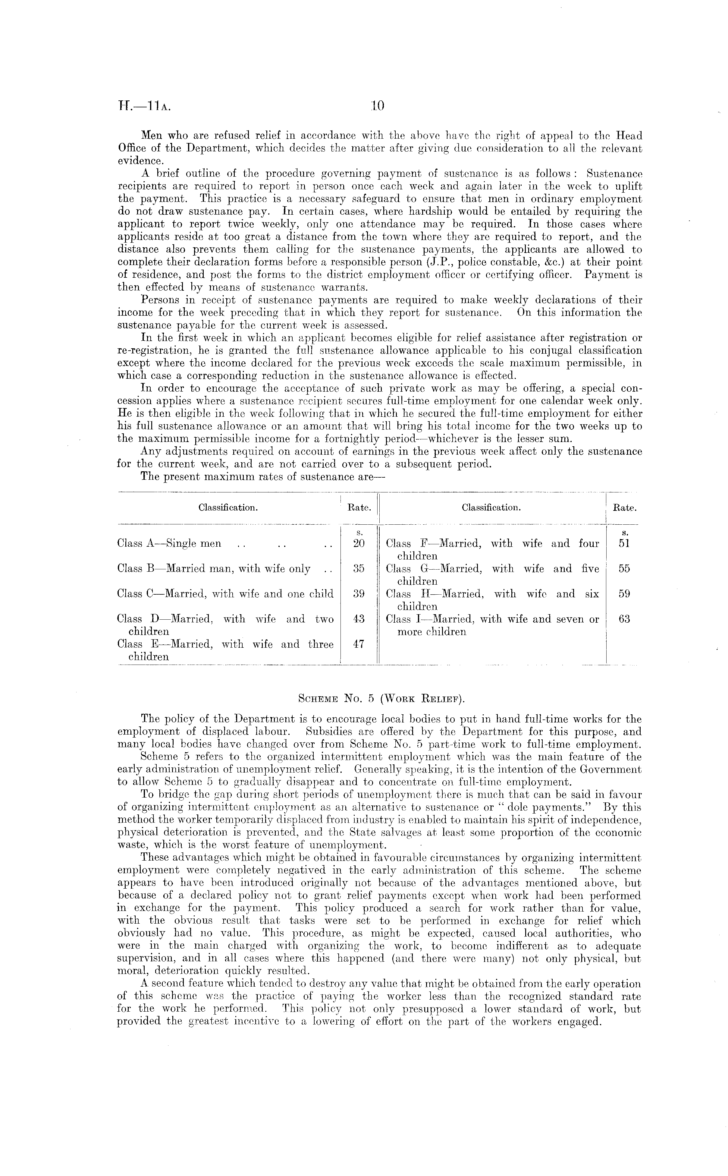 Scheme No. 5 (Work Relief). The policy of the Department is to encourage local bodies to put in hand full-time works for the employment of displaced labour. Subsidies are offered by the Department for this purpose, and many local bodies have changed over from Scheme No. 5 part-time work to full-time employment. Scheme 5 refers to the organized intermittent employment which was the main feature of the early administration of unemployment relief. Generally speaking, it is the intention of the Government to allow Scheme 5 to gradually disappear and to concentrate on full-time employment. To bridge the gap during short periods of unemployment there is much that can be said in favour of organizing intermittent employment as an alternative to sustenance or " dole payments." By this method the worker temporarily displaced from industry is enabled to maintain his spirit of independence, physical deterioration is prevented, and the State salvages at least some proportion of the economic waste, which is the worst feature of unemployment. These advantages which might be obtained in favourable circumstances by organizing intermittent employment were completely negatived in the early administration of this scheme. The scheme appears to have been introduced originally not because of the advantages mentioned above, but because of a declared policy not to grant relief payments except when work had been performed in exchange for the payment. This policy produced a search for work rather than for value, with the obvious result that tasks were set to be performed in exchange for relief which obviously had no value. This procedure, as might be expected, caused local authorities, who were in the main charged with organizing the work, to become indifferent as to adequate supervision, and in all cases where this happened (and there were many) not only physical, but moral, deterioration quickly resulted. A second feature which tended to destroy any value that might be obtained from the early operation of this scheme was the practice of paying the worker less than the recognized standard rate for the work he performed. This policy not only presupposed a lower standard of work, but provided the greatest incentive to a lowering of effort on the part of the workers engaged.