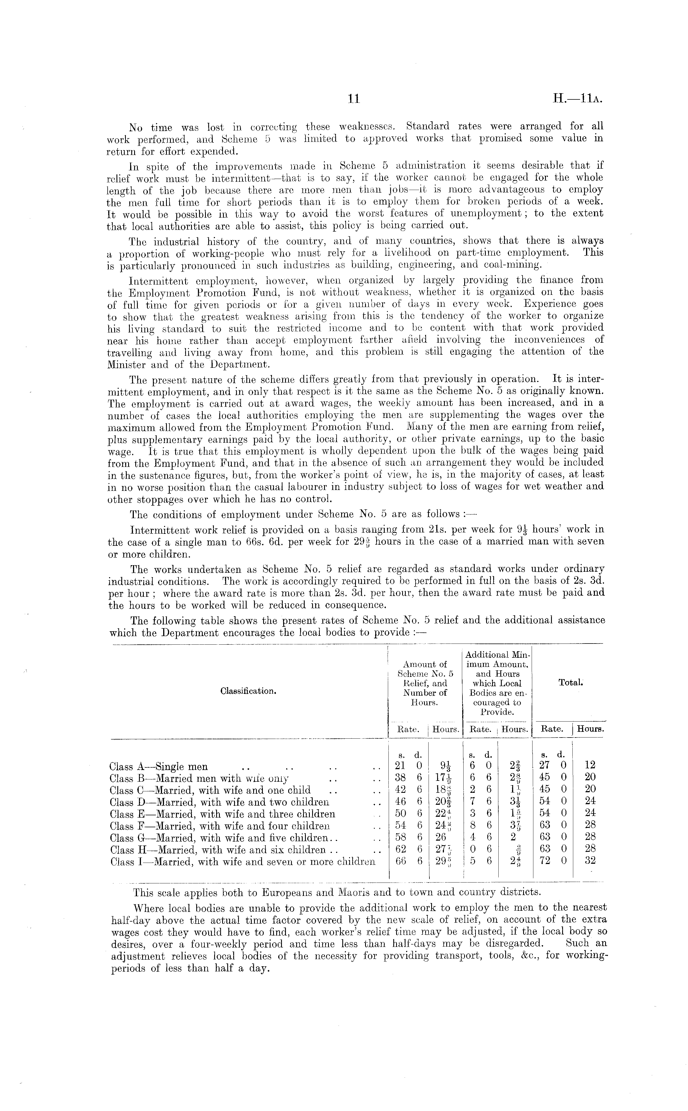No time was lost in correcting these weaknesses. Standard rates were arranged for all work performed, and Scheme 5 was limited to approved works that promised some value in return for effort expended. In spite of the improvements made in Scheme 5 administration it seems desirable that if relief work must be intermittent —that is to say, if the worker cannot be engaged for the whole length of the job because there are more men than jobs—it is more advantageous to employ the men full time for short periods than it is to employ them for broken periods of a week. It would be possible in this way to avoid the worst features of unemployment; to the extent that local authorities are able to assist, this policy is being carried out. The industrial history of the country, and of many countries, shows that there is always a proportion of working-people who must rely for a livelihood on part-time employment. This is particularly pronounced in such industries as building, engineering, and coal-mining. Intermittent employment, however, when organized by largely providing the finance from the Employment Promotion Fund, is not without weakness, whether it is organized on the basis of full time for given periods or for a given number of days in every week. Experience goes to show that the greatest weakness arising from this is the tendency of the worker to organize his living standard to suit the restricted income and to be content with that work provided near his home rather than accept employment farther afield involving the inconveniences of travelling and living away from home, and this problem is still engaging the attention of the Minister and of the Department. The present nature of the scheme differs greatly from that previously in operation. It is intermittent employment, and in only that respect is it the same as the Scheme No. 5 as originally known. The employment is carried out at award wages, the weekly amount has been increased, and in a number of cases the local authorities employing the men are supplementing the wages over the maximum allowed from the Employment Promotion Fund. Many of the men are earning from relief, plus supplementary earnings paid by the local authority, or other private earnings, up to the basic wage. It is true that this employment is wholly dependent upon the bulk of the wages being paid from the Employment Fund, and that in the absence of such an arrangement they would be included in the sustenance figures, but, from the worker's point of view, he is, in the majority of cases, at least in no worse position than the casual labourer in industry subject to loss of wages for wet weather and other stoppages over which he has no control. The conditions of employment under Scheme No. 5 are as follows : — Intermittent work relief is provided on a basis ranging from 21s. per week for hours' work in the case of a single man to 665. 6d. per week for 29 f hours in the case of a married man with seven or more children. The works undertaken as Scheme No. 5 relief are regarded as standard works under ordinary industrial conditions. The work is accordingly required to be performed in full on the basis of 2s. 3d. per hour ; where the award rate is more than 2s. 3d. per hour, then the award rate must be paid and the hours to be worked will be reduced in consequence. The following table shows the present rates of Scheme No. 5 relief and the additional assistance which the Department encourages the local bodies to provide : —