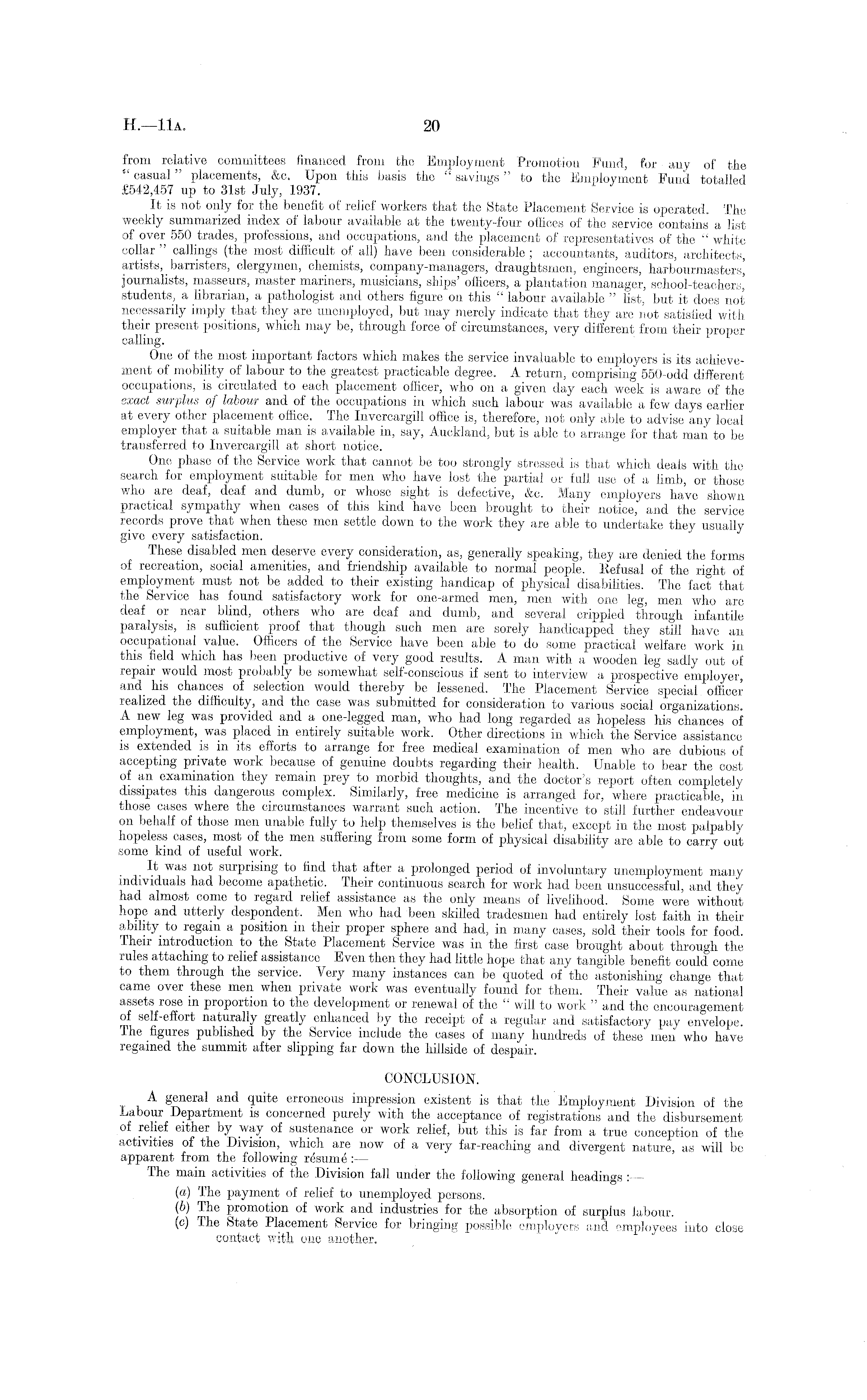 from relative committees financed from the Employment Promotion Fund, for any of the " casual" placements, &c. Upon this basis the " savings "to the Employment Fund totalled £542,457 up to 31st July, 1937. It is not only for the benefit of relief workers that the State Placement Service is operated. The weekly summarized index of labour available at the twenty-four offices of the service contains a list of over 550 trades, professions, and occupations, and the placement of representatives of the " white collar " callings (the most difficult of all) have been considerable ; accountants, auditors, architects, artists, barristers, clergymen, chemists, company-managers, draughtsmen, engineers, harbourmasters, journalists, masseurs, master mariners, musicians, ships' officers, a plantation manager, school-teachers' students, a librarian, a pathologist and others figure on this " labour available " list, but it does not necessarily imply that they are unemployed, but may merely indicate that they are not satisfied with their present positions, which may be, through force of circumstances, very different from their proper calling. One of the most important factors which makes the service invaluable to employers is its achievement of mobility of labour to the greatest practicable degree. A return, comprising 550-odd different occupations, is circulated to each placement officer, who on a given day each week is aware of the exact surplus of labour and of the occupations in which such labour was available a few days earlier at every other placement office. The Invercargill office is, therefore, not only able to advise any local employer that a suitable man is available in, say, Auckland, but is able to arrange for that man to be transferred to Invercargill at short notice. One phase of the Service work that cannot be too strongly stressed is that which deals with the search for employment suitable for men who have lost the partial or full use of a limb, or those who are deaf, deaf and dumb, or whose sight is defective, &c. Many employers have shown practical sympathy when cases of this kind have been brought to their notice, and the service records prove that when these men settle down to the work they are able to undertake they usually give every satisfaction. These disabled men deserve every consideration, as, generally speaking, they are denied the forms of recreation, social amenities, and friendship available to normal people. Refusal of the right of employment must not be added to their existing handicap of physical disabilities. The fact that the Service has found satisfactory work for one-armed men, men with one leg, men who are deaf or near blind, others who are deaf and dumb, and several crippled through infantile paralysis, is sufficient proof that though such men are sorely handicapped they still have an occupational value. Officers of the Service have been able to do some practical welfare work in this field which has been productive of very good results. A man with a wooden leg sadly out of repair would most probably be somewhat self-conscious if sent to interview a prospective employer, and his chances of selection would thereby be lessened. The Placement Service special officer realized the difficulty, and the case was submitted for consideration to various social organizations. A new leg was provided and a one-legged man, who had long regarded as hopeless his chances of employment, was placed in entirely suitable work. Other directions in which the Service assistance is extended is in its efforts to arrange for free medical examination of men who are dubious of accepting private work because of genuine doubts regarding their health. Unable to bear the cost of an examination they remain prey to morbid thoughts, and the doctor's report often completely dissipates this dangerous complex. Similarly, free medicine is arranged for, where practicable, in those cases where the circumstances warrant such action. The incentive to still further endeavour on behalf of those men unable fully to help themselves is the belief that, except in the most palpably hopeless cases, most of the men suffering from some form of physical disability are able to carry out some kind of useful work. It was not surprising to find that after a prolonged period of involuntary unemployment many individuals had become apathetic. Their continuous search for work had been unsuccessful, and they had almost come to regard relief assistance as the only means of livelihood. Some were without hope and utterly despondent. Men who had been skilled tradesmen had entirely lost faith in their ability to regain a position in their proper sphere and had, in many cases, sold their tools for food. Their introduction to the State Placement Service was in the first case brought about through the rules attaching to relief assistance Even then they had little hope that any tangible benefit could come to them through the service. Yery many instances can be quoted of the astonishing change that came over these men when private work was eventually found for them. Their value as national assets rose in proportion to the development or renewal of the " will to work " and the encouragement of self-effort naturally greatly enhanced by the receipt of a regular and satisfactory pay envelope. The figures published by the Service include the cases of many hundreds of these men who have regained the summit after slipping far down the hillside of despair. CONCLUSION. A general and quite erroneous impression existent is that the Employment Division of the Labour Department is concerned purely with the acceptance of registrations and the disbursement of relief either by way of sustenance or work relief, but this is far from a true conception of the activities of the Division, which are now of a very far-reaching and divergent nature, as will be apparent from the following resume:— The main activities of the Division fall under the following gener