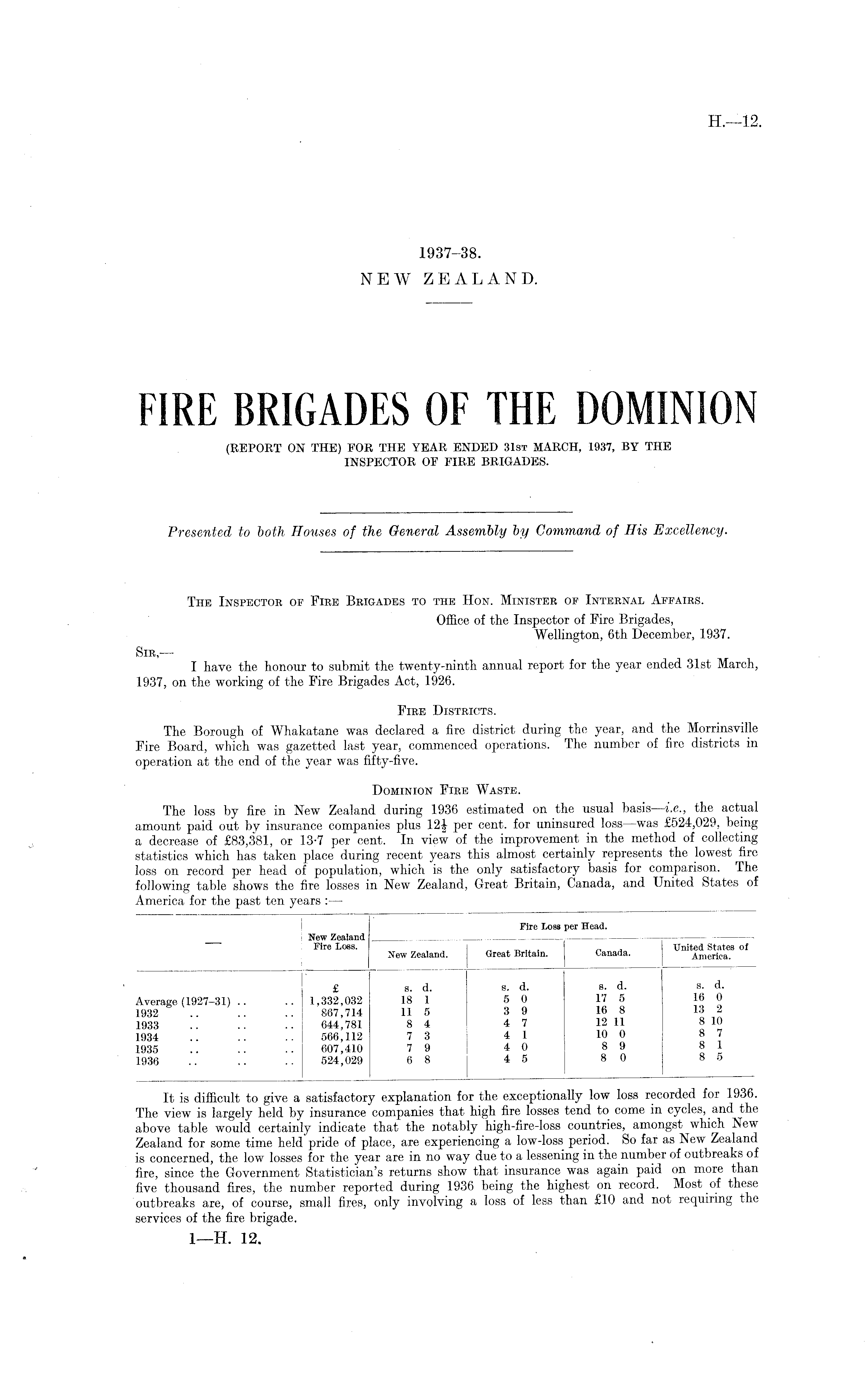 The Inspector of Fire Brigades to the Hon. Minister of Internal Affairs. Office of the Inspector of Fire Brigades, Wellington, 6th December, 1937. Sir, — I have the honour to submit the twenty-ninth annual report for the year ended 31st March, 1937, on the working of the Fire Brigades Act, 1926. Fire Districts. The Borough of Whakatane was declared a fire district during the year, and the Morrinsville Fire Board, which was gazetted last year, commenced operations. The number of fire districts in operation at the end of the year was fifty-five. Dominion Fire Waste. The loss by fire in New Zealand during 1936 estimated on the usual basis —i.e., the actual amount paid out by insurance companies plus 12§ per cent, for uninsured loss —was £524,029, being a decrease of £83,381, or 13-7 per cent. In view of the improvement in the method of collecting statistics which has taken place during recent years this almost certainly represents the lowest fire loss on record per head of population, which is the only satisfactory basis for comparison. The following table shows the fire losses in New Zealand, Great Britain, Canada, and United States of America for the past ten years : —