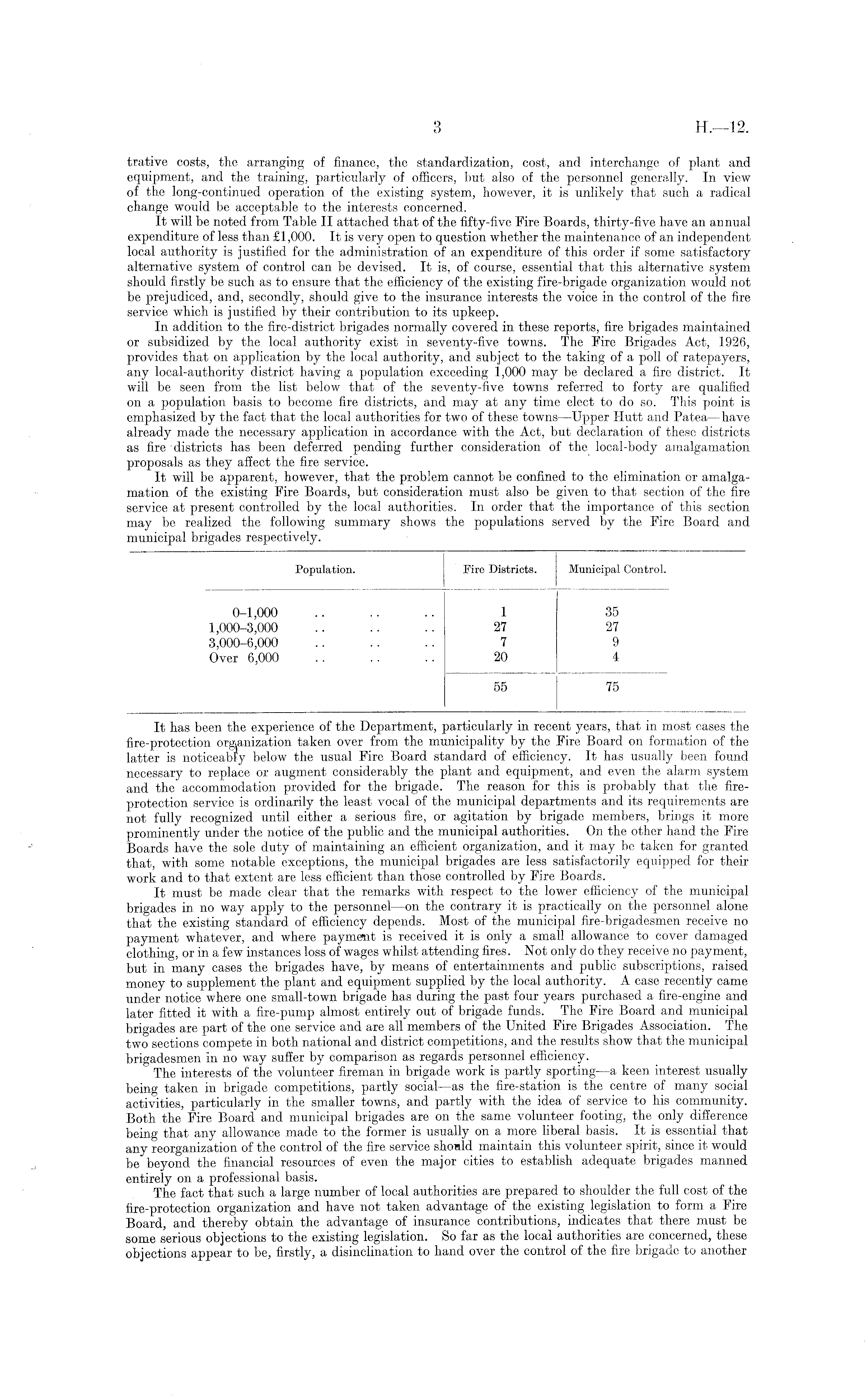 trative costs, the arranging of finance, the standardization, cost, and interchange of plant and equipment, and the training, particularly of officers, but also of the personnel generally. In view of the long-continued operation of the existing system, however, it is unlikely that such a radical change would be acceptable to the interests concerned. It will be noted from Table II attached that of the fifty-five Fire Boards, thirty-five have an annual expenditure of less than £1,000. It is very open to question whether the maintenance of an independent local authority is justified for the administration of an expenditure of this order if some satisfactory alternative system of control can be devised. It is, of course, essential that this alternative system should firstly be such as to ensure that the efficiency of the existing fire-brigade organization would not be prejudiced, and, secondly, should give to the insurance interests the voice in the control of the fire service which is justified by their contribution to its upkeep. In addition to the fire-district brigades normally covered in these reports, fire brigades maintained or subsidized by the local authority exist in seventy-five towns. The Fire Brigades Act, 1926, provides that on application by the local authority, and subject to the taking of a poll of ratepayers, any local-authority district having a population exceeding 1,000 may be declared a fire district. It will be seen from the list below that of the seventy-five towns referred to forty are qualified on a population basis to become fire districts, and may at any time elect to do so. This point is emphasized by the fact that the local authorities for two of these towns —Upper Hutt and Patea —have already made the necessary application in accordance with the Act, but declaration of these districts as fire districts has been deferred pending further consideration of the local-body amalgamation proposals as they affect the fire service. It will be apparent, however, that the problem cannot be confined to the elimination or amalgamation of the existing Fire Boards, but consideration must also be given to that section of the fire service at present controlled by the local authorities. In order that the importance of this section may be realized the following summary shows the populations served by the Fire Board and municipal brigades respectively.