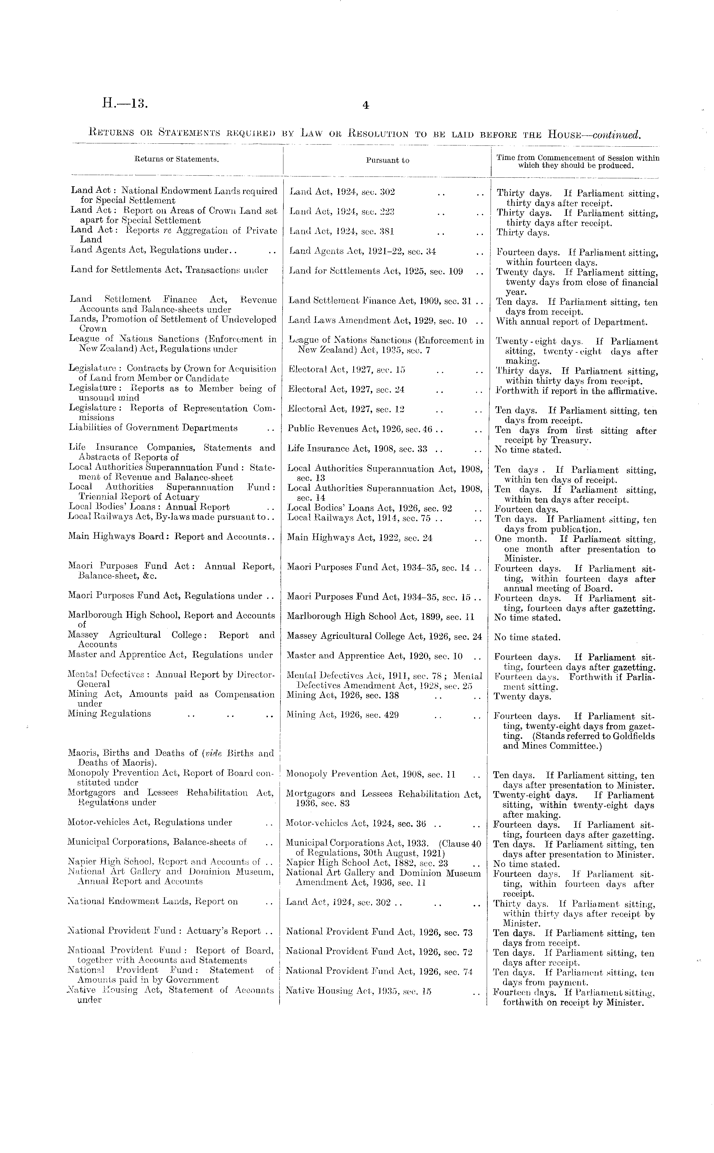 Returns or Statements. Pursuant to Time from Commencement of Session within which they should he produced. Land Act: National Endowment Lands required Land Act, 1924, sec. 302 .. .. Thirty days. If Parliament sitting, for Special Settlement thirty days after receipt. Land Act: Report 011 Areas of Crown Land set Land Act, 1924, sec. 223 .. .. Thirty days. If Parliament sitting, apart for Special Settlement thirty days after receipt. Land Act: Reports re Aggregation of Private Land Act, 1924, sec. 381 .. .. Thirty days. Land Land Agents Act, Regulations under.. .. Land Agents Act, 1921—22, sec. 34 .. Fourteen days. If Parliament sitting, within fourteen days. Land for Settlements Act, Transactions under Land for Settlements Act, 1925, sec. 109 .. Twenty days. If Parliament sitting, twenty days from close of financial year. Land Settlement -Finance Act, Revenue Land Settlement Finance Act, 1909, sec. 31 .. Ten days. If Parliament sitting, ten Accounts and Balance-sheets under days from receipt. Lands, Promotion of Settlement of Undeveloped Land Laws Amendment Act, 1929, see. 10 .. With annual report of Department. Grown League of Nations Sanctions (Enforcement in League of Nations Sanctions (Enforcement in Twenty - eight days. If Parliament New Zealand) Act, Regulations under New Zealand) Act, 1935, sec. 7 sitting, twenty - eight days after making. Legislature : Contracts by Crown for Acquisition Electoral Act, 1927, sec. 15 .. .. Thirty days. If Parliament sitting, of Land from Member or Candidate within thirty days from receipt. Legislature : Reports as to Member being of Electoral Act, 1927, sec. 24 .. . . Forthwith if report in the affirmative, unsound mind Legislature : Reports of Representation Com- Electoral Act, 1927, sec. 12 .. .. Ten days. If Parliament sitting, ten missions days from receipt. Liabilities of Government Departments .. Public Revenues Act, 1926, sec. 46 .. .. Ten days from lirst sitting after receipt by Treasury. Lite Insurance Companies, Statements and Life Insurance Act, 1908, sec. 33 .. No time stated. Abstracts of Reports of Local Authorities Superannuation Fund : State- Local Authorities Superannuation Act, 1908, Ten days . If Parliament sitting, ment of Revenue and Balance-sheet sec. 13 within ten days of receipt. Local Authorities Superannuation Fund: Local Authorities Superannuation Act, 1908, Ten days. If" Parliament sitting, Triennial Report of Actuary sec. 14 within ten days after receipt. Local Bodies Loans : Annual Report .. Local Bodies' Loans Act, 1926, sec. 92 .. .Fourteen days. Local Railways Act, By-laws made pursuant to.. Local Railways Act, 1914, sec. 75 .. .. Ten days. If Parliament sitting, ten . days from publication. Main Highways Board: Report and Accounts.. Main Highways Act, 1922, sec. 24 .. One month. If Parliament sitting, one month after presentation to Minister. Maori Purposes Fund Act: Annual Report, Maori Purposes Fund Act, 1934-35, sec. 14 .. Fourteen days. If Parliament sit-Balance-sheet, &c. ting, within fourteen days after annual meeting of Board. Maori Purposes Fund Act, Regulations under .. Maori Purposes Fund Act, 1934-35, sec. 15 .. Fourteen days. If Parliament sitT . ting, fourteen days after gazetting. Marlborough High School, Report and Accounts Marlborough High School Act, 1899, sec. 11 No time stated. of Massey Agricultural College : Report and Massey Agricultural College Act, 1926, sec. 24 No time stated. Accounts Master and Apprentice Act, Regulations under Master and Apprentice Act, 1920, sec. 10 .. Fourteen days. If Parliament sitting, fourteen days after gazetting. Mental Defectives : Annual Report by Director- Mental Defectives Act, 1911, sec. 78 ; Mental Fourteen days. Forthwith if ParliaGetieral Defectives Amendment Act, 1928, sec. 25 ment sitting. Mining Act, Amounts paid as Compensation Mining Act, 1926, sec. 138 .. .. Twenty days. under Mining Regulations .. .. .. Mining Act, 1926, sec. 429 .. .. Fourteen days. If Parliament sitting, twenty-eight days from gazetting. (Stands referred to Goldfields . „ and Mines Committee.) Maoris, Births and Deaths of (vide Births and Deaths of Maoris). Monopoly Prevention Act, Report of Board con- Monopoly Prevention Act, 1908, sec. 11 .. Ten days. If Parliament sitting, ten stituted under .... days after presentation to Minister. Mortgagors and Lessees Rehabilitation Act, Mortgagors and Lessees Rehabilitation Act, Twenty-eight days. If Parliament Regulations under 1936, sec. 83 sitting, within twenty-eight days after making. Motor-vehicles Act, Regulations under .. Motor-vehicles Act, 1924, sec. 36 .. .. Fourteen days. If Parliament sitting, fourteen days after gazetting. Municipal Corporations, Balance-sheets of .. Municipal Corporations Aet, 1933. (Clause 40 Ten days. If Parliament sitting, ten of Regulations, 30th August, 1921) days after presentation to Minister. Napier Hign School, Report and Accounts of . . Napier High School Act, 1882, sec. 23 .. No time stated. National Art Gallery and Dominion Museum, National Art Gallery and Dominion Museum Fourteen days. If Parliament sitAnnual Report and Accounts Amendment Act, 1936, sec. 11 ting, within fourteen days after receipt. National Endowment Lands, Report on .. Land Act, 1924, sec. 302 .. .. .. Thirty days. If Parliament sitting, within thirty days after receipt by Minister. National Provident Eund : Actuary's Report .. National Provident Fund Act, 1926, sec. 73 Ten days. If Parliament sitting, ten days from receipt. National Provident Fund : Report of Board, National Provident Eund Act, 1926, sec. 72 Ten days. If Parliament sitting, ten together with Accounts and Statements days after receipt. National Provident Fund: Statement of National Provident Eund Act, 1926, sec. 74 Ten days. If Parliament sitting, ten Amounts paid in by Government days'from payment. Native Housing Act, Statement of Accounts Native Housing Act, 1935, sec. 15 .. Fourteen days. If Parliament sitting, under forthwith on receipt by Minister.