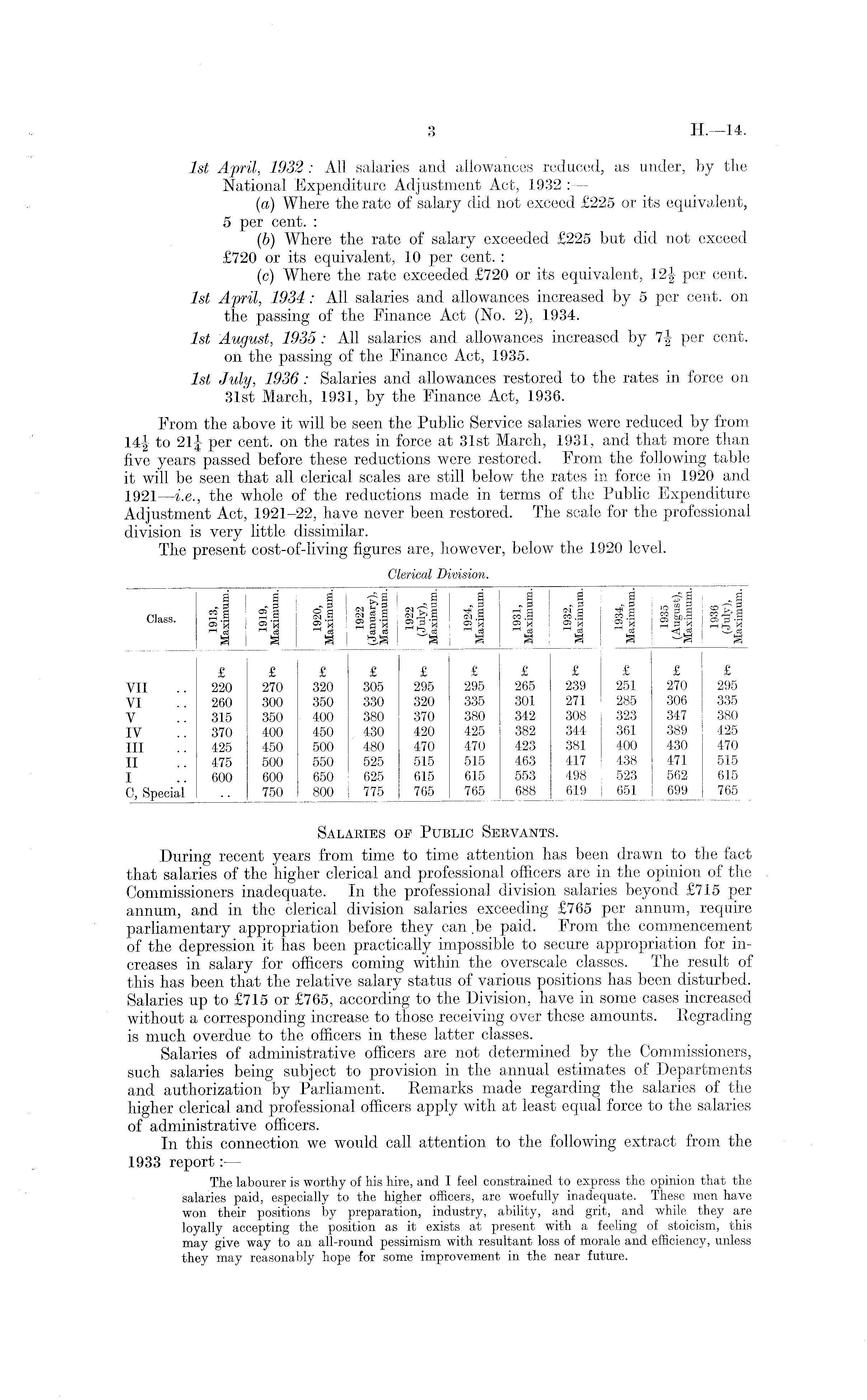 Ist April, 1932 : All salaries and allowances reduced, as under, by the National Expenditure Adjustment Act, 1932 : — (а) Where the rate of salary did not exceed £225 or its equivalent, 5 per cent. : (б) Where the rate of salary exceeded £225 but did not exceed £720 or its equivalent, 10 per cent. : (c) Where the rate exceeded £720 or its equivalent, 12| per cent. Ist April, 1934 : All salaries and allowances increased by 5 per cent, on the passing of the Finance Act (No. 2), 1934. Ist August, 1935 : All salaries and allowances increased by 7-| per cent, on the passing of the Finance Act, 1935. Ist July, 1936: Salaries and allowances restored to the rates in force on 31st March, 1931, by the Finance Act, 1936. From the above it will be seen the Public Service salaries were reduced by from 14| to 21] per cent, on the rates in force at 31st March, 1931, and that more than five years passed before these reductions were restored. From the following table it will be seen that all clerical scales are still below the rates in force in 1920 and 1921 —i.e., the whole of the reductions made in terms of the Public Expenditure Adjustment Act, 1921-22, have never been restored. The scale for the professional division is very little dissimilar. The present cost-of-living figures are, however, below the 1920 level.