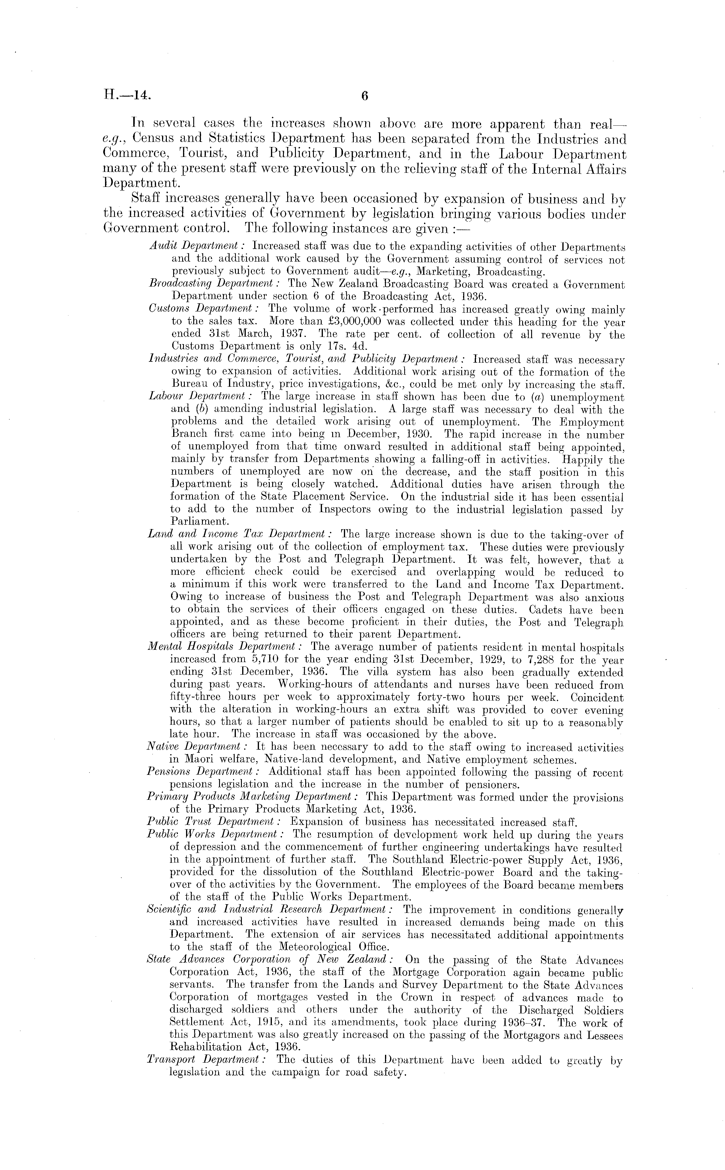 In several cases the increases shown above are more apparent than real— e.g., Census and Statistics Department has been separated from the Industries and Commerce, Tourist, and Publicity Department, and in the Labour Department many of the present staff were previously on the relieving staff of the Internal Affairs Department. Staff increases generally have been occasioned by expansion of business and by the increased activities of Government by legislation bringing various bodies under Government control. The following instances are given : — Audit Department: Increased staff was due to the expanding activities of other Departments and the additional work caused by the Government assuming control of services not previously subject to Government audit —e.g., Marketing, Broadcasting. Broadcasting Department: The New Zealand Broadcasting Board was created a Government Department under section 6 of the Broadcasting Act, 1936. Customs Department: The volume of work• performed has increased greatly owing mainly to the sales tax. More than £3,000,000 was collected under this heading for the year ended 31st March, 1937. The rate per cent, of collection of all revenue by the Customs Department is only 17s. 4d. Industries and Commerce, Tourist, and Publicity Department: Increased stafi was necessary owing to expansion of activities. Additional work arising out of the formation of the Bureau of Industry, price investigations, &c., could be met only by increasing the stafi. Labour Department: The large increase in stafi shown has been due to (a) unemployment and (b) amending industrial legislation. A large staff was necessary to deal with the problems and the detailed work arising out of unemployment. The Employment Branch first came into being m December, 1930. The rapid increase in the number of unemployed from that time onward resulted in additional staff being appointed, mainly by transfer from Departments showing a falling-off in activities. Happily the numbers of unemployed are now oh the decrease, and the staff position in this Department is being closely watched. Additional duties have arisen through the formation of the State Placement Service. On the industrial side it has been essential to add to the number of Inspectors owing to the industrial legislation passed by Parliament. Land and Income Tax Department: The large increase shown is due to the taking-over of all work arising out of the collection of employment tax. These duties were previously undertaken by the Post and Telegraph Department. It was felt, however, that a more efficient check could be exercised and overlapping would be reduced to a minimum if this work were transferred to the Land and Income Tax Department. Owing to increase of business the Post and Telegraph Department was also anxious to obtain the services of their officers engaged on these duties. Cadets have been appointed, and as these become proficient in their duties, the Post and Telegraph officers are being returned to their parent Department. Mental Hospitals Department: The average number of patients resident in mental hospitals increased from 5,710 for the year ending 31st December, 1929, to 7,288 for the year ending 31st December, 1936. The villa system has also been gradually extended during past years. Working-hours of attendants and nurses have been reduced from fifty-three hours per week to approximately forty-two hours per week. Coincident with the alteration in working-hours an extra shift was provided to cover evening hours, so that a larger number of patients should be enabled to sit up to a reasonably late hour. The increase in staff was occasioned by the above. Native Department: It has been necessary to add to the staff owing to increased activities in Maori welfare, Native-land development, and Native employment schemes. Pensions Department: Additional staff has been appointed following the passing of recent pensions legislation and the increase in the number of pensioners. Primary Products Marketing Department: This Department was formed under the provisions of the Primary Products Marketing Act, 1936. Public Trust Department: Expansion of business has necessitated increased staff. Public Works Department: The resumption of development work held up during the years of depression and the commencement of further engineering undertakings have resulted in the appointment of further stafi. The Southland Electric-power Supply Act, 1936, provided for the dissolution of the Southland Electric-power Board and the takingover of the activities by the Government. The employees of the Board became members of the staff of the Public Works Department. Scientific and Industrial Research Department: The improvement in conditions generally and increased activities have resulted in increased demands being made on this Department. The extension of air services has necessitated additional appointments to the staff of the Meteorological Office. State Advances Corporation of New Zealand: On the passing of the State Advances Corporation Act, 1936, the stafi of the Mortgage Corporation again became public servants. The transfer from the Lands and Survey Department to the State Advances Corporation of mortgages vested in the Crown in respect of advances made to discharged soldiers and others under the authority of the Discharged Soldiers Settlement Act, 1915, and its amendments, took place during 1936-37. The work of this Department was also greatly increased on the passing of the Mortgagors and Lessees Rehabilitation Act, 1936. Transport Department: The duties of this Department have been added to greatly by legislation and the campaign for road safety.