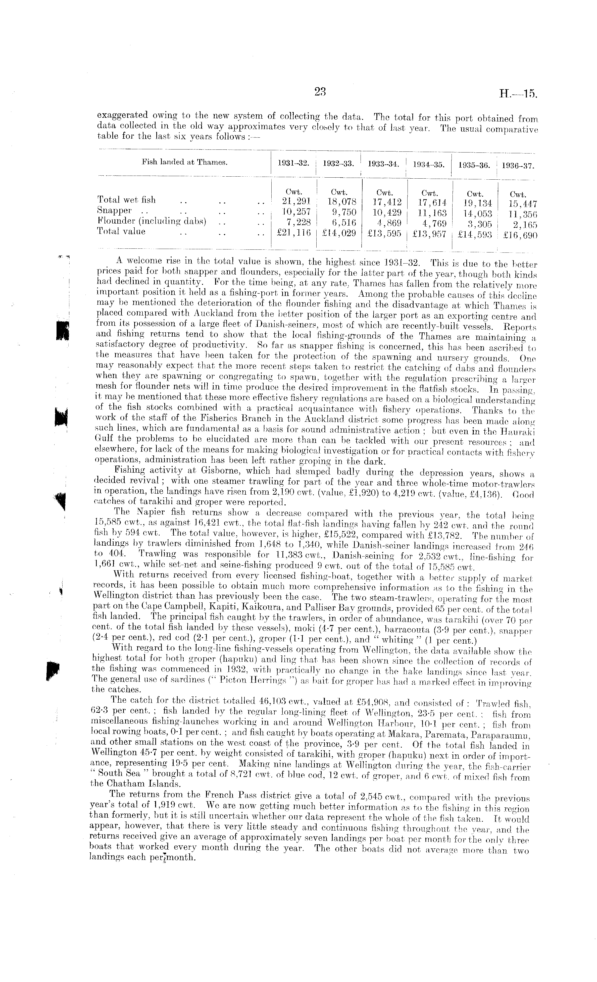 Fish landed at Thames. 1931-32. | 1932-33. I 1933-34. I 1934-35. 1935-36. ! 1936-37. Cwt. Cwt. Cwt. Cwt. Cwt. Cwt. Total wet fish 21,291 18,078 17,412 17,614 19,134 15 447 Snapper 10,257 9,750 10,429 11,163 14,053 11'356 Flounder (including dabs) .. .. 7,228 6,516 4,869 4,769 3 305 2'165 Total value £21,116 £14,029 £13,595 £13,957 £14,'593 £16^690
