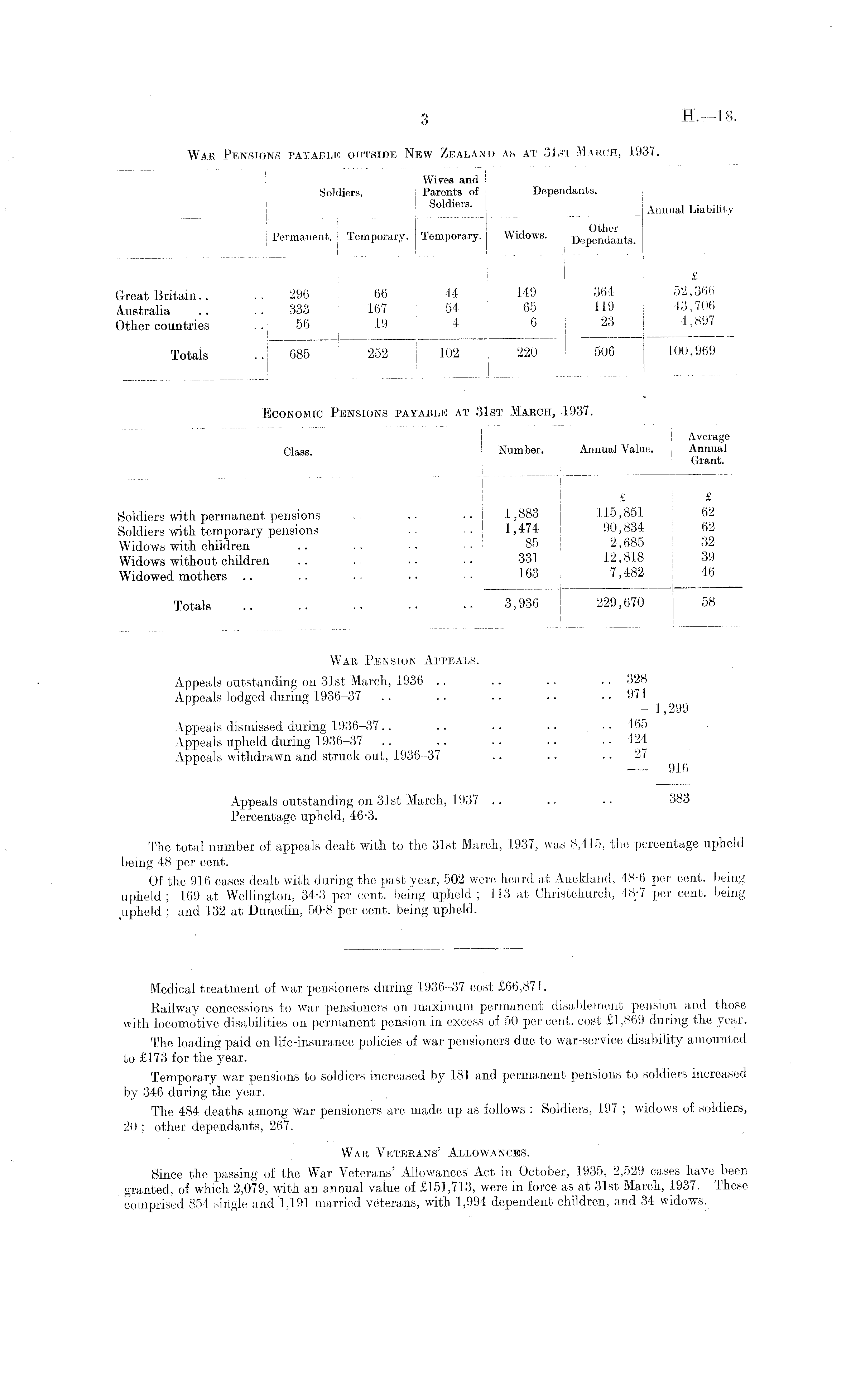 Medical treatment of war pensioners during 1936-37 cost £66,87 J. Railway concessions to war pensioners on maximum permanent disablement pension and those with locomotive disabilities on permanent pension in excess of 50 per cent, cost £1,869 during the year. The loading paid on life-insurance policies of war pensioners due to war-service disability amounted to £173 for the year. Temporary war pensions to soldiers increased by 181 and permanent pensions to soldiers increased by 346 during the year. The 484 deaths among war pensioners are made up as follows : Soldiers, 197 ; widows of soldiers, 20 ; other dependants, 267. War Veterans' Allowances. Since the passing of the War Veterans' Allowances Act in October, 1935, 2,529 cases have been granted, of which 2,079, with an annual vaiue of £151,713, were in force as at 31st March, 1937. These comprised 854 single and 1,191 married veterans, with 1,994 dependent children, and 34 widows.