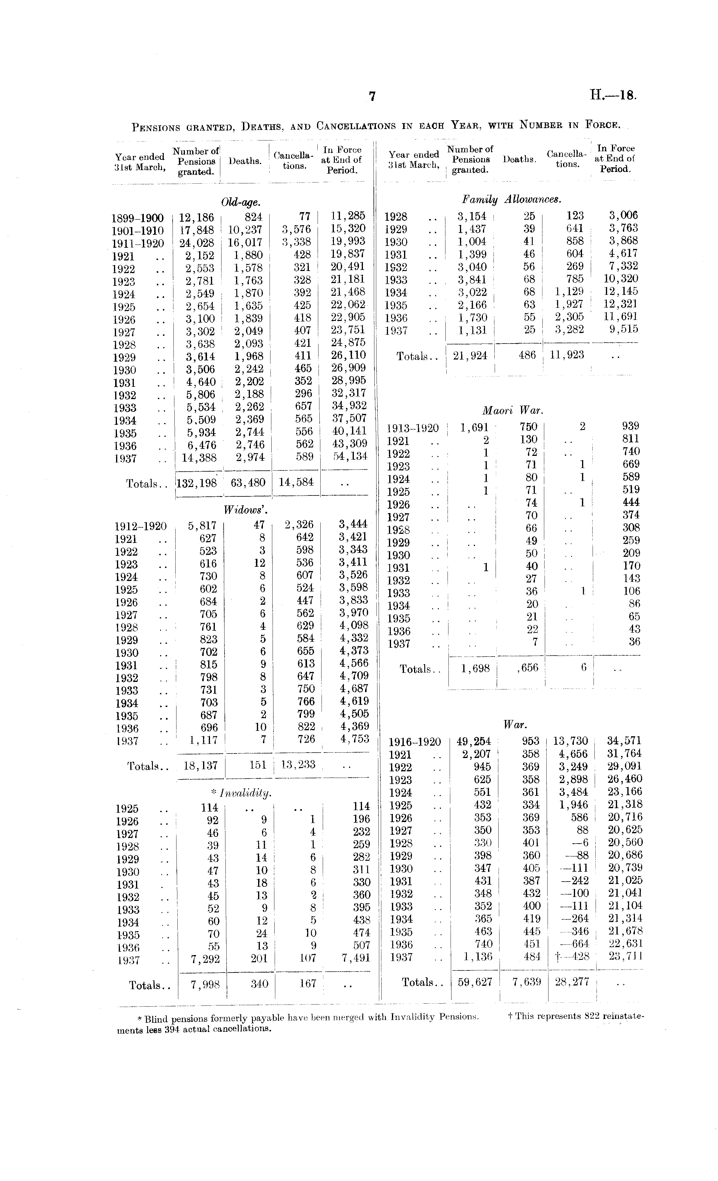 Number of ' „ „ In Force „ , , Number of ,, , n In Force ■ī, e t T f Pensions Deaths. Ca,^ a ' at End of Pensions Deaths - tions at End » f 31st March, granted _ | tions. Period dlst Marcn, granted n°ns. period Old-age. Family Allowances. 1899-1900 12,186 824 77 | 11,285 1928 .. 3,154 25 123 3,006 1901-1910 17,848 10,237 3,576 15,320 1929 .. 1,437 39 641 3,763 1911-1920 24,028 16,017 3,338 19,993 1930 .. 1,004 41 858 i 3,868 1921 .. 2,152 1,880 428 19,837 1931 .. 1,399 46 604 4,617 1922 .. 2,553 1,578 321 20,491 1932 .. 3,040 56 269 7,332 1923 .. 2,781 1,763 328 21,181 1933 .. 3,841 68 785 10,320 1924 .. 2,549 1,870 392 21,468 1934 .. 3,022 68 1,129 12,145 1925 .. 2,654 1,635 425 22,062 1935 .. 2,166 63 1,927 12,321 1926 .. 3,100 1,839 418 22,905 1936 .. 1,730 55 2,305 11,691 1927 .. 3,302 2,049 407 23,751 1937 .. 1,131 25 3,282 9,515 1928 .. 3,638 2,093 421 24,875 — 1929 .. 3,614 1,968 411 26,110 Totals.. 21,924 486 11,923 1930 .. 3,506 2,242 465 26,909 1931 .. 4,640 2,202 352 28,995 1932 .. 5,806 2,188 296 32,317 1933 .. 5,534 2,262 657 34,932 Maori War i£ :: IS IS % S5Z ™ ™ . » 1936 ... 6,476 2,746 562 43,309 1921 .. 2 130 811 1937 .. 14,388 2,974 589 54,134 1922 .. 1 72 .. 740 Totals.. 132,198 63,480 14,584 .. 1924 .. 1 80 1 589 I J 1925 .. 1 «-*■ ♦ • tit j , 1926 .... 74 1 444 Widows. 1927 70 374 1912-1920 5,817 47 2,326 3,444 lq5R " 66 30 8 1921 .. 627 8 642 3,421 ]( ™ 49 259 1922 .. 523 3 598 3,343 J* " ' 50 209 1923 .. 616 12 536 3,411 J™ ' ' x 40 170 1924 .. 730 8 607 3,526 1932 27 143 1925 .. 602 6 524 3,598 1933 36 | 106 1926 .. 684 2 447 3,833 1034 20 86 1927 .. 705 6 562 3,970 21 65 1928 .. 761 4 629 4,098 " 22 .. 43 1929 .. 823 5 584 4,332 m7 7 36 1930 .. 702 6 655 4,373 15,01 " 1931 " q 2? I'SS Totals.. 1,698 ,656 6 1932 798 8 647 4,709 1933 .. 731 3 750 4,687 — 1934 .. 703 5 766 4,619 1935 .. 687 2 799 4,505 1936 .. 696 10 822 4,369 War. 1937 .. 1,117 7 726 4,753 1916-1920 49,254 953 13,730 34,571 1921 2 207 358 4)656 31,764 Totals.. 18,137 151 ] 13,233 .. 1922 .. 945 369 3,249 29,091 ' 1923 .. 625 358 2,898 26,460 * Invalidity. 1924 .. 551 361 3,484 23,166 1925 114 114 1925 .. 432 334 1,946 21,318 1 926 " 92 9 1 196 1926 .. 353 369 586, 20,716 1927 46 6 4 232 1927 .. 350 353 88 20,625 ]928 39 11 1 259 1928 .. 330 401 -6 20,560 1929 43 14 6 282 1929 .. 398 360 —88 20,686 1930 .. 47 10 8 311 1930 .. 347 405 -111 20,739 1931 43 18 6 330 1931 431 387 —242 21,025 1 932 ' 45 13 2 I 360 1932 .. 348 432 —100 21,041 1933 " 52 9 8 395 1933 .. 352 400 —111 21,104 1934 60 12 5 438 1934 365 419 -264 21,314 1935 70 24 10 474 1935 .. 463 445 —346; 21,678 1 936 " 55 13 9 507 1936 .. 740 451 —664! 22,631 1937 .. 7,292 201 107 7,491 1937 .. 1,136 484 t ! 23,711 1 I Totals.. 7,998 340 167! .. Totals.. 59,627 7,639 28,277 I * Blind pensions formerly payable have been merged with Invalidity Pensions. f This represents 822 reinstatements lees 394 actual cancellations.