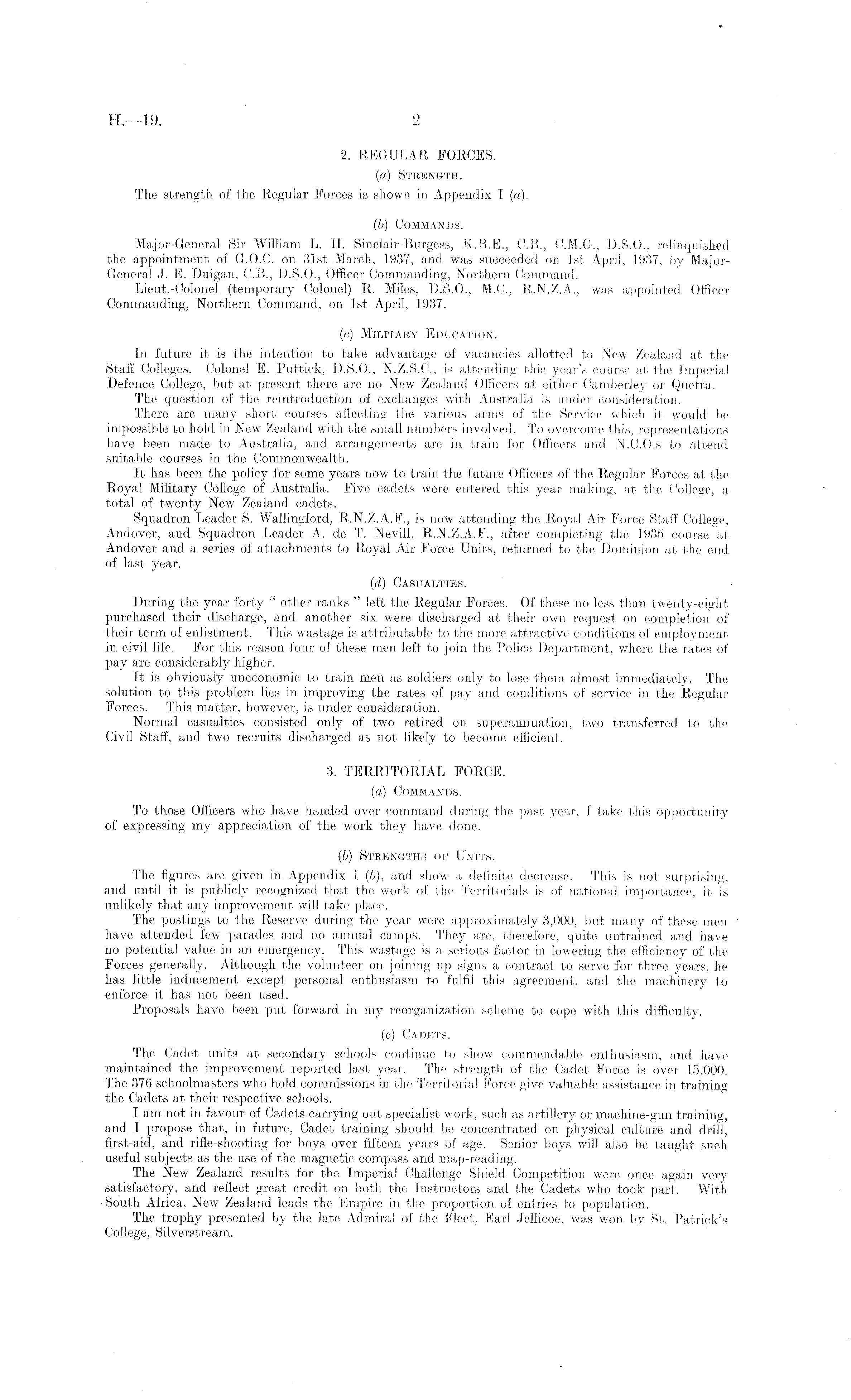 2. REGULAR FORCES. (а) Strength. The strength of the Regular Forces is shown in Appendix I (a). (б) Commands. Major-General Sir William L. H. Sinclair-Burgess, K.8.E., C.8., C.M.G., D.5.0., relinquished the appointment of G.O.C. on 31st March, 1937, and was succeeded on Ist April, 1937, by MajorGeneral J. E. Duigan, C.8., D.5.0., Officer Commanding, Northern Command. Lieut.-Colonel (temporary Colonel) R. Miles, D.5.0., M.C., R.N.Z.A., was appointed Officer Commanding, Northern Command, on Ist April, 1937. (c) Military Education. In future it is the intention to take advantage of vacancies allotted to New Zealand at the Staff Colleges. Colonel E. Puttick, D.5.0., N.Z.S.C., is attending this year's course at the Imperial Defence College, but at present there are no New Zealand Officers at either Camberley or Quetta. The question of the reintroduction of exchanges with Australia is under consideration. There are many short courses affecting the various arms of the Service which it would be impossible to hold in New Zealand with the small numbers involved. To overcome this, representations have been made to Australia, and arrangements are in train for Officers and N.C.O.s to attend suitable courses in the Commonwealth. It has been the policy for some years now to train the future Officers of the Regular Forces at the Royal Military College of Australia. Five cadets were entered this year making, at the College, a total of twenty New Zealand cadets. Squadron Leader S. Wallingford, R.N.Z.A.F., is now attending the Royal Air Force Staff College, Andover, and Squadron Leader A. de T. Nevill, R.N.Z.A.F., after completing the 1935 course at Andover and a series of attachments to Royal Air Force Units, returned to the Dominion at the end of last year. (d) Casualties. During the year forty " other ranks " left the Regular Forces. Of these no less than twenty-eight purchased their discharge, and another six were discharged at their own request on completion of their term of enlistment. This wastage is attributable to the more attractive conditions of employment in civil life. For this reason four of these men left to join the Police Department, where the rates of pay are considerably higher. It is obviously uneconomic to train men as soldiers only to lose them, almost immediately. The solution to this problem lies in improving the rates of pay and conditions of service in the Regular Forces. This matter, however, is under consideration. Normal casualties consisted only of two retired on superannuation, two transferred to the Civil Staff, and two recruits discharged as not likely to become efficient. 3. TERRITORIAL FORCE. (a) Commands. To those Officers who have handed over command during the past year, I take this opportunity of expressing my appreciation of the work they have done. (b) Strengths of Units. The figures are given in Appendix I (b), and show a definite decrease. This is not surprising, and until it is publicly recognized that the work of the Territorials is of national importance, it is unlikely that any improvement will take place. The postings to the Reserve during the year were approximately 3,000, but many of these men have attended few parades and no annual camps. They are, therefore, quite untrained and have no potential value in an emergency. This wastage is a serious factor in lowering the efficiency of the Forces generally. Although the volunteer on joining up signs a contract to serve for three years, he has little inducement except personal enthusiasm to fulfil this agreement, and the machinery to enforce it has not been used. Proposals have been put forward in my reorganization scheme to cope with this difficulty. (c) Cadets. The Cadet units at secondary schools continue to show commendable enthusiasm, and have maintained the, improvement reported last year. The strength of the Cadet Force is over 15,000. The 376 schoolmasters who hold commissions in the Territorial Force give valuable assistance in training the Cadets at their respective schools. I am not in favour of Cadets carrying out specialist work, such as artillery or machine-gun training, and I propose that, in future, Cadet training should be concentrated on physical culture and drill, first-aid, and rifle-shooting for boys over fifteen years of age. Senior boys will also be taught such useful subjects as the use of the magnetic compass and map-reading. The New Zealand results for the Imperial Challenge Shield Competition were once again very satisfactory, and reflect great credit on both the Instructors and the Cadets who took part. With South Africa, New Zealand leads the Empire in the proportion of entries to population. The trophy presented by the late Admiral of the Fleet, Earl Jellicoe, was won by St. Patrick's College, Silverstream,