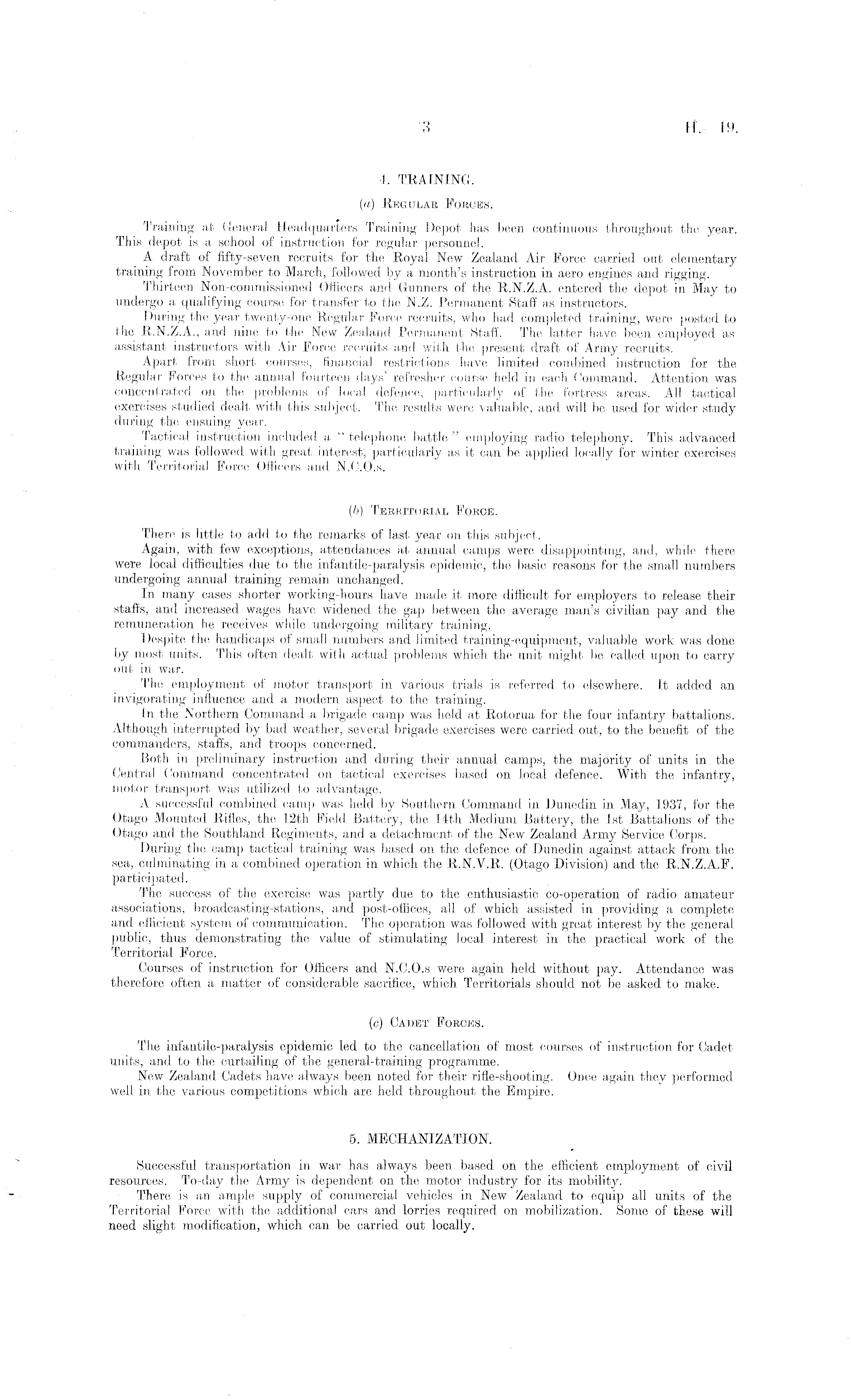 4. TRAINING. (a) Regular Forces. Training at General Headquarters Training Depot has been continuous throughout the year. This depot is a school of instruction for regular personnel. A draft of fifty-seven recruits for the Royal New Zealand Air Force carried out elementary training from November to March, followed by a month's instruction in aero engines and rigging. Thirteen Non-commissioned Officers and Gunners of the R.N.Z.A. entered the depot in May to undergo a qualifying course for transfer to the N.Z. Permanent Staff as instructors. During the year twenty-one Regular Force recruits, who had completed training, were posted to the R.N.Z.A., and nine to the New Zealand Permanent Staff. The latter have been employed as assistant instructors with Air Force recruits and with the present draft of Army recruits. Apart from short courses, financial restrictions have limited combined instruction for the Regular Forces to the annual fourteen days' refresher course held in each Command. Attention was concentrated on the problems of local defence, particularly of the fortress areas. All tactical exercises studied dealt with this subject. The results were valuable, and will be used for wider study during the ensuing year. Tactical instruction included a " telephone battle " employing radio telephony. This advanced training was followed with great interest, particularly as it can be applied locally for winter exercises with Territorial Force Officers and N.C.O.s. (6) Territorial Force. There is little to add to the remarks of last year on this subject. Again, with few exceptions, attendances at annual camps were disappointing, and, while there were local difficulties due to the infantile-paralysis epidemic, the basic reasons for the small numbers undergoing annual training remain unchanged. In many cases shorter working-hours have made it more difficult for employers to release their staffs, and increased wages have widened the gap between the average man's civilian pay and the remuneration he receives while undergoing military training. Despite the handicaps of small numbers and limited training-equipment, valuable work was done by most units. This often dealt with actual problems which the unit might be called upon to carry out in war. The employment of motor transport in various trials is referred to elsewhere. It added an invigorating influence and a modern aspect to the training. In the Northern Command a brigade camp was held at Rotorua for the four infantry battalions. Although interrupted by bad weather, several brigade exercises were carried out, to the benefit of the commanders, staffs, and troops concerned. Both in preliminary instruction and during their annual camps, the majority of units in the Central Command concentrated on tactical exercises based on local defence. With the infantry, motor transport was utilized to advantage. A successful combined camp was held by Southern Command in Dunedin in May, 1937, for the Otago Mounted Rifles, the 12th Field Battery, the 14th Medium Battery, the Ist Battalions of the Otago and the Southland Regiments, and a detachment of the New Zealand Army Service Corps. During the camp tactical training was based on the defence of Dunedin against attack from the sea, culminating in a combined operation in which the R.N.Y.R. (Otago Division) and the R.N.Z.A.F. participated. The success of the exercise was partly due to the enthusiastic co-operation of radio amateur associations, broadcasting-stations, and post-offices, all of which assisted in providing a complete and efficient system of communication. The operation was followed with great interest by the general public, thus demonstrating the value of stimulating local interest in the practical work of the Territorial Force. Courses of instruction for Officers and N.C.O.s were again held without pay. Attendance was therefore often a matter of considerable sacrifice, which Territorials should not be asked to make. (c) Cadet Forces. The infantile-paralysis epidemic led to the cancellation of most courses of instruction for Cadet units, and to the curtailing of the general-training programme. New Zealand Cadets have always been noted for their rifle-shooting. Once again they performed well in the various competitions which are held throughout the Empire. 5. MECHANIZATION. Successful transportation in war has always been based on the efficient employment of civil resources. To-clay the Army is dependent on the motor industry for its mobility. There is an ample supply of commercial vehicles in New Zealand to equip all units of the Territorial Force with the additional cars and lorries required on mobilization. Some of these will need slight modification, which can be carried out locally.