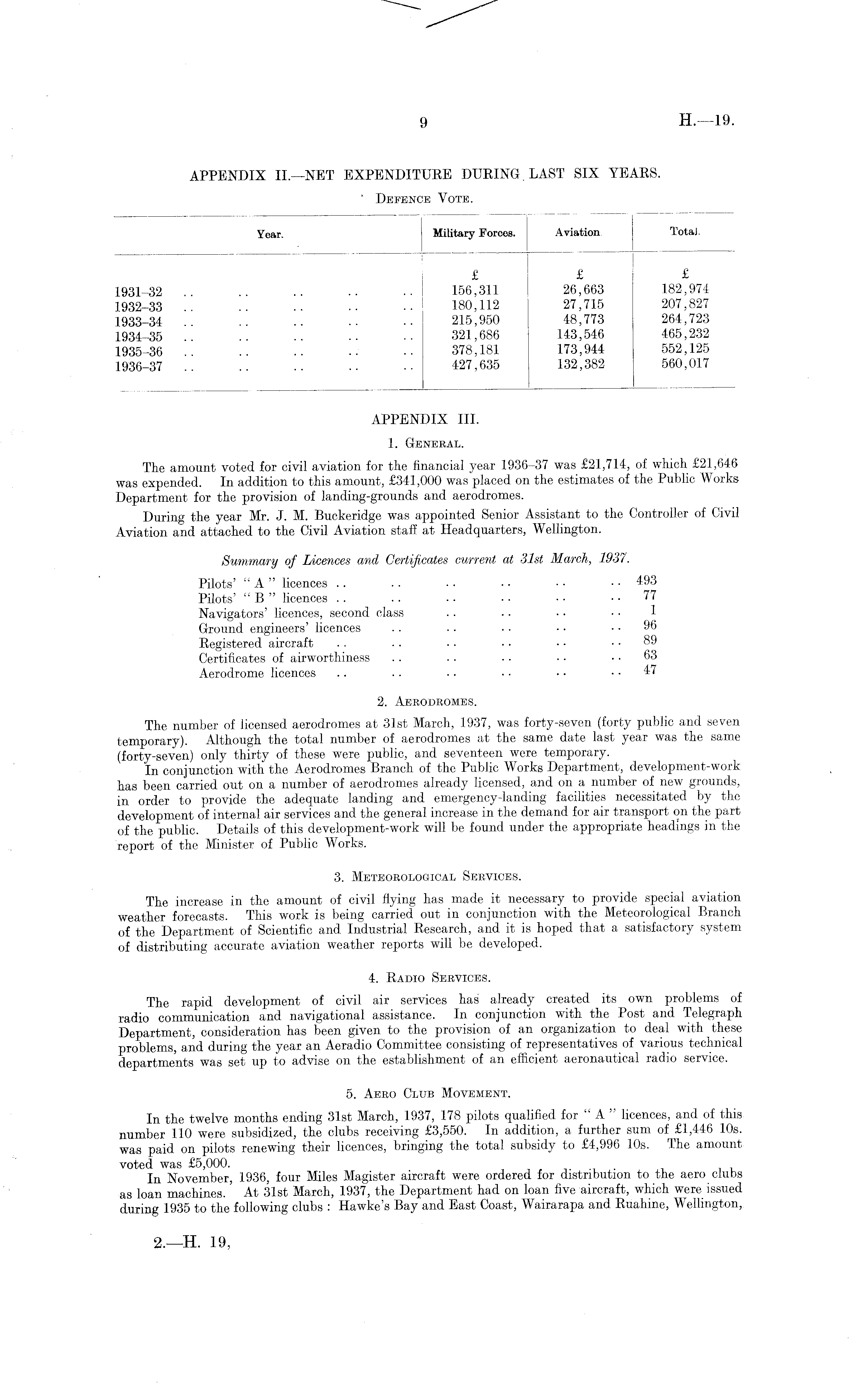 APPENDIX 111. 1. General. The amount voted for civil aviation for the financial year 1936-37 was £21,714, of which £21,646 was expended. In addition to this amount, £341,000 was placed on the estimates of the Public Works Department for the provision of landing-grounds and aerodromes. During the year Mr. J. M. Buckeridge was appointed Senior Assistant to the Controller of Civil Aviation and attached to the Civil Aviation staff at Headquarters, Wellington. Summary of Licences and Certificates current at 31st March, 1937. Pilots' "A " licences .. . . ■. • • • • ■ • 493 Pilots' " B " licences .. .. • • ■ ■ • ■ 77 Navigators' licences, second class .. .. • • • • 1 Ground engineers' licences .. .. • • • • 96 Registered aircraft .. .. ■ • ■ • • • .. 89 Certificates of airworthiness . . .. .. • ■ 63 Aerodrome licences .. .. .. • • • • .. 47 2. Aerodromes. The number of licensed aerodromes at 31st March, 1937, was forty-seven (forty public and seven temporary). Although the total number of aerodromes at the same date last year was the same (forty-seven) only thirty of these were public, and seventeen were temporary. In conjunction with the Aerodromes Branch of the Public Works Department, development-work has been carried out on a number of aerodromes already licensed, and on a number of new grounds, in order to provide the adequate landing and emergency-landing facilities necessitated by the development of internal air services and the general increase in the demand for air transport on the part of the public. Details of this development-work will be found under the appropriate headings in the report of the Minister of Public Works. 3. Meteorological Services. The increase in the amount of civil flying has made it necessary to provide special aviation weather forecasts. This work is being carried out in conjunction with the Meteorological Branch of the Department of Scientific and Industrial Research, and it is hoped that a satisfactory system of distributing accurate aviation weather reports will be developed. 4. Radio Services. The rapid development of civil air services has already created its own problems of radio communication and navigational assistance. In conjunction with the Post and Telegraph Department, consideration has been given to the provision of an organization to deal with these problems, and during the year an Aeradio Committee consisting of representatives of various technical departments was set up to advise on the establishment of an efficient, aeronautical radio service. 5. Aero Club Movement. In the twelve months ending 31st March, 1937, 178 pilots qualified for " A " licences, and of this number 110 were subsidized, the clubs receiving £3,550. In addition, a further sum of £1,446 10s. was paid on pilots renewing their licences, bringing the total subsidy to £4,996 10s. The amount voted was £5,000. In November, 1936, four Miles Magister aircraft were ordered for distribution to the aero clubs as loan machines. At 31st March, 1937, the Department had on loan five aircraft, which were issued during 1935 to the following clubs : Hawke's Bay and East Coast, Wairarapa and Ruahine, Wellington,. 2,— H. 19,