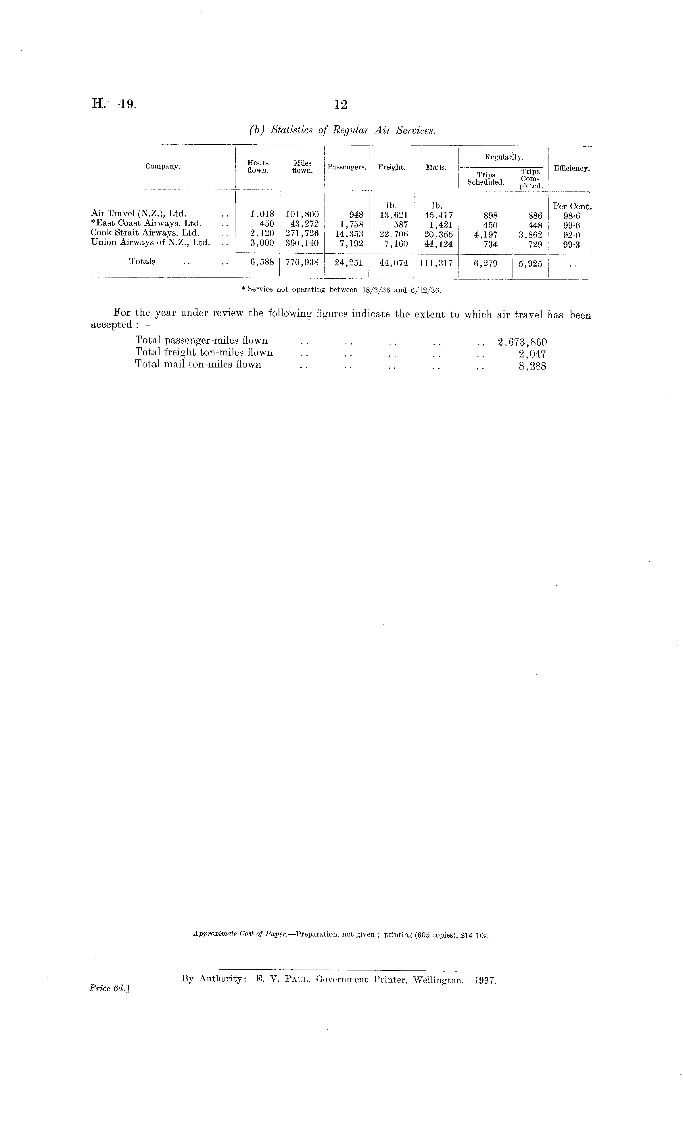! Regularity. Company. j* 0 ™ 8 Passengers. [ Freight. Mails. Efficiency. I » lb. lb. Per Cent. Air Travel (N.Z.), Ltd. .. 1,018 101,800 948 13,621 45,417 898 886 98-6 *East Coast Airways, Ltd. .. 450 43,272 1,758 587 1,421 450 448 99-6 Cook Strait Airways, Ltd. .. 2,120 271,726 14,353 22,706 20,355 4,197 3,862 92-0 Union Airways of N.Z., Ltd. .. 3,000 360,140 7,192 7,160 44,124 734 729 99-3 Totals .. .. 6,588 776,938 24,251 44,074 111,317 6,279 5,925 * Service not operating between 18/3/36 and 6/12/36.