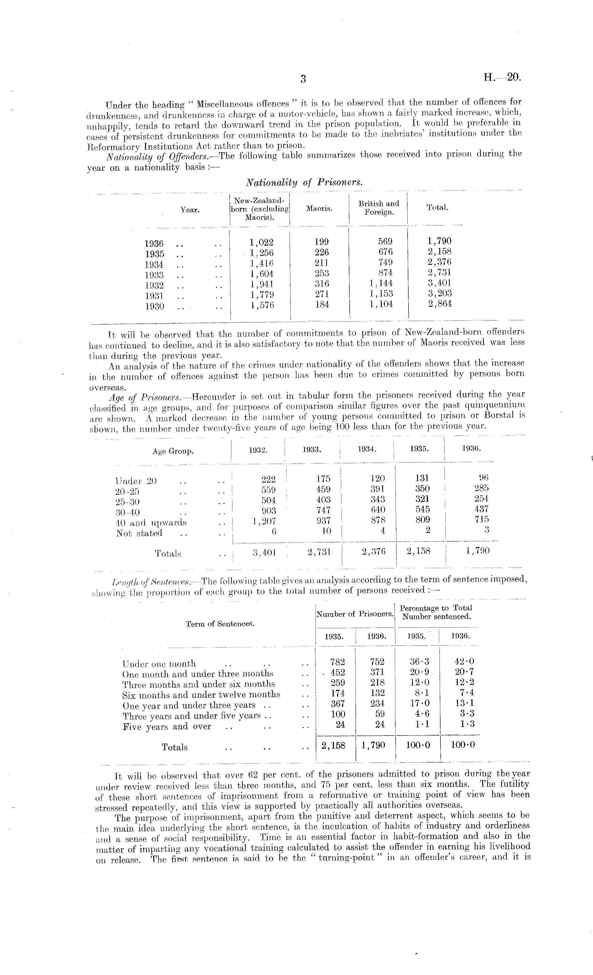 Under the heading " Miscellaneous offences " it is to be observed that the number of offences for drunkenness, and drunkenness in charge of a motor-vehicle, has shown a fairly marked increase, which, unhappily, tends to retard the downward trend in the prison population. _ It would be preferable m cases of persistent drunkenness for commitments to be made to the inebriates' institutions under the Reformatory Institutions Act rather than to prison. Nationality of Offenders.— The following table summarizes those received into prison during the year on a nationality basis : —