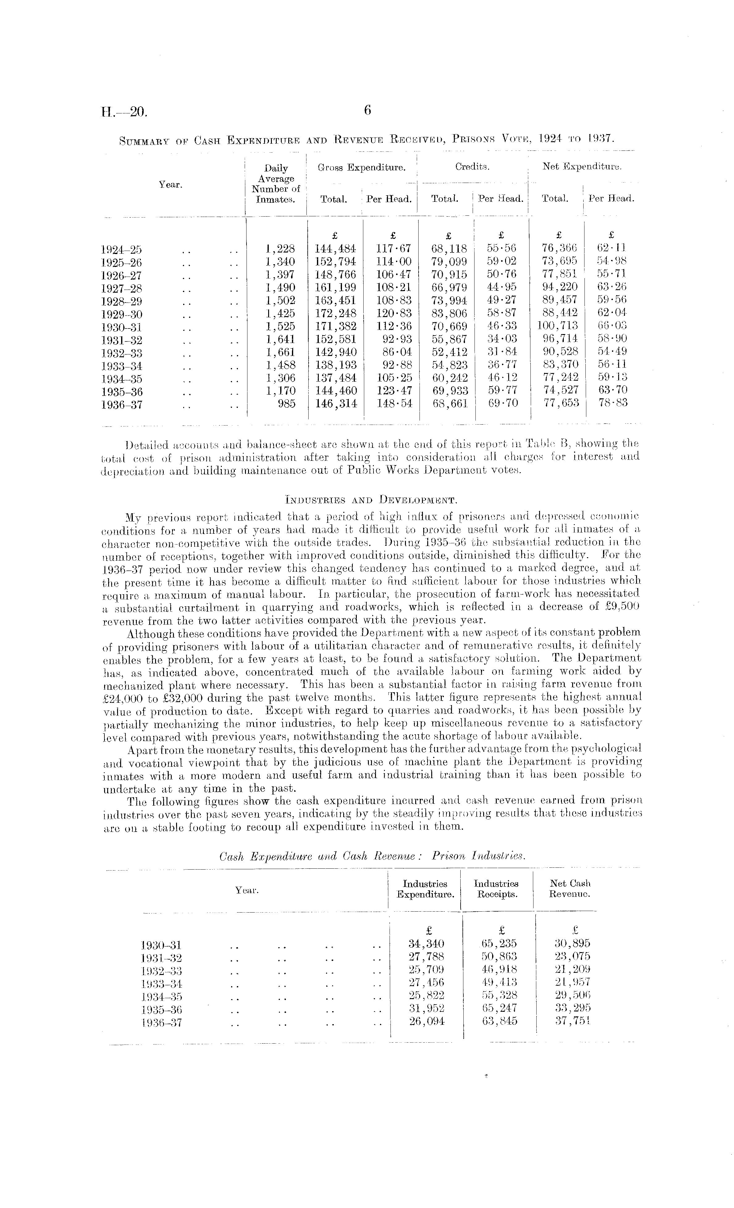 Detailed accounts and balance-sheet are shown at the end of this report in Table B, showing the total cost of prison administration after taking into consideration all charges for interest and depreciation and building maintenance out of Public Works Department votes. Industries and Development. My previous report indicated that a period of high influx of prisoners and depressed economic conditions for a number of years had made it difficult to provide useful work for all inmates of a character non-competitive with the outside trades. During 1935-36 the substantia] reduction in the number of receptions, together with improved conditions outside, diminished this difficulty. For the 1936-37 period now under review this changed tendency has continued to a marked degree, and at the present time it has become a difficult matter to find sufficient labour for those industries which require a maximum of manual labour. In particular, the prosecution of farm-work has necessitated a substantial curtailment in quarrying and roadworks, which is reflected in a decrease of £9,500 revenue from the two latter activities compared with the previous year. Although these conditions have provided the Department with a new aspect of its constant problem of providing prisoners with labour of a utilitarian character and of remunerative results, it definitely enables the problem, for a few years at least, to be found a satisfactory solution. The Department has, as indicated above, concentrated much of the available labour on farming work aided by mechanized plant where necessary. This has been a substantial factor in raising farm revenue from £24,000 to £32,000 during the past twelve months. This latter figure represents the highest annual value of production to date. Except with regard to quarries and roadworks, it has been possible by partially mechanizing the minor industries, to help keep up miscellaneous revenue to a satisfactory level compared with previous years, notwithstanding the acute shortage of labour available. Apart from the monetary results, this development has the further advantage from the psychological and vocational viewpoint that by the judicious use of machine plant the Department is providing inmates with a more modern and useful farm and industrial training than it has been possible to undertake at any time in the past. The following figures show the cash expenditure incurred and cash revenue earned from prison industries over the past seven years, indicating by the steadily improving results that these industries are on a stable footing to recoup all expenditure invested in them.