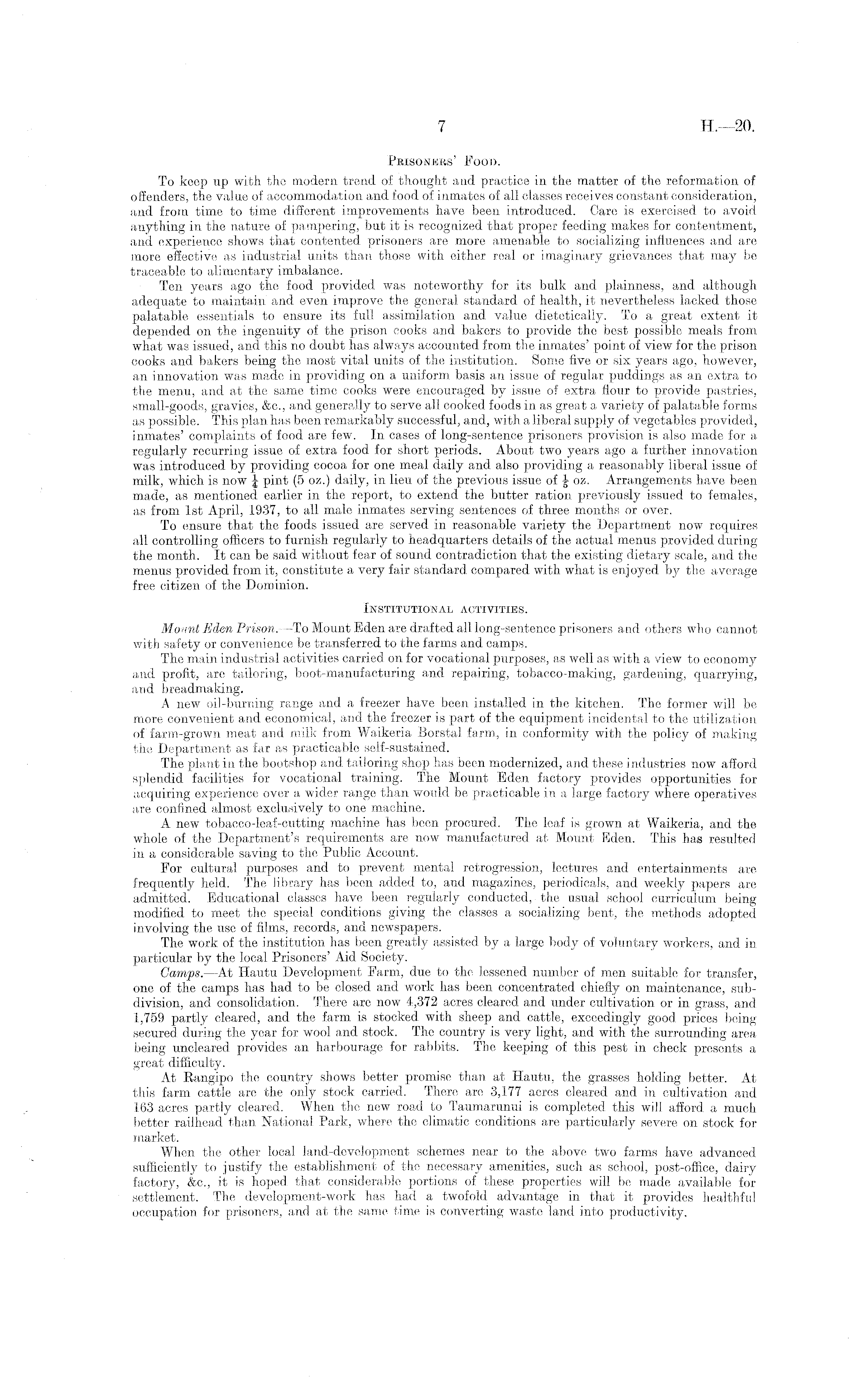 Prisoners' Food. To keep up with the modern trend, of thought and practice in the matter of the reformation of offenders, the value of accommodation and food of inmates of all classes receives constant consideration, and from time to time different improvements have been introduced. Care is exercised to avoid anything in the nature of pampering, but it is recognized that proper feeding makes for contentment, and experience shows that contented prisoners are more amenable to socializing influences and are more effective as industrial units than those with either real or imaginary grievances that may be traceable to alimentary imbalance. Ten years ago the food provided was noteworthy for its bulk and plainness, and although adequate to maintain and even improve the general standard of health, it nevertheless lacked those palatable essentials to ensure its full assimilation and value dietetically. To a great extent it depended on the ingenuity of the prison cooks and bakers to provide the best possible meals from what was issued, and this no doubt has always accounted from the inmates' point of view for the prison cooks and bakers being the most vital units of the institution. Some five or six years ago, however, an innovation was made in providing on a uniform basis an issue of regular puddings as an extra to the menu, and at the same time cooks were encouraged by issue of extra flour to provide pastries, small-goods, gravies, &c., and generally to serve all cooked foods in as great a variety of palatable forms as possible. This plan has been remarkably successful, and, with a liberal supply of vegetables provided, inmates' complaints of food are few. In cases of long-sentence prisoners provision is also made for a regularly recurring issue of extra food for short periods. About two years ago a further innovation was introduced by providing cocoa for one meal daily and also providing a reasonably liberal issue of milk, which is now J pint (5 oz.) daily, in lieu of the previous issue of J oz. Arrangements have been made, as mentioned earlier in the report, to extend the butter ration previously issued to females, as from Ist April, 1937, to all male inmates serving sentences of three months or over. To ensure that the foods issued are served in reasonable variety the Department now requires all controlling officers to furnish regularly to headquarters details of the actual menus provided during the month. It can be said without fear of sound contradiction that the existing dietary scale, and the menus provided from it, constitute a very fair standard compared with what is enjoyed by the average free citizen of the Dominion. Institutional activities. Mount Eden Prison. —To Mount Eden are drafted all long-sentence prisoners and others who cannot with safety or convenience be transferred to the farms and camps. The main industrial activities carried on for vocational purposes, as well as with a view to economy and profit, are tailoring, boot-manufacturing and repairing, tobacco-making, gardening, quarrying, and breadmaking. A new oil-burning range and a freezer have been installed in the kitchen. The former will be more convenient and economical, and the freezer is part of the equipment incidental to the utilization of farm-grown meat and milk from Waikeria Borstal farm., in conformity with the policy of making the Department as far as practicable self-sustained. The plant in the bootshop and tailoring shop has been modernized, and these industries now afford splendid facilities for vocational training. The Mount. Eden factory provides opportunities for acquiring experience over a wider range than would be practicable in a large factory where operatives are confined almost exclusively to one machine. A new tobacco-leaf-cutting machine has been procured. The leaf is grown at Waikeria, and the whole of the Department's requirements are now manufactured at Mount Eden. This has resulted in a considerable saving to the Public Account. For cultural purposes and to prevent mental retrogression, lectures and entertainments are frequently held. The library has been added to, and magazines, periodicals, and weekly papers are admitted. Educational classes have been regularly conducted, the usual school curriculum being modified to meet the special conditions giving the classes a socializing bent, the methods adopted involving the use of films, records, and newspapers. The work of the institution has been greatly assisted by a large body of voluntary workers, and in particular by the local Prisoners' Aid Society. Camps. —At Hautu Development Farm, due to the lessened number of men suitable for transfer, one of the camps has had to be closed and work has been concentrated chiefly on maintenance, subdivision, and consolidation. There are now 4,372 acres cleared and under cultivation or in grass, and 1,759 partly cleared, and the farm is stocked with sheep and cattle, exceedingly good prices being secured during the year for wool and stock. The country is very light, and with the surrounding area being uncleared provides an harbourage for rabbits. The keeping of this pest in check presents a great difficulty. At Rangipo the country shows better promise than at Hautu, the grasses holding better. At this farm cattle are the only stock carried. There are 3,177 acres cleared and in cultivation and 163 acres partly cleared. When the new road to Taumarunui is completed this will afford a much better railhead than National Park, where the climatic conditions are particularly severe on stock for market. When the other local land-development schemes near to the above two farms have advanced sufficiently to justify the establishment of the necessary amenities, such as school, post-office, dairy factory, &c., it is hoped that considerable portions of these properties will be made available for settlement. The development-work has had a twofold advantage in that it provides healthful occupation for prisoners, and at