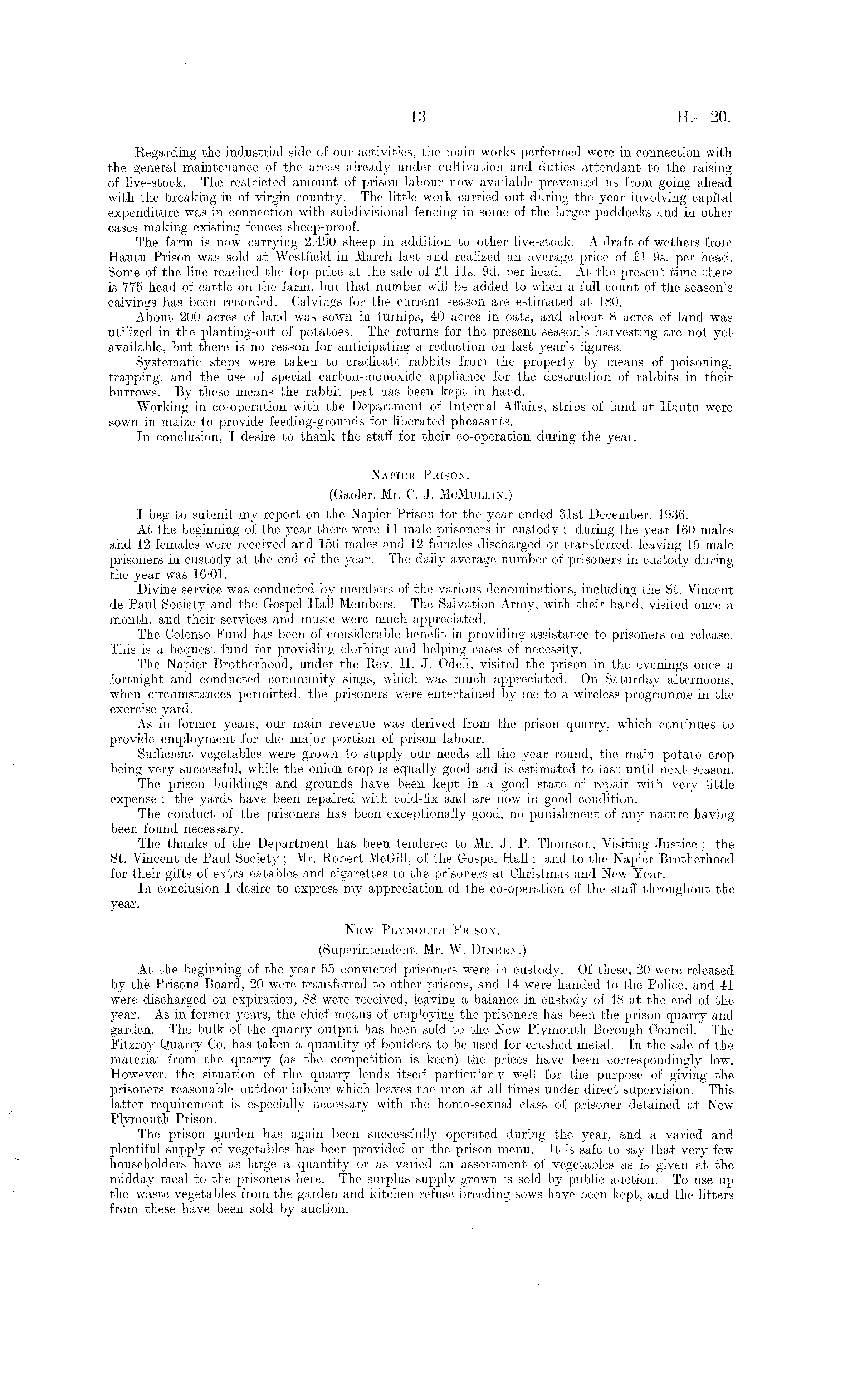 Regarding the industrial side of our activities, the main works performed were in connection with the general maintenance of the areas already under cultivation and duties attendant to the raising of live-stock. The restricted amount of prison labour now available prevented us from going ahead with the breaking-in of virgin country. The little work carried out during the year involving capital expenditure was in connection with subdivisional fencing in some of the larger paddocks and in other cases making existing fences sheep-proof. The farm is now carrying 2,490 sheep in addition to other live-stock. A draft of wethers from Hautu Prison was sold at Westfield in March last and realized an average price of £1 9s. per head. Some of the line reached the top price at the sale of £1 lis. 9d. per head. At the present time there is 775 head of cattle on the farm, but that number will be added to when a full count of the season's calvings has been recorded. Calvings for the current season are estimated at 180. About 200 acres of land was sown in turnips, 40 acres in oats, and about 8 acres of land was utilized in the planting-out of potatoes. The returns for the present season's harvesting are not yet available, but there is no reason for anticipating a reduction on last year's figures. Systematic steps were taken to eradicate rabbits from the property by means of poisoning, trapping, and the use of special carbon-monoxide appliance for the destruction of rabbits in their burrows. By these means the rabbit pest has been kept in hand. Working in co-operation with the Department of Internal Affairs, strips of land at Hautu were sown in maize to provide feeding-grounds for liberated pheasants. In conclusion, I desire to thank the staff for their co-operation during the year. Napier Prison. (Gaoler, Mr. C. J. McMullin.) I beg to submit my report on the Napier Prison for the year ended 31st December, 1936. At the beginning of the year there were 11 male prisoners in custody ; during the year 160 males and 12 females were received and 156 males and 12 females discharged or transferred, leaving 15 male prisoners in custody at the end of the year. The daily average number of prisoners in custody during the year was 16-01. Divine service was conducted by members of the various denominations, including the St. Vincent de Paul Society and the Gospel Hall Members. The Salvation Army, with their band, visited once a month, and their services and music were much appreciated. The Colenso Fund has been of considerable benefit in providing assistance to prisoners on release. This is a bequest fund for providing clothing and helping cases of necessity. The Napier Brotherhood, under the Rev. H. J. Odell, visited the prison in the evenings once a fortnight and conducted community sings, which was much appreciated. On Saturday afternoons, when circumstances permitted, the prisoners were entertained by me to a wireless programme in the exercise yard. As in former years, our main revenue was derived from the prison quarry, which continues to provide employment for the major portion of prison labour. Sufficient vegetables were grown to supply our needs all the year round, the main potato crop being very successful, while the onion crop is equally good and is estimated to last until next season. The prison buildings and grounds have been kept in a good state of repair with very little expense ; the yards have been repaired with cold-fix and are now in good condition. The conduct of the prisoners has been exceptionally good, no punishment of any nature having been found necessary. The thanks of the Department has been tendered to Mr. J. P. Thomson, Visiting Justice ; the St. Vincent de Paul Society ; Mr. Robert McGill, of the Gospel Hall; and to the Napier Brotherhood for their gifts of extra eatables and cigarettes to the prisoners at Christmas and New Year. In conclusion I desire to express my appreciation of the co-operation of the staff throughout the year. New Plymouth Prison. (Superintendent, Mr. W. Dineen.) At the beginning of the year 55 convicted prisoners were in custody. Of these, 20 were released by the Prisons Board, 20 were transferred to other prisons, and 14 were handed to the Police, and 41 were discharged on expiration, 88 were received, leaving a balance in custody of 48 at the end of the year. As in former years, the chief means of employing the prisoners has been the prison quarry and garden. The bulk of the quarry output has been sold to the New Plymouth Borough Council. The Fitzroy Quarry Co. has taken a quantity of boulders to be used for crushed metal. In the sale of the material from the quarry (as the competition is keen) the prices have been correspondingly low. However, the situation of the quarry lends itself particularly well for the purpose of giving the prisoners reasonable outdoor labour which leaves the men at all times under direct supervision. This latter requirement is especially necessary with the homo-sexual class of prisoner detained at New Plymouth Prison. The prison garden has again been successfully operated during the year, and a varied ancl plentiful supply of vegetables has been provided on the prison menu. It is safe to say that very few householders have as large a quantity or as varied an assortment of vegetables as is given at the midday meal to the prisoners here. The surplus supply grown is sold by public auction. To use up the waste vegetables from the garden and kitchen refuse breeding sows have been kept, and the litters from these have been sold by auction.