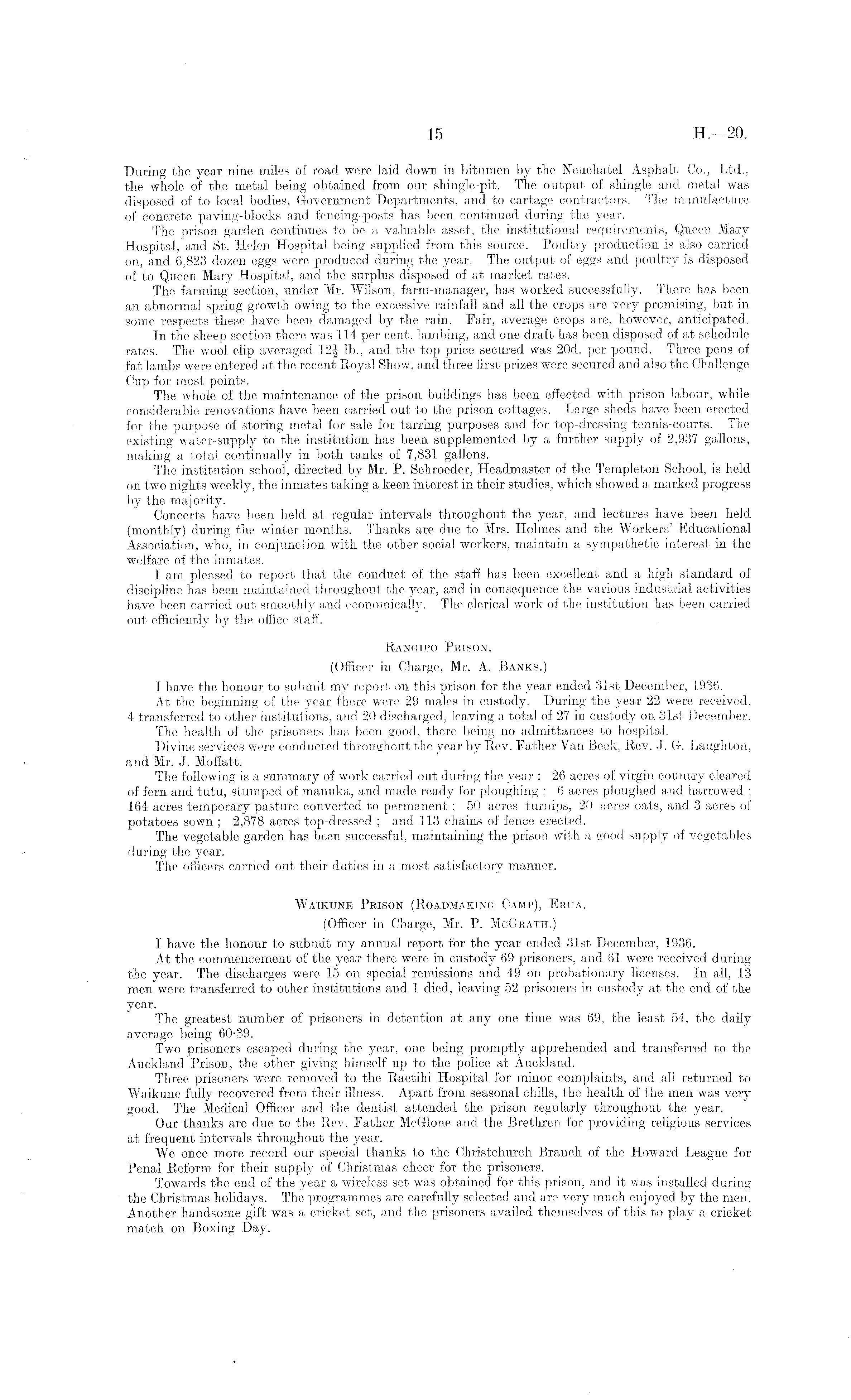 During the year nine miles of road were laid down in bitumen by the Neuchatel Asphalt Co., Ltd., the whole of the metal being obtained from our shingle-pit. The output of shingle and metal was disposed of to local bodies, Government Departments, and to cartage contractors. The manufacture of concrete paving-blocks and fencing-posts has been continued during the year. The prison garden continues to be a valuable asset, the institutional requirements, Queen Mary Hospital, and St. Helen Hospital being supplied from this source. Poultry production is also carried on, and 6,823 dozen eggs were produced during the year. The output of eggs and poultry is disposed of to Queen Mary Hospital, and the surplus disposed of at market rates. The farming section, under Mr. Wilson, farm-manager, has worked successfully. There has been an abnormal spring growth owing to the excessive rainfall and all the crops are very promising, but in some respects these have been damaged by the rain. Fair, average crops are, however, anticipated. In the sheep section there was 114 per cent, lambing, and one draft has been disposed of at schedule rates. The wool clip averaged 12| lb., and the top price secured was 20d. per pound. Three pens of fat lambs were entered at the recent Royal Show, and three first prizes were secured and also the Challenge Cup for most points. The whole of the maintenance of the prison buildings has been eSected with prison labour, while considerable renovations have been carried out to the prison cottages. Large sheds have been erected for the purpose of storing metal for sale for tarring purposes and for top-dressing tennis-courts. The existing water-supply to the institution has been supplemented by a further supply of 2,937 gallons, making a total continually in both tanks of 7,831 gallons. The institution school, directed by Mr. P. Schroeder, Headmaster of the Templeton School, is held on two nights weekly, the inmates taking a keen interest in their studies, which showed a marked progress by the majority. Concerts have been held at regular intervals throughout the year, and lectures have been held (monthly) during the winter months. Thanks are due to Mrs. Holmes and the Workers' Educational Association, who, in conjunction with the other social workers, maintain a sympathetic interest in the welfare of the inmates. I am pleased to report that the conduct of the staff has been excellent and a high standard of discipline has been maintained throughout the year, and in consequence the various industrial activities have been carried out smoothly and economically. The clerical work of the institution has been carried out efficiently by the office staff. Rangipo Prison. (Officer in Charge, Mr. A. Banks.) I have the honour to submit my report on this prison for the year ended 31st December, 1936. At the beginning of the year there were 29 males in custody. During the year 22 were received, 4 transferred to other institutions, and 20 discharged, leaving a total of 27 in custody on 31st December. The health of the prisoners has been good, there being no admittances to hospital. Divine services were conducted throughout the year by Rev. Father Van Beek, Rev. J. G. Laughton, and Mr. J. Moffatt. The following is a summary of work carried out during the year : 26 acres of virgin country cleared of fern and tutu, stumped of manuka, and made ready for ploughing ; 6 acres ploughed and harrowed ; 164 acres temporary pasture converted to permanent ; 50 acres turnips, 20 acres oats, and 3 acres of potatoes sown ; 2,878 acres top-dressed ; and 113 chains of fence erected. The vegetable garden has been successful, maintaining the prison with a good supply of vegetables during the year. The officers carried out their duties in a most satisfactory manner. Waikune Prison (Roadmaking Camp), Erua. (Officer in Charge, Mr. P. McGrath.) I have the honour to submit my annual report for the year ended 31st December, 1936. At the commencement of the year there were in custody 69 prisoners, and 61 were received during the year. The discharges were 15 on special remissions and 49 on probationary licenses. In all, 13 men were transferred to other institutions and 1 died, leaving 52 prisoners in custody at the end of the year. The greatest number of prisoners in detention at any one time was 69, the least 54, the daily average being 60-39. Two prisoners escaped during the year, one being promptly apprehended and transferred to the Auckland Prison, the other giving himself up to the police at Auckland. Three prisoners were removed to the Raetihi Hospital for minor complaints, and all returned to Waikune fully recovered from their illness. Apart from seasonal chills, the health of the men was very good. The Medical Officer and the dentist attended the prison regularly throughout the year. Our thanks are due to the Rev. Father McGlone and the Brethren for providing religious services at frequent intervals throughout the year. We once more record our special thanks to the Christchurch Branch of the Howard League for Penal Reform for their supply of Christmas cheer for the prisoners. Towards the end of the year a wireless set was obtained for this prison, and it was installed during the Christmas holidays. The programmes are carefully selected and are very much enjoyed by the men. Another handsome gift was a cricket set, and the, prisoners availed themselves of this to play a cricket match on Boxing Day.