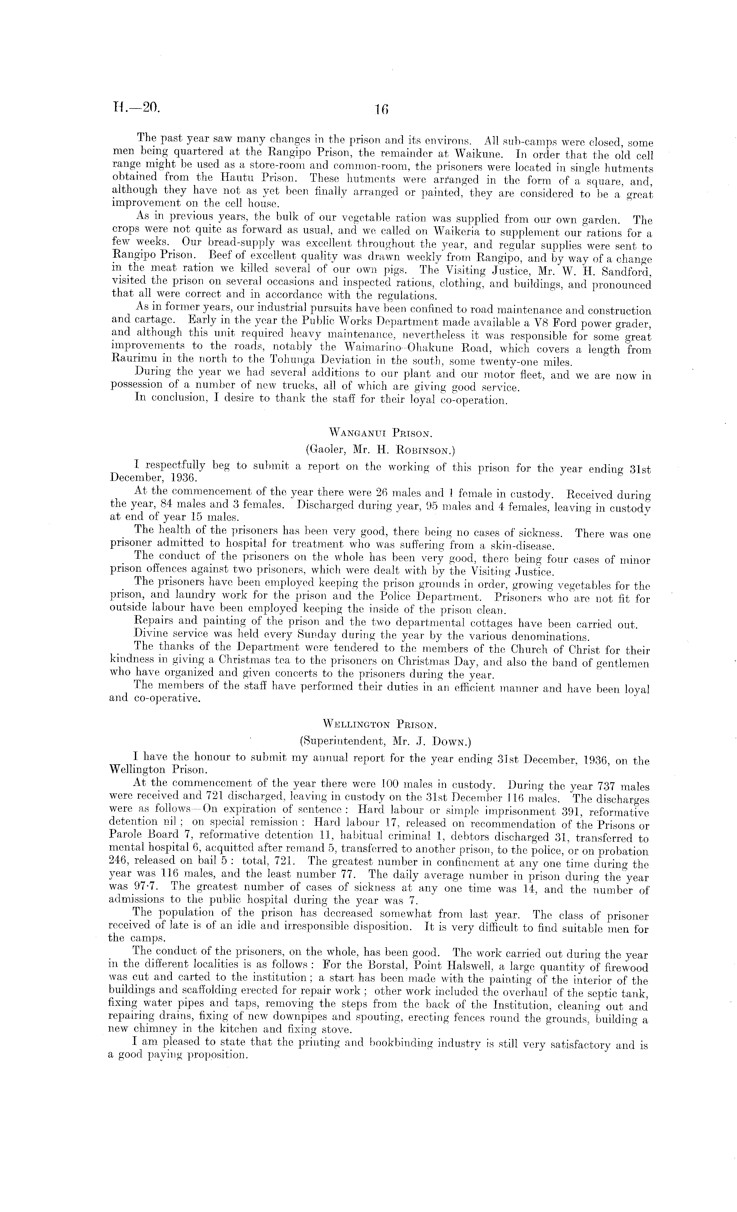 The past year saw many changes in the prison and its environs. All sub-camps were closed, some men being quartered at the Rangipo Prison, the remainder at Waikune. In order that the old cell range might be used as a store-room and common-room, the prisoners were located in single hutments obtained from the Hautu Prison. These hutments were arranged in the form of a square, and, although they have not as yet been finally arranged or painted, they are considered to be a great improvement on the cell house. As m previous years, the bulk of our vegetable ration was supplied from our own garden. The crops were not quite as forward as usual, and we called on Waikeria to supplement our rations for a few weeks. Our bread-supply was excellent throughout the year, and regular supplies were sent to Rangipo Prison. Beef of excellent quality was drawn weekly from Rangipo, and by way of a change m the meat ration we killed several of our own pigs. The Visiting Justice, Mr. W. H. Sandford, visited the prison 011 several occasions and inspected rations, clothing, and buildings, and pronounced that all were correct and in accordance with the regulations. As in former years, our industrial pursuits have been confined to road maintenance and construction and cartage. Early in the yea,r the Public Works Department made available aVB Ford power grader, and although this unit required heavy maintenance, nevertheless it was responsible for some great improvements to the loads, notably the W^aimanno—Ohakune Road, which covers a length from Raurimu in the north to the Tohunga Deviation in the south, some twentv-one miles. During the year we had several additions to our plant and our motor fleet, and we are now in possession of a number of new trucks, all of which are giving good service. In conclusion, I desire to thank the staff for their loyal co-operation. Wang-anui Pbison. (Gaoler, Mr. H. Robinson.) I respectfully beg to submit a report 011 the working of this prison for the year endino- 31st December, 1936. At the commencement of the year there were 26 males and 1 female in custody. Received during the year, 84 males and 3 females. Discharged during year, 95 males and 4 females, leaving in custodv at end of year 15 males. The health of the prisoners has been very good, there being no cases of sickness. There was one prisoner admitted to hospital for treatment who was suffering from a skin-disease. The conduct of the prisoners on the whole has been very good, there being four cases of minor prison offences against two prisoners, which were dealt with by the Visiting Justice. The prisoners have been employed keeping the prison grounds in order, growing vegetables for the prison, and laundry work for the prison and the Police Department. Prisoners who are not fit for outside labour have been employed keeping the inside of the prison clean. Repairs and painting of the prison and the two departmental cottages have been carried out. Divine service was held every Sunday during the year by the various denominations. The thanks of the Department were tendered to the members of the Church of Christ for their kindness 111 giving a Christmas tea to the prisoners on Christmas Day, and also the band of gentlemen who have organized and given concerts to the prisoners during the year. The members of the staff have performed their duties in an efficient manner and have been loyal and co-operative. Wellington Prison. (Superintendent, Mr. J. Down.) I have the honour to submit my annual report for the year ending 31st December, 1936, on the Wellington Prison. At the commencement of the year there were 100 males in custody. During the year 737 males were received and 721 discharged, leaving in custody on the 31st December 116 males. The discharges were as follows—On expiration of sentence : Hard labour or simple imprisonment 391, reformative detention nil ; on special remission : Hard labour 17, released 011 recommendation of the Prisons or Parole Board 7, reformative detention 11, habitual criminal 1, debtors discharged 31, transferred to mental hospital 6, acquitted after remand 5, transferred to another prison, to the police, or on probation 246, released on bail 5 : total, 721. The greatest number in confinement at any one time during the year was 116 males, and the least number 77. The daily average number in prison during was 97-7. The greatest number of cases of sickness at any one time was 14, and the number of admissions to the public hospital during the year was 7. The population of the prison has decreased somewhat from last year. The class of prisoner received of late is of an idle and irresponsible disposition. It is very difficult to find suitable men for the camps. The conduct of the prisoners, on the whole, has been good. The work carried out during the year in the different localities is as follows : For the Borstal, Point Halswell, a large quantity of firewood was cut and carted to the institution; a start has been made with the painting of the interior of the buildings and scaffolding erected for repair work ; other work included the overhaul of the septic tank, fixing water pipes and taps, removing the steps from the back of the Institution, cleaning out and repairing drains, fixing of new downpipes and spouting, erecting fences round the grounds, building a new chimney in the kitchen and fixing stove. I am pleased to state that the printing and bookbinding industry is still very satisfactory and is a good paying proposition.
