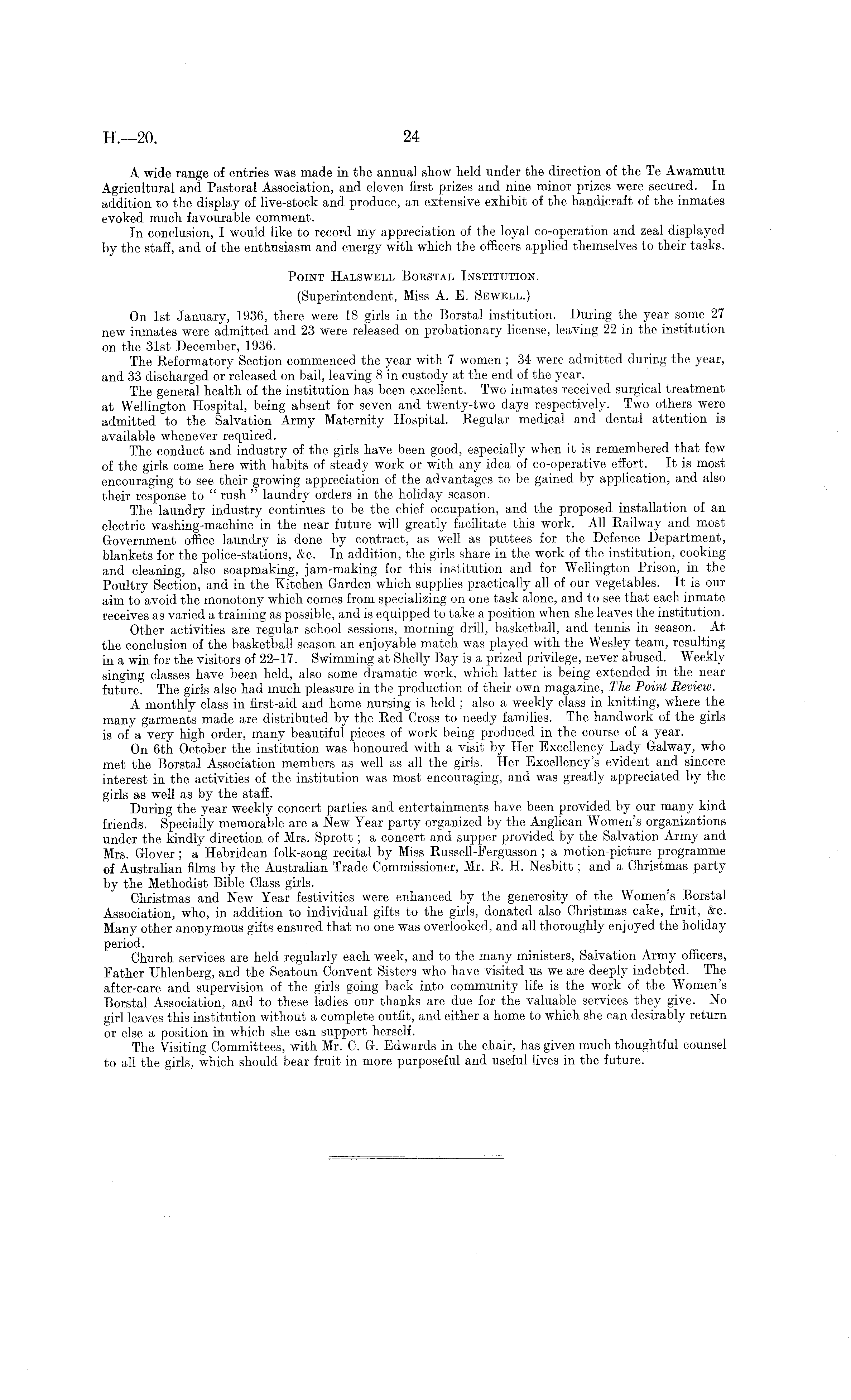 A wide range of entries was made in the annual show held under the direction of the Te Awamutu Agricultural and Pastoral Association, and eleven first prizes and nine minor prizes were secured. In addition to the display of live-stock and produce, an extensive exhibit of the handicraft of the inmates evoked much favourable comment. In conclusion, I would like to record my appreciation of the loyal co-operation and zeal displayed by the staff, and of the enthusiasm and energy with which the officers applied themselves to their tasks. Point Hals well Borstal Institution. (Superintendent, Miss A. E. Sewell.) On Ist January, 1936, there were 18 girls in the Borstal institution. During the year some 27 new inmates were admitted and 23 were released on probationary license, leaving 22 in the institution on the 31st December, 1936. The Reformatory Section commenced the year with 7 women ; 34 were admitted during the year, and 33 discharged or released on bail, leaving 8 in custody at the end of the year. The general health of the institution has been excellent. Two inmates received surgical treatment at Wellington Hospital, being absent for seven and twenty-two days respectively. Two others were admitted to the Salvation Army Maternity Hospital. Regular medical and dental attention is available whenever required. The conduct and industry of the girls have been good, especially when it is remembered that few of the girls come here with habits of steady work or with any idea of co-operative effort. It is most encouraging to see their growing appreciation of the advantages to be gained by application, and also their response to " rush " laundry orders in the holiday season. The laundry industry continues to be the chief occupation, and the proposed installation of an electric washing-machine in the near future will greatly facilitate this work. All Railway and most Government office laundry is done by contract, as well as puttees for the Defence Department, blankets for the police-stations, &c. In addition, the girls share in the work of the institution, cooking and cleaning, also soapmaking, jam-making for this institution and for Wellington Prison, in the Poultry Section, and in the Kitchen Garden which supplies practically all of our vegetables. It is our aim to avoid the monotony which comes from specializing on one task alone, and to see that each inmate receives as varied a training as possible, and is equipped to take a position when she leaves the institution. Other activities are regular school sessions, morning drill, basketball, and tennis in season. At the conclusion of the basketball season an enjoyable match was played with the Wesley team, resulting in a win for the visitors of 22-17. Swimming at Shelly Bay is a prized privilege, never abused. Weekly singing classes have been held, also some dramatic work, which latter is being extended in the near future. The girls also had much pleasure in the production of their own magazine, The Point Review. A monthly class in first-aid and home nursing is held ; also a weekly class in knitting, where the many garments made are distributed by the Red Cross to needy families. The handwork of the girls is of a very high order, many beautiful pieces of work being produced in the course of a year. On 6th October the institution was honoured with a visit by Her Excellency Lady Galway, who met the Borstal Association members as well as all the girls. Her Excellency's evident and sincere interest in the activities of the institution was most encouraging, and was greatly appreciated by the girls as well as by the staff. During the year weekly concert parties and entertainments have been provided by our many kind friends. Specially memorable are a New Year party organized by the Anglican Women's organizations under the kindly direction of Mrs. Sprott; a concert and supper provided by the Salvation Army and Mrs. Glover ; a Hebridean folk-song recital by Miss Russell-Fergusson ; a motion-picture programme of Australian films by the Australian Trade Commissioner, Mr. R. H. Nesbitt; and a Christmas party by the Methodist Bible Class girls. Christmas and New Year festivities were enhanced by the generosity of the Women's Borstal Association, who, in addition to individual gifts to the girls, donated also Christmas cake, fruit, &c. Many other anonymous gifts ensured that no one was overlooked, and all thoroughly enjoyed the holiday period. Church services are held regularly each week, and to the many ministers, Salvation Army officers, Father Uhlenberg, and the Seatoun Convent Sisters who have visited us we are deeply indebted. The after-care and supervision of the girls going back into community life is the work of the Women's Borstal Association, and to these ladies our thanks are due for the valuable services they give. No girl leaves this institution without a complete outfit, and either a home to which she can desirably return or else a position in which she can support herself. The Visiting Committees, with Mr. C. G. Edwards in the chair, has given much thoughtful counsel to all the girls, which should bear fruit in more purposeful and useful lives in the future.