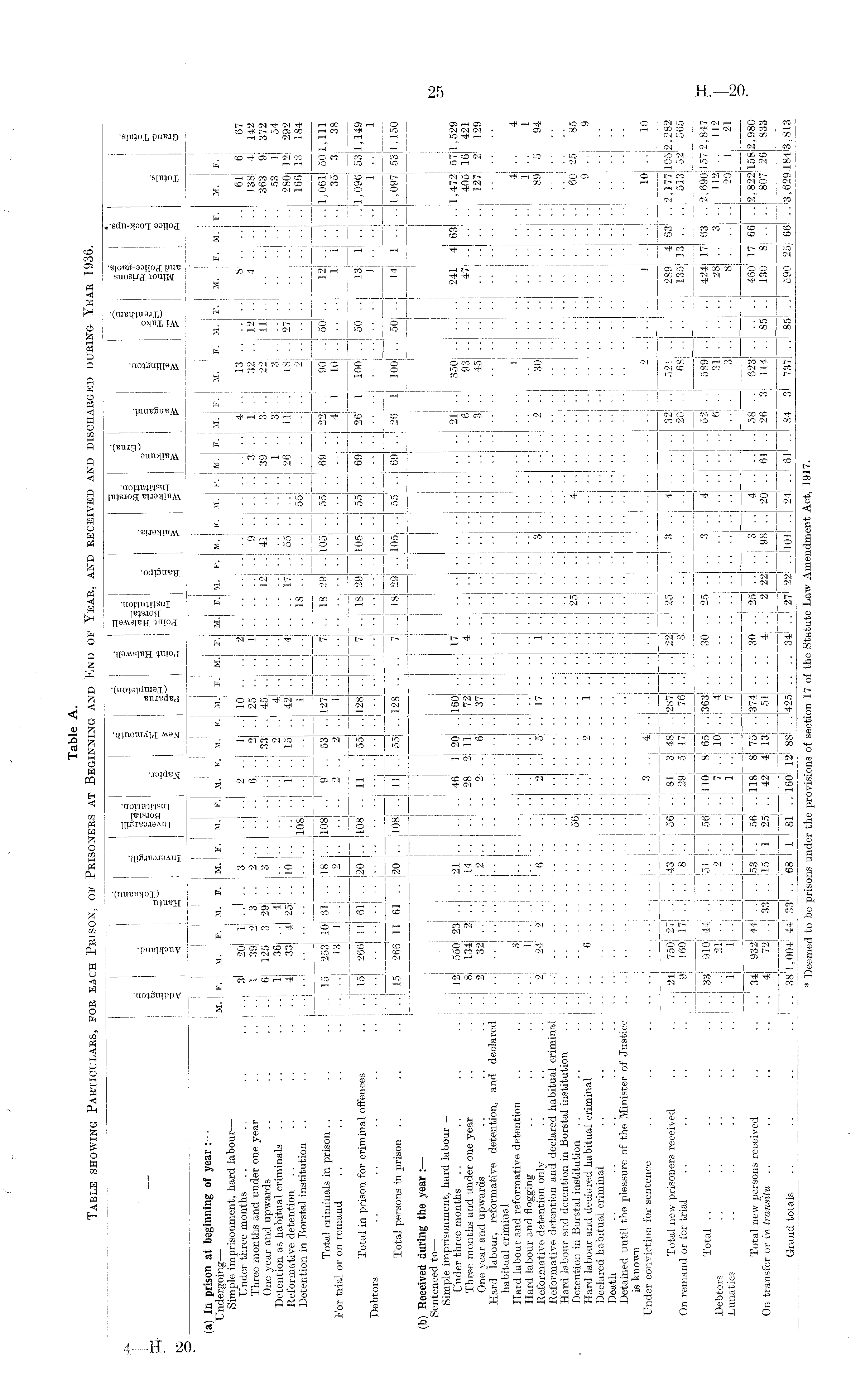 Table A. Table showing Particulars, for each Prison, of Prisoners at Beginning and End of Year, and received and discharged during Year 1936.
