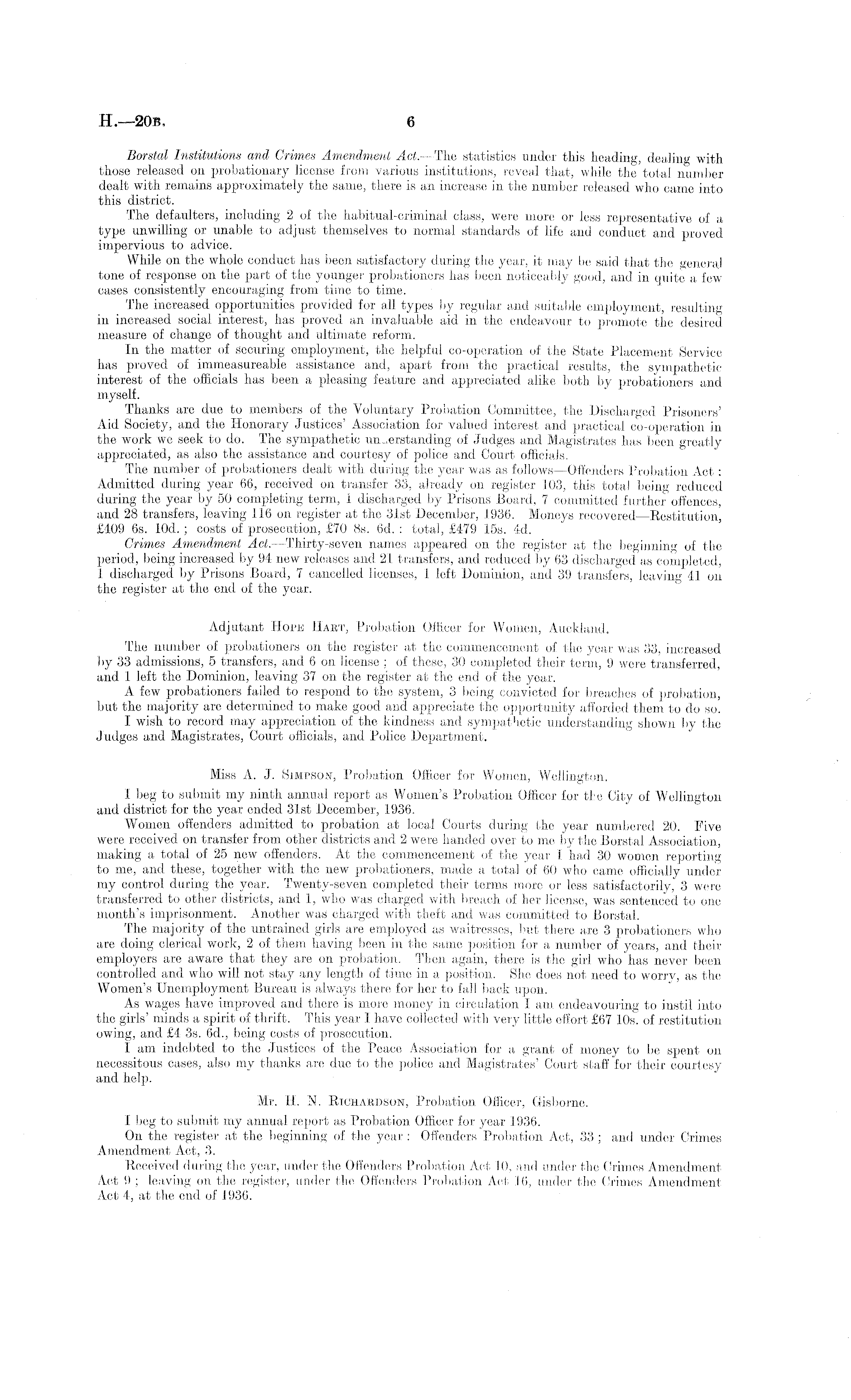 Borstal Institutions and Crimes Amendment Act. —The statistics under this heading, dealing with those released on probationary license from various institutions, reveal that, while the total number dealt with remains approximately the same, there is an increase in the number released who came into this district. The defaulters, including 2 of the habitual-criminal class, were more or less representative of a type unwilling or unable to adjust themselves to normal standards of life and conduct and proved impervious to advice. While on the whole conduct has been satisfactory during the year, it may be said that the general tone of response 011 the part of the younger probationers has been noticeably good, and in quite a few cases consistently encouraging from time to time. The increased opportunities provided for all types by regular and suitable employment, resulting in increased social interest, has proved an invaluable aid in the endeavour to promote the desired measure of change of thought and ultimate reform. In the matter of securing employment, the helpful co-operation of the State Placement Service has proyed of immeasureable assistance and, apart from the practical results, the sympathetic interest of the officials has been a pleasing feature and appreciated alike both by probationers and myself. Thanks are due to members of the Voluntary Probation Committee, the Discharged Prisoners' Aid Society, and the Honorary Justices' Association for valued interest and practical co-operation in the work we seek to do. The sympathetic understanding of Judges and Magistrates has been greatly appreciated, as also the assistance and courtesy of police and Court officials. The number of probationers dealt with during the year was as follows—Offenders Probation Act : Admitted during year 66, received on transfer 33, already on register 103, this total being reduced during the year by 50 completing term, 1 discharged by Prisons Board, 7 committed further offences, and 28 transfers, leaving 116 on register at the 31st December, 1936. Moneys recovered—Restitution, £409 6s. lOd. ; costs of prosecution, £70 Bs. 6d. : total, £479 15s. 4d. Crimes Amendment Act. —Thirty-seven names appeared on the register at the beginning of the period, being increased by 94 new releases and 21 transfers, and reduced by 63 discharged as completed, 1 discharged by Prisons Board, 7 cancelled licenses, 1 left Dominion, and 39 transfers, leaving 41 011 the register at the end of the year. Adjutant Hope Hart, Probation Officer for Women, Auckland. The number of probationers on the register at the commencement of the year was 33, increased by 33 admissions, 5 transfers, and 6 on license ; of these, 30 completed their term, 9 were transferred, and 1 left the Dominion, leaving 37 on the register at the end of the year. A few probationers failed to respond to the system, 3 being convicted for breaches of probation, but the majority are determined to make good and appreciate the opportunity afforded them to do so. I wish to record may appreciation of the kindness and sympathetic understanding shown by the Judges and Magistrates, Court officials, and Police Department. Miss A. J. Simpson, Probation Officer for Women, Wellington. I beg to submit my ninth annual report as Women's Probation Officer for the City of Wellington and district for the year ended 31st December, 1936. Women offenders admitted to probation at local Courts during the year numbered 20. Five were received on transfer from other districts and 2 were handed over to me by the Borstal Association, making a total of 25 new offenders. At the commencement of the year [ had 30 women reporting to me, and these, together with the new probationers, made a total of 60 who came officially under my control during the year. Twenty-seven completed their terms more or less satisfactorily, 3 were transferred to other districts, and 1, who was charged with breach of her license, was sentenced to one month's imprisonment. Another was charged with, theft and was committed to Borstal. The majority of the untrained girls are employed as waitresses, but there are 3 probationers who are doing clerical work, 2 of them having been in the same position for a number of years, and their employers are aware that they are on probation. Then again, there is the girl who has never been controlled and who will not stay any length of time in a position. She does not need to worry, as the Women's Unemployment Bureau is always there for her to fall back upon. As wages have improved and there is more money in circulation I am endeavouring to instil into the girls' minds a spirit of thrift. This year I have collected with very little effort £67 10s. of restitution owing, and £4 3s. 6d., being costs of prosecution. I am indebted to the Justices of the Peace Association for a grant of money to be spent on necessitous cases, also my thanks are due to the police and Magistrates' Court staff for their courtesy and help. Mr. H. N. Richardson, Probation Officer, Gisborne. I beg to submit my annual report as Probation Officer for year 1936. On the register at the beginning of the year : Offenders Probation Act, 33 ; and under Crimes Amendment Act, 3. Received during the year, under the Offenders Probation Act 10, and under the Crimes Amendment Act 9 ; leaving 011 the register, under the Offenders Probation Act 16, under the Crimes Amendment Act 4, at the end of 1936.