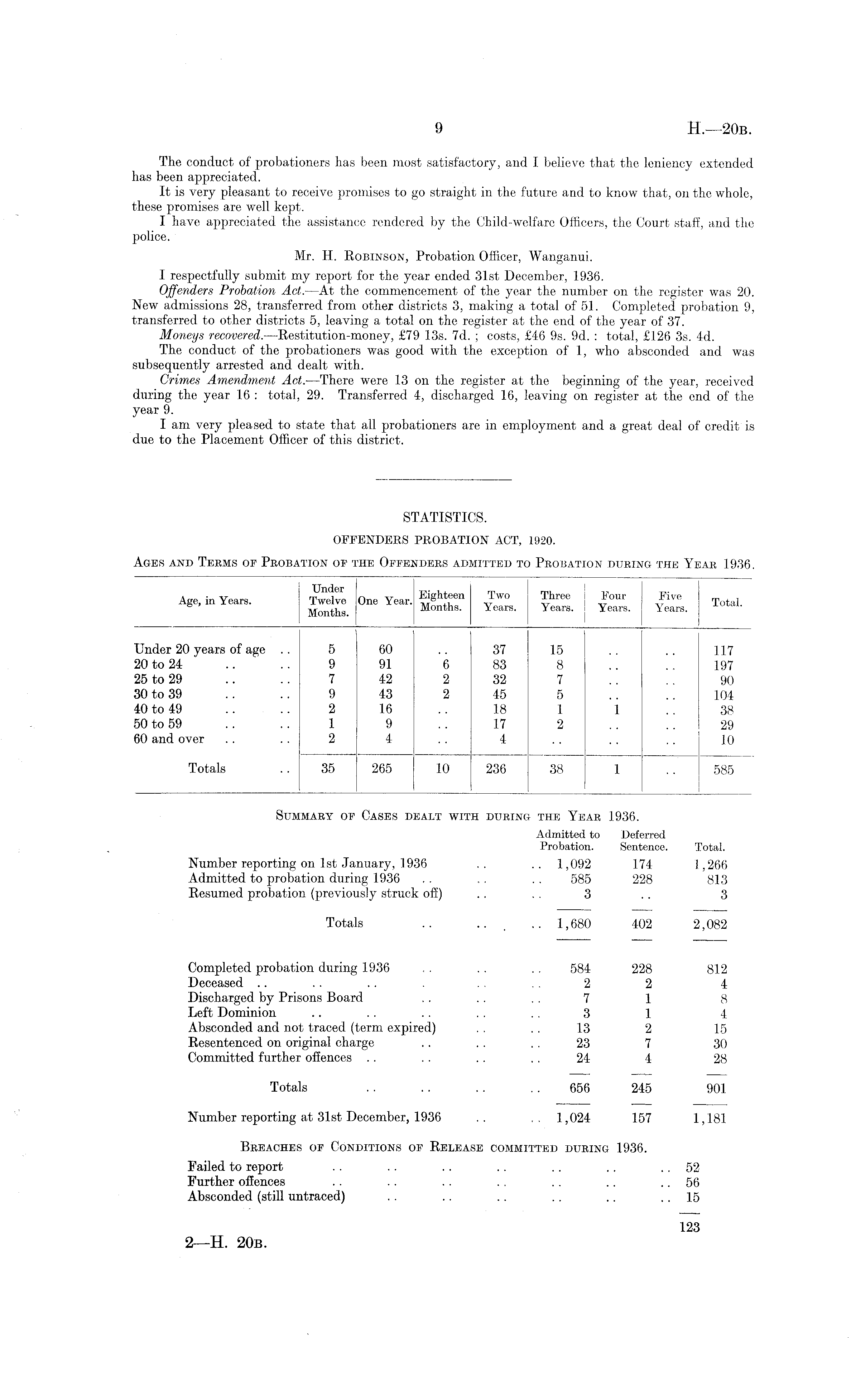 The conduct of probationers has been most satisfactory, and I believe that the leniency extended has been appreciated. It is very pleasant to receive promises to go straight in the future and to know that, on the whole, these promises are well kept. I have appreciated the assistance rendered by the Child-welfare Officers, the Court staff, and the police. Mr. H. Robinson, Probation Officer, Wanganui. I respectfully submit my report for the year ended 31st December, 1936. Offenders Probation Act. —At the commencement of the year the number on the register was 20. New admissions 28, transferred from other districts 3, making a total of 51. Completed probation 9, transferred to other districts 5, leaving a total on the register at the end of the year of 37. Moneys recovered. —Restitution-money, £79 13s. 7d. ; costs, £46 9s. 9d. : total, £126 3s. 4d. The conduct of the probationers was good with the exception of 1, who absconded and was subsequently arrested and dealt with. Crimes Amendment Act.—There were 13 on the register at the beginning of the year, received during the year 16 : total, 29. Transferred 4, discharged 16, leaving on register at the end of the year 9. I am very pleased to state that all probationers are in employment and a great deal of credit is due to the Placement Officer of this district.