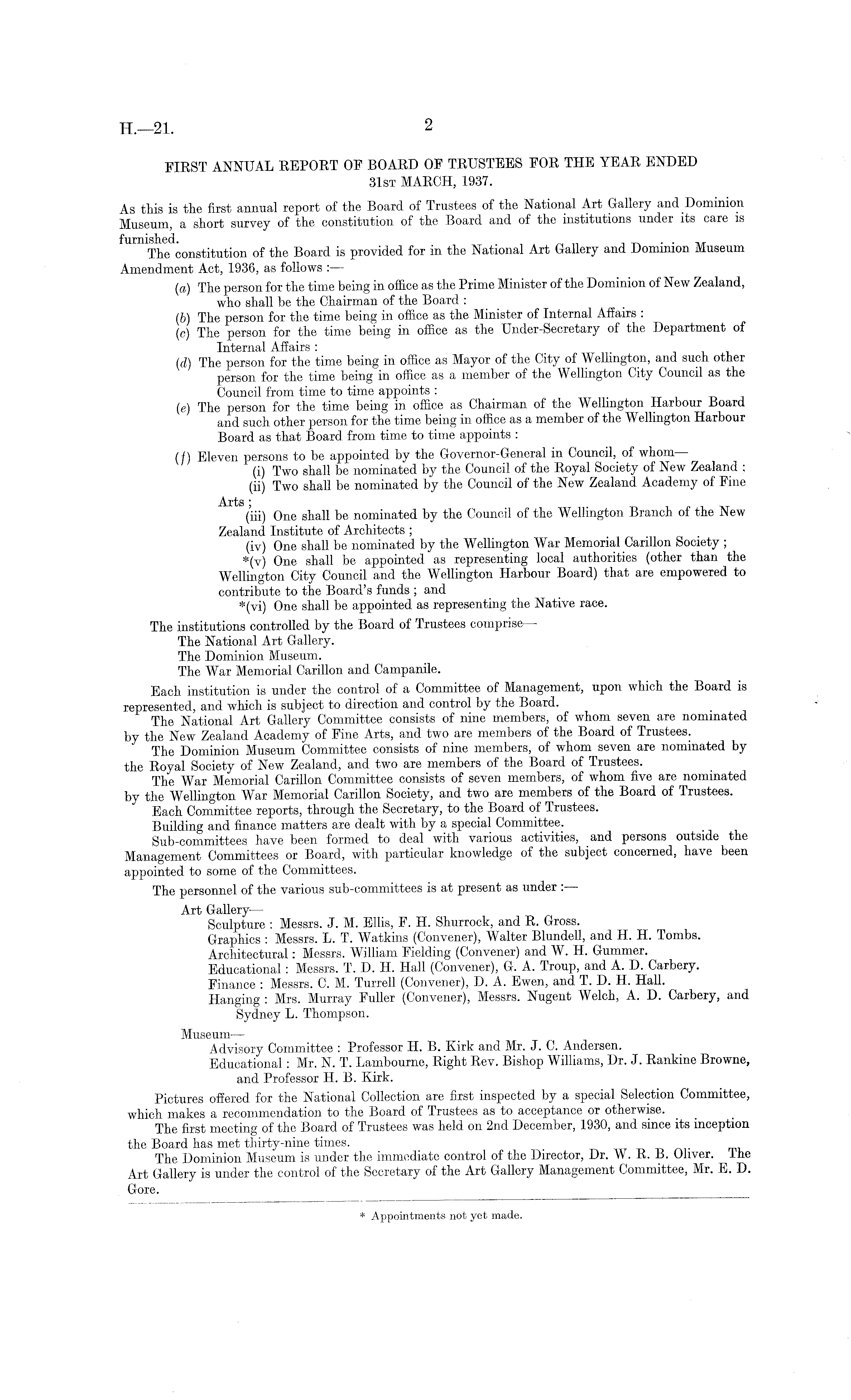 FIRST ANNUAL REPORT OF BOARD OF TRUSTEES FOR THE YEAR ENDED 31st MARCH, 1937. As this is the first annual report of the Board of Trustees of the National Art Gallery and Dominion Museum, a short survey of the constitution of the Board and of the institutions under its care is furnished. . . .. The constitution of the Board is provided for in the National Art Gallery and Dominion Museum Amendment Act, 1936, as follows : — (а) The person for the time being in office as the Prime Minister of the Dominion of New Zealand, who shall be the Chairman of the Board : (б) The person for the time being in office as the Minister of Internal Affairs : (c) The person for the time being in office as the Under-Secretary of the Department of Internal Affairs : (d) The person for the time being in office as Mayor of the City of Wellington, and such other person for the time being in office as a member of the Wellington City Council as the Council from time to time appoints : (e) The person for the time being in office as Chairman of the Wellington Harbour Board and such other person for the time being in office as a member of the Wellington Harbour Board as that Board from time to time appoints : (/) Eleven persons to be appointed by the Governor-General in Council, of whom— (i) Two shall be nominated by the Council of the Royal Society of New Zealand ; (ii) Two shall be nominated by the Council of the New Zealand Academy of Fine Arts ; (iii) One shall be nominated by the Council of the Wellington Branch of the New Zealand Institute of Architects ; (iv) One shall be nominated by the Wellington War Memorial Carillon Society ; *(v) One shall be appointed as representing local authorities (other than the Wellington City Council and the Wellington Harbour Board) that are empowered to contribute to the Board's funds ; and *(vi) One shall be appointed as representing the Native race. The institutions controlled by the Board of Trustees comprise The National Art Gallery. The Dominion Museum. The War Memorial Carillon and Campanile. Each institution is under the control of a Committee of Management, upon which the Board is represented, and which is subject to direction and control by the Board. The National Art Gallery Committee consists of nine members, of whom seven are nominated by the New Zealand Academy of Fine Arts, and two are members of the Board of Trustees. The Dominion Museum Committee consists of nine members, of whom seven are nominated by the Royal Society of New Zealand, and two are members of the Board of Trustees. The War Memorial Carillon Committee consists of seven members, of whom five are nominated by the Wellington War Memorial Carillon Society, and two are members of the Board of Trustees. Each Committee reports, through the Secretary, to the Board of Trustees. Building and finance matters are dealt with by a special Committee. Sub-committees have been formed to deal with various activities, and persons outside the Management Committees or Board, with particular knowledge of the subject concerned, have been appointed to some of the Committees. The personnel of the various sub-committees is at present as under Art Gallery — Sculpture : Messrs. J. M. Ellis, F. H. Shurrock, and R. Gross. Graphics : Messrs. L. T. Watkins (Convener), Walter Blundell, and H. H. Tombs. Architectural: Messrs. William Fielding (Convener) and W. H. Gummer. Educational : Messrs. T. D. H. Hall (Convener), G. A. Troup, and A. D. Carbery. Finance : Messrs. C. M. Turrell (Convener), D. A. Ewen, and T. D. H. Hall. Hanging : Mrs. Murray Fuller (Convener), Messrs. Nugent Welch, A. D. Carbery, and Sydney L. Thompson. Museum — Advisory Committee : Professor H. B. Kirk and Mr. J. C. Andersen. Educational: Mr. N. T. Lambourne, Right Rev. Bishop Williams, Dr. J. Rankine Browne, and Professor H. B. Kirk. Pictures offered for the National Collection are first inspected by a special Selection Committee, which makes a recommendation to the Board of Trustees as to acceptance or otherwise. The first meeting of the Board of Trustees was held on 2nd December, 1930, and since its inception the Board has met thirty-nine times. The Dominion Museum is under the immediate control of the Director, Dr. W. R. B. Oliver. Ihe Art Gallery is under the control of the Secretary of the Art Gallery Management Committee, Mr. E. D. Gore.