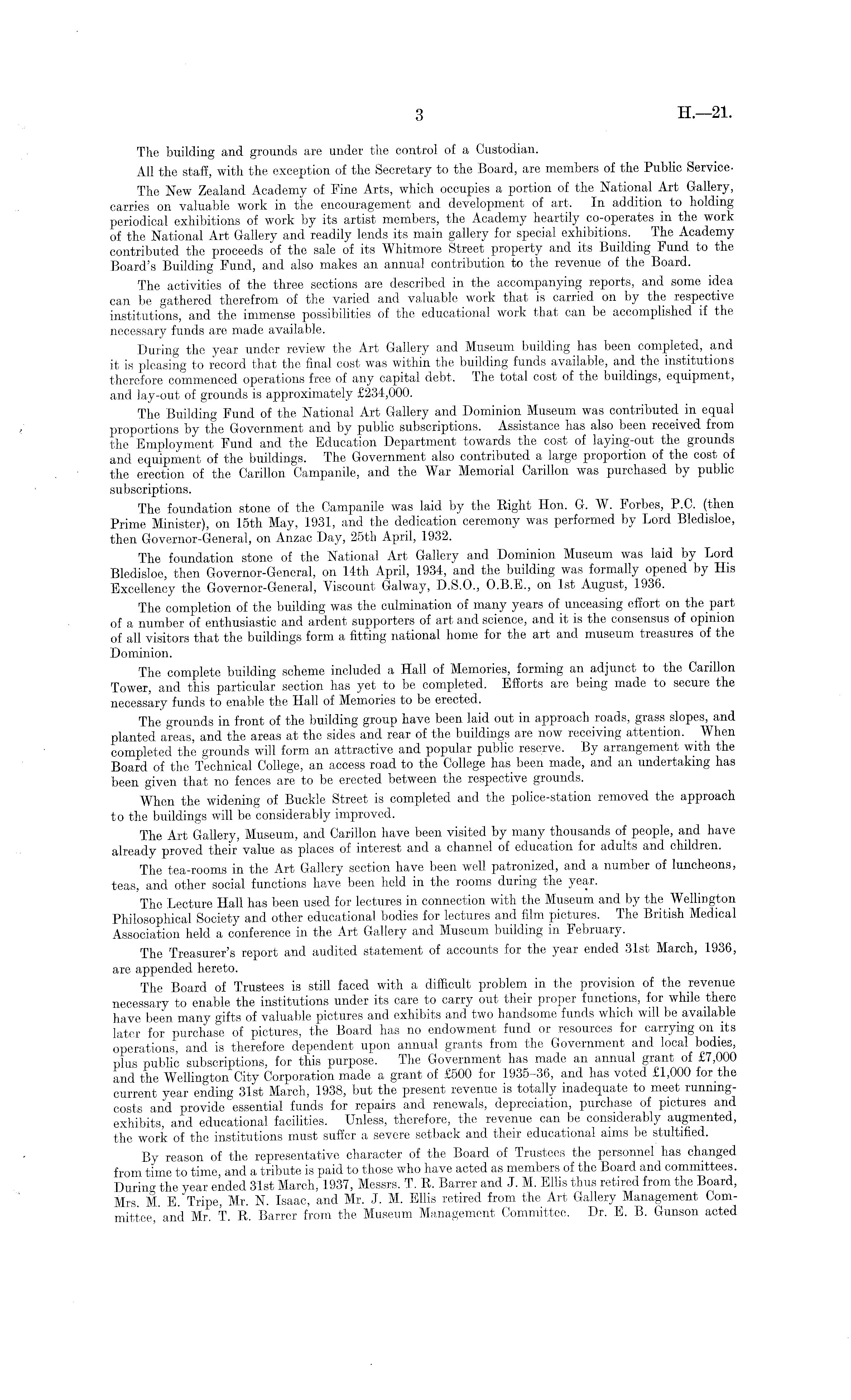The building and grounds are under the control of a Custodian. All the staff, with the exception of the Secretary to the Board, are members of the Public Service. The New Zealand Academy of Fine Arts, which occupies a portion of the National Art Gallery, carries on valuable work in the encouragement and development of art. In addition to holding periodical exhibitions of work by its artist members, the Academy heartily co-operates in the work of the National Art Gallery and readily lends its main gallery for special exhibitions. The Academy contributed the proceeds of the sale of its Whitmore Street property and its Building Fund to the Board's Building Fund, and also makes an annual contribution to the revenue of the Board. The activities of the three sections are described in the accompanying reports, and some idea can be gathered therefrom of the varied and valuable work that is carried on by the respective institutions, and the immense possibilities of the educational work that can be accomplished if the necessary funds are made available. During the year under review the Art Gallery and Museum building has been completed, and it is pleasing to record that the final cost was within the building funds available, and the institutions therefore commenced operations free of any capital debt, the total cost of the buildings, equipment, and lay-out of grounds is approximately £234,000. The Building Fund of the National Art Gallery and Dominion Museum was contributed in equal proportions by the Government and by public subscriptions. Assistance has also been received from the Employment Fund and the Education Department towards the cost of laying-out the grounds and equipment of the buildings. The Government also contributed a large proportion of the cost of the erection of the Carillon Campanile, and the War Memorial Carillon was purchased by public subscriptions. The foundation stone of the Campanile was laid by the Bight Hon. G. W. Forbes, P.C. (then Prime Minister), on 15tli May, 1931, and the dedication ceremony was performed by Lord Bledisloe, then Governor-General, on Anzac Day, 25th April, 1932. The foundation stone of the National Art Gallery and Dominion Museum was laid by Lord Bledisloe, then Governor-General, on 14th April, 1934, and the building was formally opened by His Excellency the Governor-General, Viscount Galway, D.5.0., 0.8. E., on Ist August, 1936. The completion of the building was the culmination of many years of unceasing effort on the part of a number of enthusiastic and ardent supporters of art and science, and it is the consensus of opinion of all visitors that the buildings form a fitting national home for the art and museum treasures of the Dominion. The complete building scheme included a Hall of Memories, forming an adjunct to the Carillon Tower, and this particular section has yet to be completed. Efforts are being made to secure the necessary funds to enable the Hall of Memories to be erected. The grounds in front of the building group have been laid out in approach roads, grass slopes, and planted areas, and the areas at the sides and rear of the buildings are now receiving attention. When completed the grounds will form an attractive and popular public reserve. By arrangement with the Board of the Technical College, an access road to the College has been made, and an undertaking has been given that no fences are to be erected between the respective grounds. When the widening of Buckle Street is completed and the police-station removed the approach to the buildings will be considerably improved. The Art Gallery, Museum, and Carillon have been visited by many thousands of people, and have already proved their' value as places of interest and a channel of education for adults and children. The tea-rooms in the Art Gallery section have been well patronized, and a number of luncheons, teas, and other social functions have been held in the rooms during the year. The Lecture Hall has been used for lectures in connection with the Museum and by the Wellington Philosophical Society and other educational bodies for lectures and film pictures. The British Medical Association held a conference in the Art Gallery and Museum building in February. The Treasurer's report and audited statement of accounts for the year ended 31st March, 1936, are appended hereto. The Board of Trustees is still faced with a difficult problem in the provision of the revenue necessary to enable the institutions under its care to carry out their proper functions, for while there have been many gifts of valuable pictures and exhibits and two handsome funds which will be available later for purchase of pictures, the Board has no endowment fund or resources for carrying on its operations, and is therefore dependent upon annual grants from the Government and local bodies, plus public subscriptions, for this purpose. The Government has made an annual grant of £7,000 and the Wellington City Corporation made a grant of £500 for 1935-36, and has voted £1,000 for the current year ending 31st March, 1938, but the present revenue is totally inadequate to meet runningcosts and provide essential funds for repairs and renewals, depreciation, purchase of pictures and exhibits, and educational facilities. Unless, therefore, the revenue can be considerably augmented, the work of the institutions must suffer a severe setback and their educational aims be stultified. By reason of the representative character of the Board of Trustees the personnel has changed from time to time, and a tribute is paid to those who have acted as members of the Board and committees. During the year ended 3'lst March, 1937, Messrs. T. R. Barrer and J. M. Ellis thus retired from the Board, Mrs. M. E. Tripe, Mr. N. Isaac, and Mr. J. M. Ellis retired from the Art Gallery Management Committee, and Mr. T. R. Barrer from the Museum Management Committee. Dr. E. B. Gunson acted