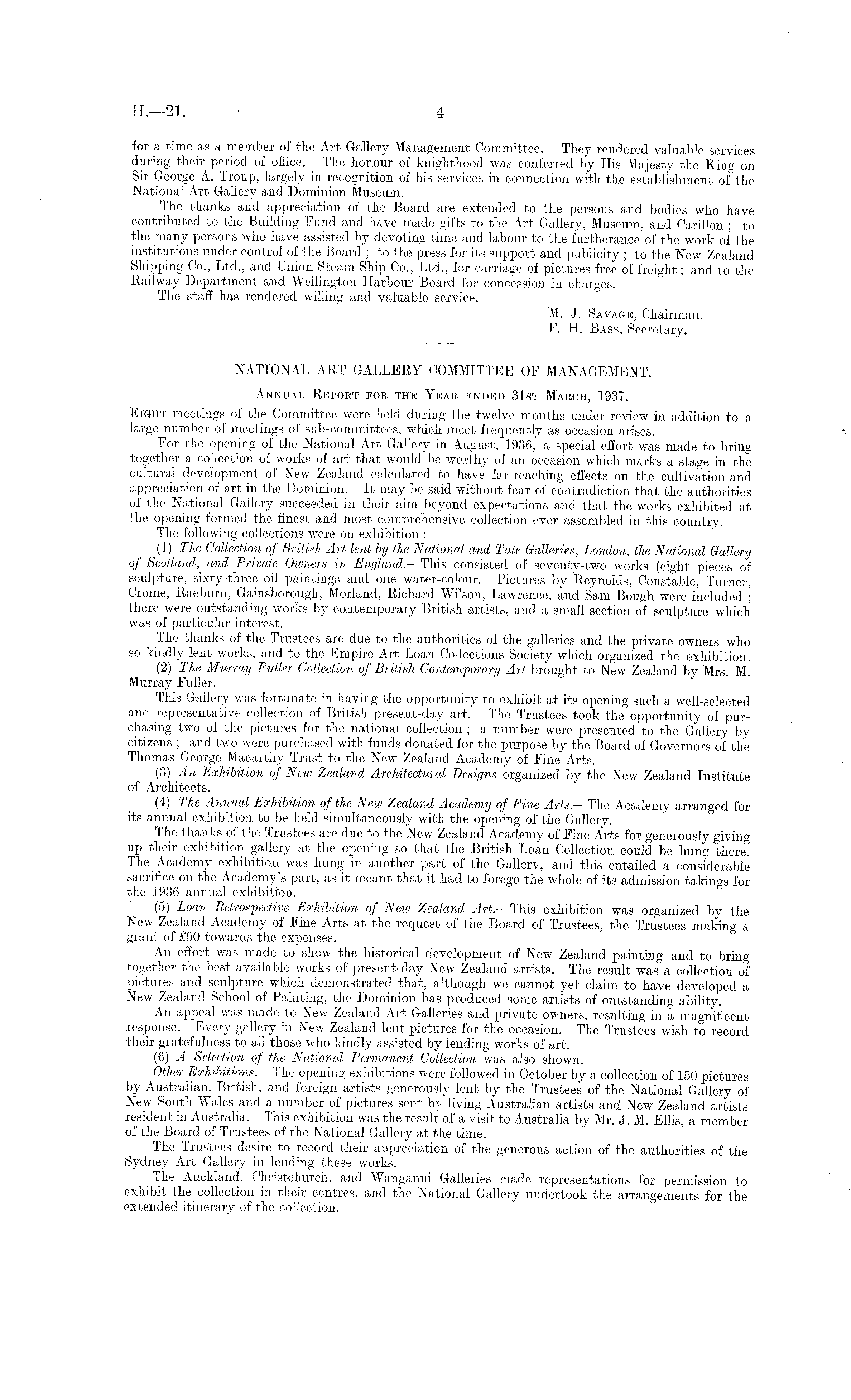 for a time as a member of the Art Gallery Management Committee. They rendered valuable services during their period of office. The honour of knighthood was conferred by His Majesty the King on Sir George A. Troup, largely in recognition of his services in connection with the establishment of the National Art Gallery and Dominion Museum. The thanks and appreciation of the Board are extended to the persons and bodies who have contributed to the Building Fund and have made gifts to the Art Gallery, Museum, and Carillon ; to the many persons who have assisted by devoting time and labour to the furtherance of the work of the institutions under control of the Board ; to the press for its support and publicity ; to the New Zealand Shipping Co., Ltd., and Union Steam Ship Co., Ltd., for carriage of pictures free of freight; and to the Railway Department and Wellington Harbour Board for concession in charges. The staff has rendered willing and valuable service. M. J. Savage, Chairman. F. H. Bass, Secretary.