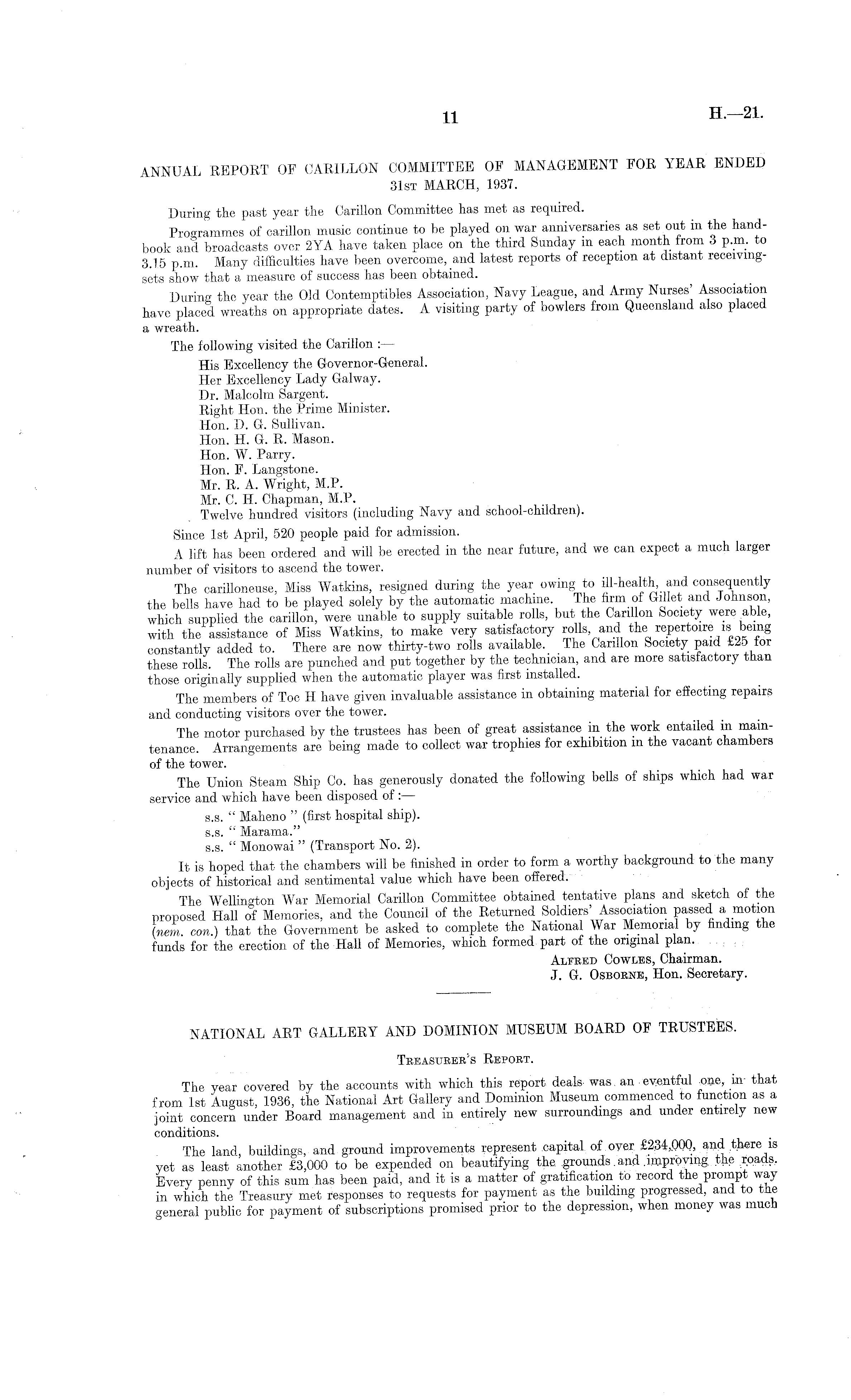 NATIONAL ART GALLERY AND DOMINION MUSEUM BOARD OF TRUSTEES. Treasurer's Report. The year covered by the accounts with which this report deals was an eventful «ne, iir that from Ist August, 1936, the National Art Gallery and Dominion Museum commenced to function as a joint concern under Board management and in entirely new surroundings and under entirely new conditions. The land, buildings, and ground improvements represent capital of over £234,000, and there is yet as least another £3,000 to be expended on beautifying the .grounds.and .improving, the roads. Every penny of this sum has been paid, and it is a matter of gratification to record the prompt way in which the Treasury met responses to requests for payment as the building progressed, and to the general public for payment of subscriptions promised prior to the depression, when money was much