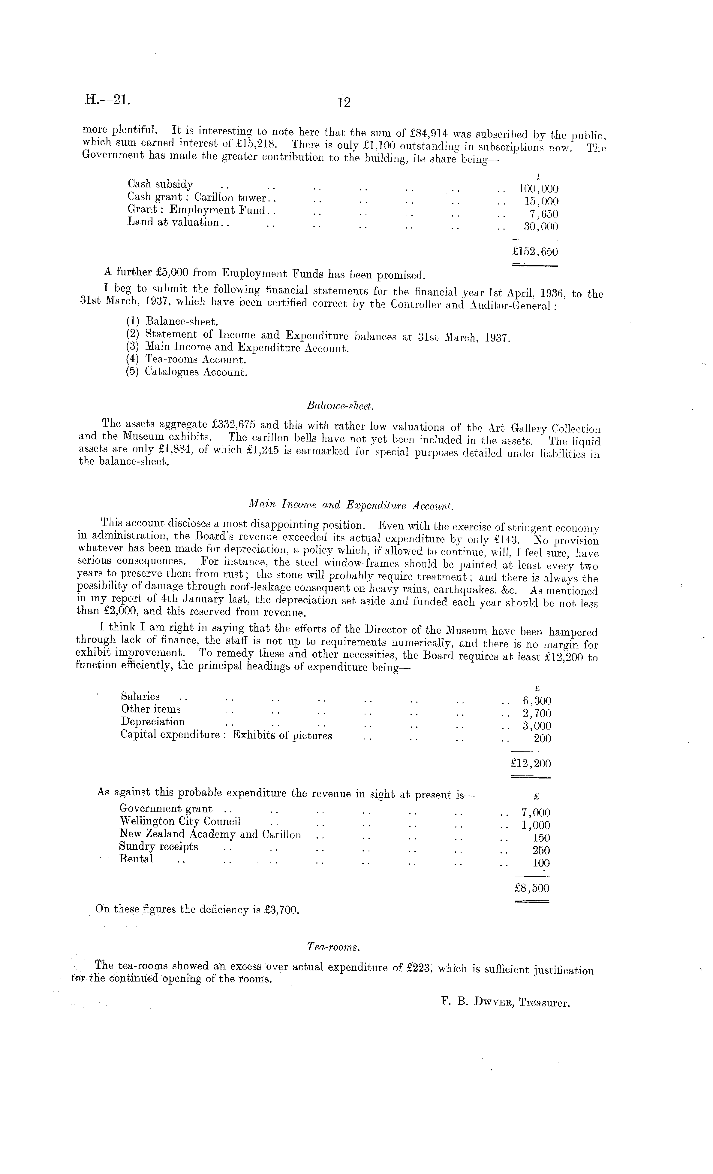 more plentiful. It is interesting to note here that the sum of £84,914 was subscribed by the public which sum earned interest of £15,218. There is only £1,100 outstanding in subscriptions now. The (government has made the greater contribution to the building, its share being— £ Cash subsidy 100)000 Lash grant : Carillon tower.. . . . . .. 25 qqq Grant: Employment Fund. . . . . . .. 7' 550 Land at valuation.. .. .. . . 3Q' qqq £152,650 A further £5,000 from Employment Funds has been promised. I beg to submit the following financial statements for the financial year Ist April, 1936 to the 31st March, 1937, which have been certified correct by the Controller and Auditor-General (1) Balance-sheet. (2) Statement of Income and Expenditure balances at 31st March, 1937. (3) Main Income and Expenditure Account. (4) Tea-rooms Account. (5) Catalogues Account. Balance-sheet. The assets aggregate £332,675 and this with rather low valuations of the Art Gallery Collection and the Museum exhibits. The carillon bells have not yet been included in the assets. The liquid assets are only £1,884, of which £1,245 is earmarked for special purposes detailed under liabilities in the balance-sheet. Main Income and Expenditure Account. _ This account discloses a most disappointing position. Even with the exercise of stringent economy 111 administration, the Board's revenue exceeded its actual expenditure by only £143. No provision whatever has been made for depreciation, a policy which, if allowed to continue, will, I feel sure, have serious consequences, lor instance, the steel window-frames should be painted at least every two years to preserve them from rust; the stone will probably require treatment; and there is always the possibility of damage through roof-leakage consequent on heavy rains, earthquakes, &c. As mentioned m my report of 4th January last, the depreciation set aside and funded each year should be not less than £2,000, and this reserved from revenue. I think I am right in saying that the efforts of the Director of the Museum have been hampered through lack of finance, the staff is not up to requirements numerically, and there is no margin for exhibit improvement. To remedy these and other necessities, the Board requires at least £12,200 to function efficiently, the principal headings of expenditure being— Salaries Other items .. .. .. ~ ~ _ # 2 700 Depreciation .. .. .. .. . _ 3 000 Capital expenditure : Exhibits of pictures .. . . .. .. ' 200 £12,200 As against this probable expenditure the revenue in sight at present is— £ Government grant .. .. .. .. .. _ 7 qqq Wellington City Council .. .. .. .. l'ooo New Zealand Academy and Carillon .. . . . . .. ~ ' jgQ Sundry receipts .. .. .. .. .. 250 Rental .. .. .. .. ~ . £8,500 O'n these figures the deficiency is £3,700. Tea-rooms. The tea-rooms showed an excess over actual expenditure of £223, which is sufficient justification for the continued opening of the rooms. F. B. Dwyer, Treasurer.