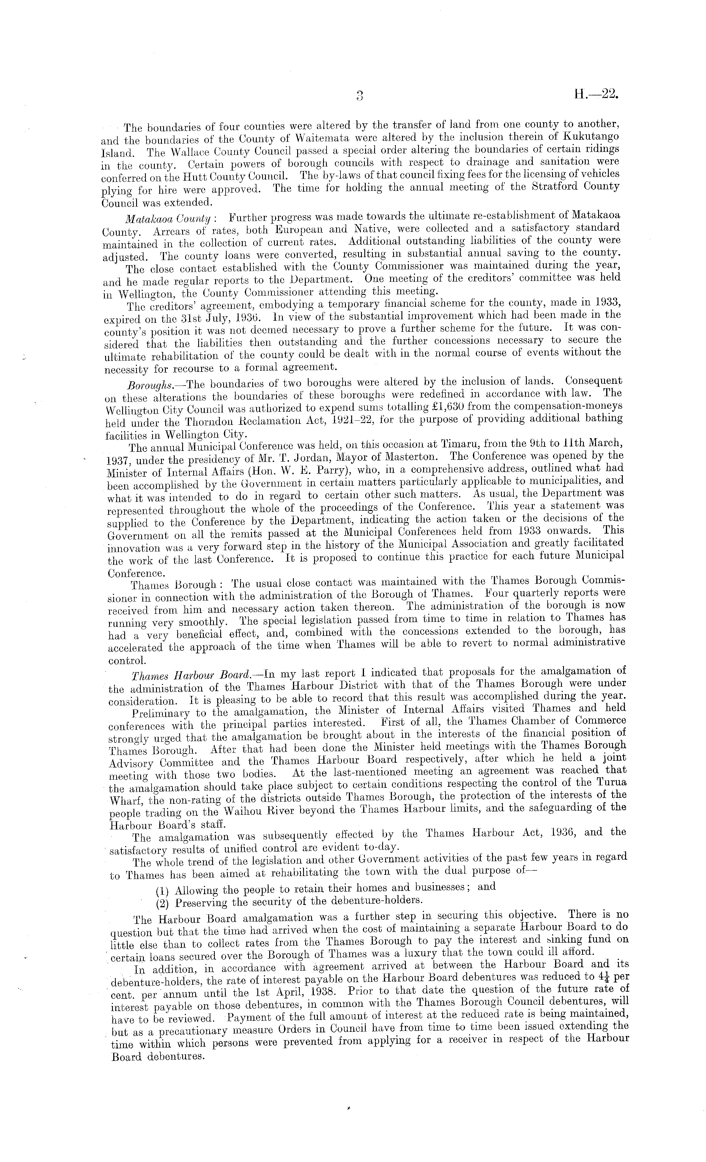 The boundaries of four counties were altered by the transfer of land from one county to another, and the boundaries of the County of Waitemata were altered by the inclusion therein of Kukutango Island. The Wallace County Council passed a special order altering the boundaries of certain ridings in the county. Certain powers of borough councils with respect to drainage and sanitation were conferred 011 the Hutt County Council. The by-laws of that council fixing fees for the licensing of vehicles plying for hire were approved. The time for holding the annual meeting of the Stratford County Council was extended. Matakaoa County : Further progress was made towards the ultimate re-establishment of Matakaoa County. Arrears of rates, both European and Native, were collected and a satisfactory standard maintained in the collection of current rates. Additional outstanding liabilities of the county were adjusted. The county loans were converted, resulting in substantial annual saving to the county. The close contact established with the County Commissioner was maintained during the year, and he made regular reports to the Department, One meeting of the creditors' committee was held in Wellington, the County Commissioner attending this meeting. The creditors' agreement, embodying a temporary financial scheme for the county, made in 1933, expired 011 the 31st July, 1936. In view of the substantial improvement which had been made in the county's position it was not deemed necessary to prove a further scheme for the future. It was considered that the liabilities then outstanding and the further concessions necessary to secure the ultimate rehabilitation of the county could be dealt with in the normal course of events without the necessity for recourse to a formal agreement. Boroughs. —The boundaries of two boroughs were altered by the inclusion of lands. Consequent 011 these alterations the boundaries of these boroughs were redefined in accordance with law. The Wellington City Council was authorized to expend sums totalling £1,630 from the compensation-moneys held under the Thorndon Reclamation Act, 1921-22, for the purpose of providing additional bathing facilities in Wellington City. . The annual Municipal Conference was held, on tins occasion at limaru, from the 9tn to lltn IVLarcn, 1937 under the presidency of Mr. T. Jordan, Mayor of Masterton. The Conference was opened by the Minister of Internal Aflairs (Hon. W. E. Parry), who, in a comprehensive address, outlined what had been accomplished by the Government in certain matters particularly applicable to municipalities, and what it was intended to do in regard to certain other such matters. As usual, the Department was represented throughout the whole of the proceedings of the Conference. This year a statement was supplied to the Conference by the Department, indicating the action taken or the decisions of the Government on all the remits passed at the Municipal Conferences held from 1933 onwards. This innovation was a very forward step 111 the history of the Municipal Association and greatly facilitated the work of the last Conference. It is proposed to continue this practice for each future Municipal Conference • Thames Borough • The usual close contact was maintained with the Thames Borough Commissioner in connection with the administration of the Borough of Thames. Four quarterly reports were received from him and necessary action taken thereon. The administration of the borough is now running very smoothly. The special legislation passed from time to time m relation to Thames has had a "very beneficial eflect, and, combined with the concessions extended to the borough, has accelerated" the approach of the time when Thames will be able to revert to normal administrative control. Thames Harbour Board—ln my last report I indicated that proposals for the amalgamation of the administration of the Thames Harbour District with that of the Thames Borough were under consideration It is pleasing to be able to record that this result was accomplished during the year Preliminary to the amalgamation, the Minister of Internal Affairs visited Thames and held conferences with the principal parties interested. First of all, the Thames Chamber of Commerce strongly urged that the amalgamation be brought about in the interests of the financial position of Thames Borough After that had been done the Minister held meetings with the Thames Borough Advisory Committee and the Thames Harbour Board respectively, after which he held a joint meeting with those two bodies. At the last-mentioned meeting an agreement was reached that the amalgamation should take place subject to certain conditions respecting the control of the lurua Wharf the non-rating of the districts outside Thames Borough, the protection of the interests of the people'trading on the Waihou River beyond the Thames Harbour limits, and the safeguarding of the Harbour Board's staff. , , . . Inoc , The amalgamation was subsequently effected by the lhames Harbour Act, 1936, and the satisfactory results of unified control are evident to-day. The whole trend of the legislation and other Government activities of the past few years m regard to Thames has been aimed at rehabilitating the town with the dual purpose of— (1) Allowing the people to retain their homes and businesses; and (2) Preserving the security of the debenture-holders. The Harbour Board amalgamation was a further step in securing this objective. There is no question but that the time had arrived when the cost of maintaining a separate Harbour Board to do little else than to collect rates from the Thames Borough to pay the interest and sinking fund on certain loans secured over the Borough of Thames was a luxury that the town could ill afiord. In addition in accordance with agreement arrived at between the Harbour Board and its debenture-holders, the rate of interest payable on the Harbour Board debentures was reduced to 4| per cent, per