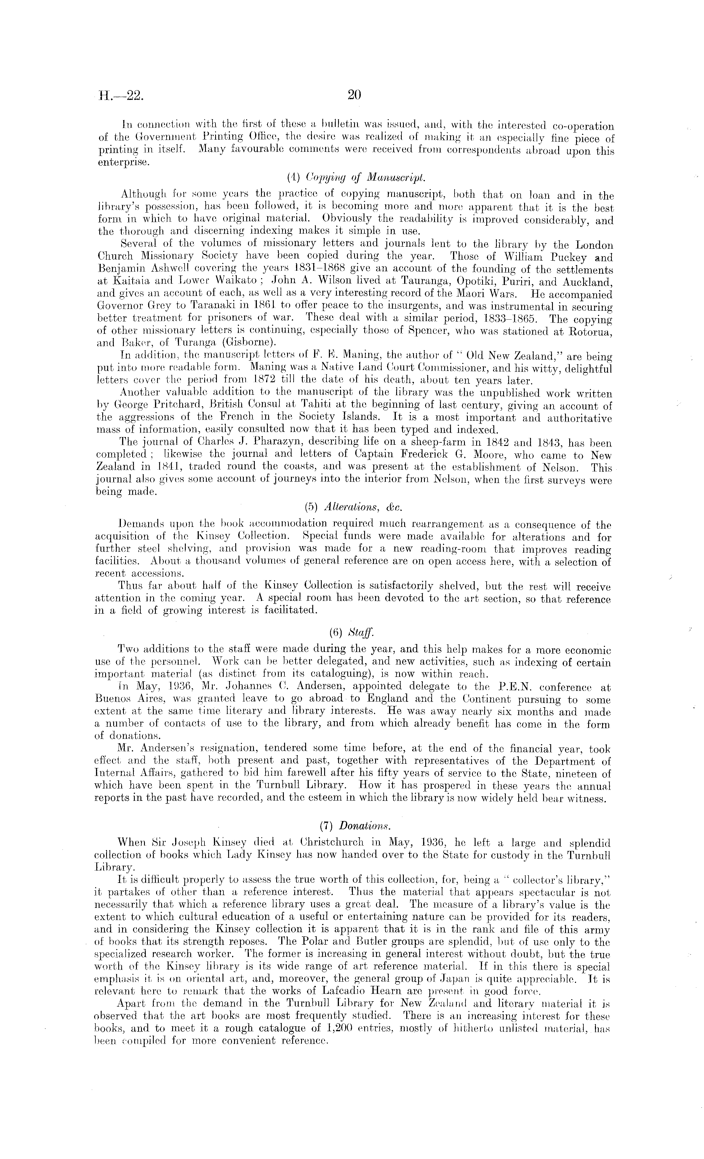In connection with the first of these a bulletin was issued, and, with the interested co-operation of the Government Printing Office, the desire was realized of making it an especially fine piece of printing in itself. Many favourable comments were received from correspondents abroad upon this enterprise. (4) Copying of Manuscript. Although for some years the practice of copying manuscript, both that on loan and in the library's possession, has been followed, it is becoming more and more apparent that it is the best form in which to have original material. Obviously the readability is improved considerably, and the thorough and discerning indexing makes it simple in use. Several of the volumes of missionary letters and journals lent to the library by the London Church Missionary Society have been copied during the year. Those of William Puckey and Benjamin Ashwell covering the years 1831-1868 give an account of the founding of the settlements at Kaitaia and Lower Waikato ; John A. Wilson lived at Tauranga, Opotiki, Puriri, and Auckland, and gives an account of each, as well as a very interesting record of the Maori Wars. He accompanied Governor Grey to Taranaki in 1861 to offer peace to the insurgents, and was instrumental in securing better treatment for prisoners of war. These deal with a similar period, 1833-1865. The copying of other missionary letters is continuing, especially those of Spencer, who was stationed at Rotorua, and Baker, of Turanga (Gisborne). In addition, the manuscript letters of F. E. Maning, the author of " Old New Zealand," are being put into more readable form. Maning was a Native Land Court Commissioner, and his witty, delightful letters cover the period from 1872 till the date of his death, about ten years later. Another valuable addition to the manuscript of the library was the unpublished work written by George Pritchard, British Consul at Tahiti at the beginning of last century, giving an account of the aggressions of the French in the Society Islands. It is a most important and authoritative mass of information, easily consulted now that it has been typed and indexed. The journal of Charles J. Pharazyn, describing life on a sheep-farm in 1842 and 1843, has been completed ; likewise the journal and letters of Captain Frederick G. Moore, who came to New Zealand in 1841, traded round the coasts, and was present at the establishment of Nelson. This journal also gives some account of journeys into the interior from Nelson, when the first surveys were being made. (5) Alterations, &c. Demands upon the book accommodation required much rearrangement as a consequence of the acquisition of the Kinsey Collection. Special funds were made available for alterations and for further steel shelving, and provision was made for a new reading-room that improves reading facilities. About a thousand volumes of general reference are on open access here, with a selection of recent accessions. Thus far about half of the Kinsey Collection is satisfactorily shelved, but the rest will receive attention in the coming year. A special room has been devoted to the art section, so that reference in a field of growing interest is facilitated. (6) Staff. Two additions to the staff were made during the year, and this help makes for a more economic use of the personnel. Work can be better delegated, and new activities, such as indexing of certain important material (as distinct from its cataloguing), is now within reach. In May, 1936, Mr. Johannes C. Andersen, appointed delegate to the P.E.N, conference at Buenos Aires, was granted leave to go abroad to England and the Continent pursuing to some extent at the same time literary and library interests. He was away nearly six months and made a number of contacts of use to the library, and from which already benefit has come in the form of donations. Mr. Andersen's resignation, tendered some time before, at the end of the financial year, took effect and the staff, both present and past, together with representatives of the Department of Internal Affairs, gathered to bid him farewell after his fifty years of service to the State, nineteen of which have been spent in the Turnbull Library. How it has prospered in these years the annual reports in the past have recorded, and the esteem in which the library is now widely held bear witness. (7) Donations. When Sir Joseph Kinsey died at Christchurch in May, 1936, he left a large and splendid collection of books which Lady Kinsey has now handed over to the State for custody in the Turnbull Library. It is difficult properly to assess the true worth of this collection, for, being a " collector's library," it partakes of other than a reference interest. Thus the material that appears spectacular is not necessarily that which a reference library uses a great deal. The measure of a library's value is the extent to which cultural education of a useful or entertaining nature can be provided for its readers, and in considering the Kinsey collection it is apparent that it is in the rank and file of this army of books that its strength reposes. The Polar and Butler groups are splendid, but of use only to the specialized research worker. The former is increasing in general interest without doubt, but the true worth of the Kinsey library is its wide range of art reference material. If in this there is special emphasis it is on, oriental art, and, moreover, the general group of Japan is quite appreciable. It is relevant here to remark that the works of Lafcadio Hearn are present in good force. Apart from the demand in the Turnbull Library for New Zealand and literary material it is observed that the art books are most frequently studied. There is an increasing interest for these books, and to meet it a rough catalogue of 1,200 entries, mostly of hitherto unlisted material, has been compiled for more convenient reference.