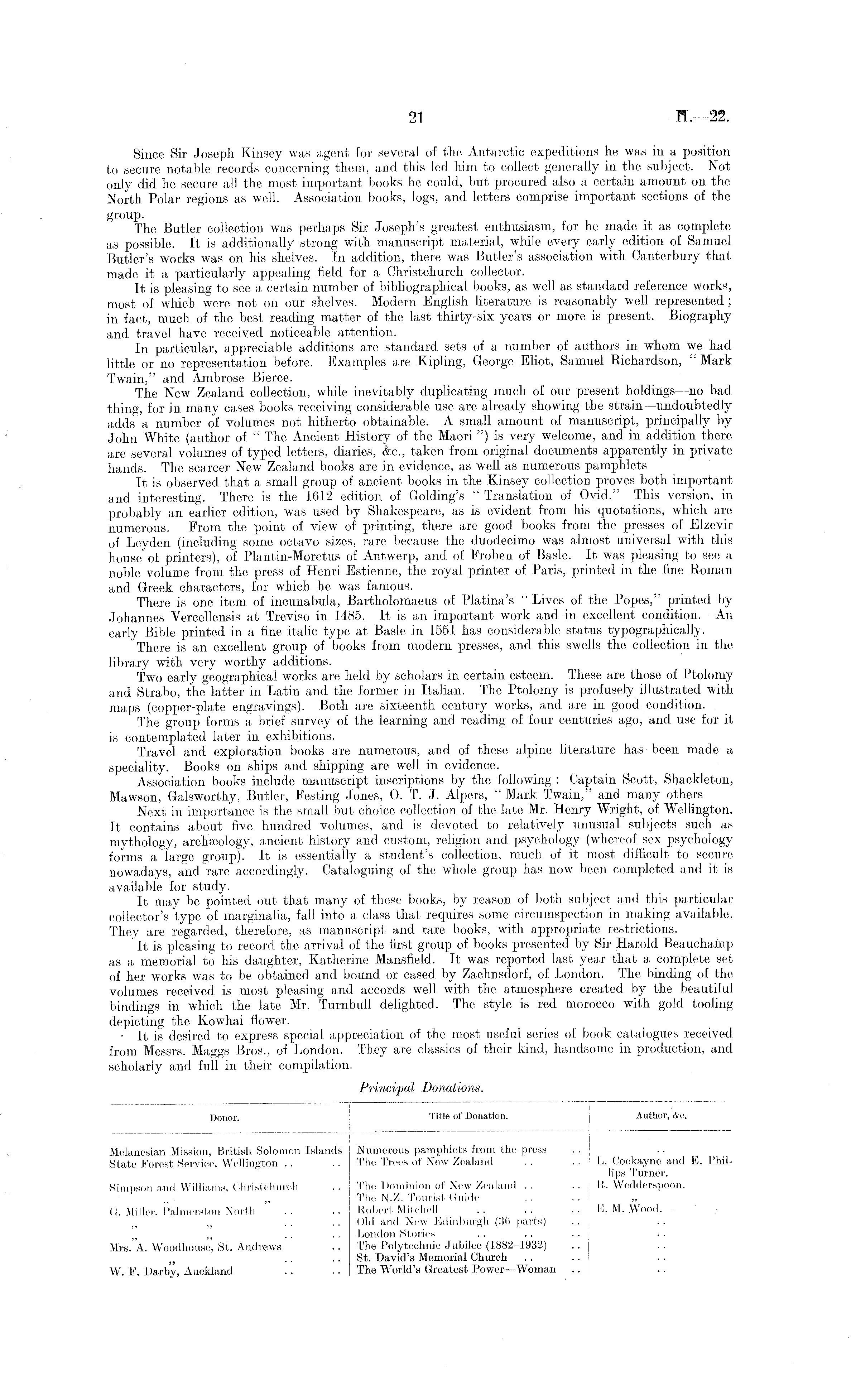 Since Sir Joseph. Kinsey was agent for several of tie Antarctic expeditions lie was in a position to secure notable records concerning them, and this led him to collect generally in the subject. Not only did he secure all the most important books he could, but procured also a certain amount on the North Polar regions'as well. Association books, logs, and letters comprise important sections of the group. The Butler collection was perhaps Sir Joseph's greatest enthusiasm, for he made it as complete as possible. It is additionally strong with manuscript material, while every- early edition of Samuel Butler's works was on his shelves. In addition, there was Butler's association with Canterbury that made it a particularly appealing field for a Christchurch collector. It is pleasing to see a certain number of bibliographical books, as well as standard reference works, most of which were not on our shelves. Modern English literature is reasonably well represented ; in fact, much of the best reading matter of the last thirty-six years or more is present. Biography and travel have received noticeable attention. In particular, appreciable additions are standard sets of a number of authors in whom we had little or no representation before. Examples are Kipling, George Eliot, Samuel Richardson, " Mark Twain," and Ambrose Bierce. The New Zealand collection, while inevitably duplicating much of our present holdings —no bad thing, for in many cases books receiving considerable use are already showing the strain —undoubtedly adds a number of volumes not hitherto obtainable. A small amount of manuscript, principally by John White (author of " The Ancient History of the Maori ") is very welcome, and in addition there are several volumes of typed letters, diaries, &c., taken from original documents apparently in private hands. The scarcer New Zealand books are in evidence, as well as numerous pamphlets It is observed that a small group of ancient books in the Kinsey collection proves both important and interesting. There is the 1612 edition of Golding's " Translation of Ovid." This version, in probably an earlier edition, was used by Shakespeare, as is evident from his quotations, which are numerous. From the point of view of printing, there are good books from the presses of Elzevir of Leyden (including some octavo sizes, rare because the duodecimo was almost universal with this house of printers), of Plantin-Moretus of Antwerp, and of Froben of Basle. It was pleasing to see a noble volume from the press of Henri Estienne, the royal printer of Paris, printed in the fine Roman and Greek characters, for which he was famous. There is one item of incunabula, Bartholomaeus of Platina's " Lives of the Popes," printed by Johannes Vercellensis at Treviso in 1485. It is an important work and in excellent condition. An early Bible printed in a fine italic type at Basle in 1551. has considerable status typographically. There is an excellent group of books from, modern presses, and this swells the collection in the library with very worthy additions. Two early geographical works are held by scholars in certain esteem. These are those of Ptolomy and Strabo, the latter in Latin and the former in Italian. The Ptolomy is profusely illustrated with maps (copper-plate engravings). Both are sixteenth century works, and are in good condition. The group forms a brief survey of the learning and reading of four centuries ago, and use for it is contemplated later in exhibitions. Travel and exploration books are numerous, and of these alpine literature has been made a speciality. Books on ships and shipping are well in evidence. Association books include manuscript inscriptions by the following : Captain Scott, Shackleton, Mawson, Galsworthy, Butler, Festing Jones, 0. T. J. Alpers, " Mark Twain," and many others Next in importance is the small but choice collection of the late Mr. Henry Wright, of Wellington. It contains about five hundred volumes, and is devoted to relatively unusual subjects such as mythology, archaeology, ancient history and custom, religion and psychology (whereof sex psychology forms a large group). It is essentially a student's collection, much of it most difficult to secure nowadays, and rare accordingly. Cataloguing of the whole group has now been completed and it is available for study. It may be pointed out that many of these books, by reason of both subject and this particular collector's type of marginalia, fall into a class that requires some circumspection in making available. They are regarded, therefore, as manuscript and rare books, with appropriate restrictions. It is pleasing to record the arrival of the first group of books presented by Sir Harold Beauchamp as a memorial to his daughter, Katherine Mansfield. It was reported, last year that a complete set of her works was to be obtained and bound or cased by Zaehnsdorf, of London. The binding of the volumes received is most pleasing and accords well with the atmosphere created by the beautiful bindings in which the late Mr. Turnbull delighted. The style is red morocco with gold tooling depicting the Ivowhai flower. • It is desired to express special appreciation of the most useful series of book catalogues received from Messrs. Maggs Bros., of London. They are classics of their kind, handsome in production, and scholarly and full in their compilation.