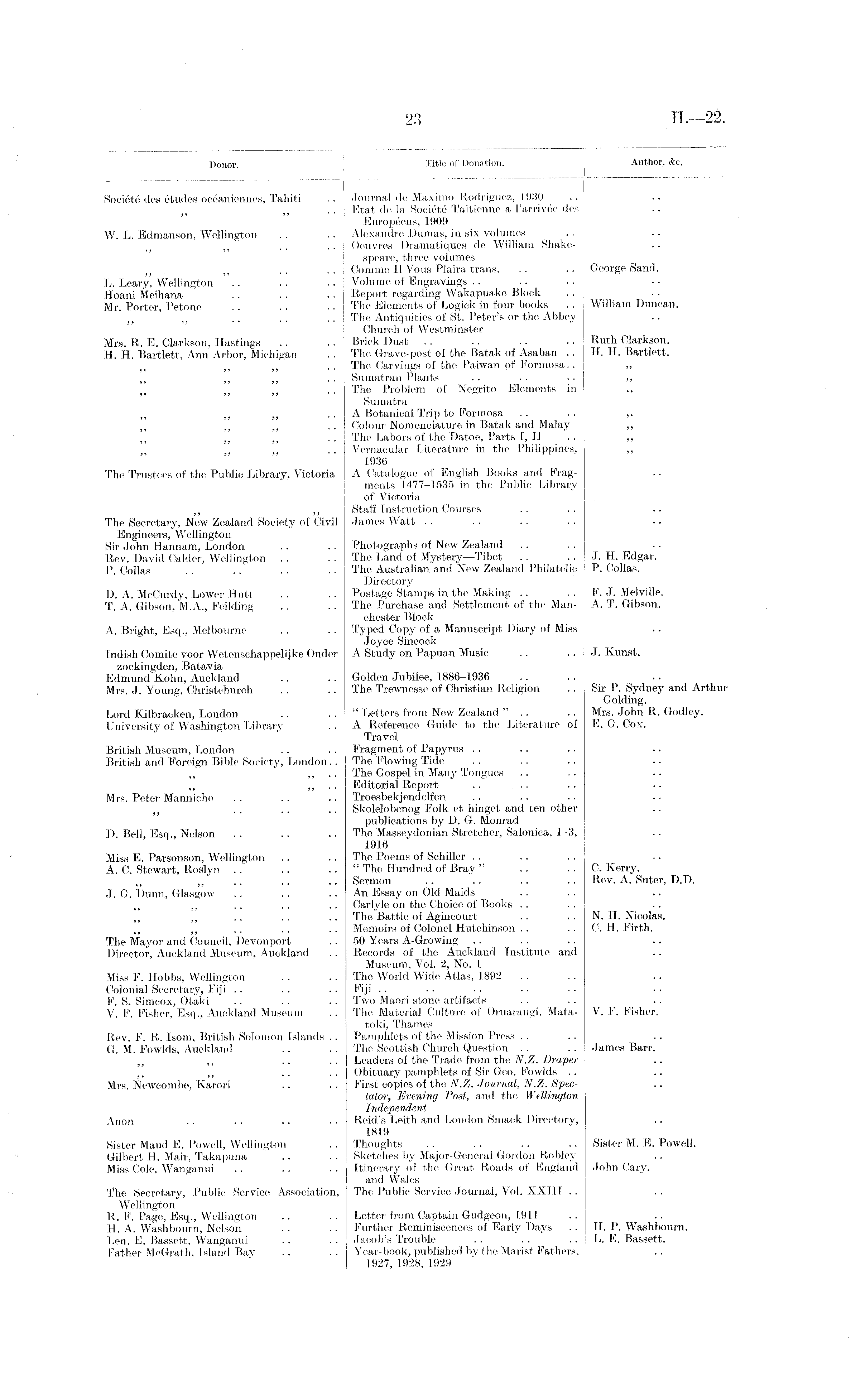 Donor. Title of Donation. Author, &c. Societe des etudes oceaniennes, Tahiti .. Journal de Maximo Rodriguez, 1930 Etat de la Societe Taitienne a l'arrivee des Europeens, 1909 W. L. Edmanson, Wellington . . ■ . Alexandre Dumas, in six volumes .. $ ,, .. .. Oeuvres Dramatiques de William Shakespeare, three volumes „ .. .. Comme II Vous Plaira trans. .. .. George Sand. L. Leary, Wellington .. .. .. Volume of Engravings Hoani Meihana .. . . . . Report regarding Wakapuake Block .. Mr. Porter, Petone .. . . . . The Elements of Logick in four books .. William Duncan. • ,, .. .. .. The Antiquities of St. Peter's or the Abbey Church of Westminster Mrs. R. E. Clarkson, Hastings . . .. Brick Dust . . . . . . .. Ruth Clarkson. H. H. Bartlett, Ann Arbor, Michigan . . The Grave-post of the Batak of Asaban . . H. H. Bartlett. ■ ,, .. The Carvings of the Paiwan of Formosa.. ,, s) ,, ,, . . Sumatran Plants .. • • .. ,, ,, ,, .. The Problem of Negrito Elements in ,, Sumatra )( ,, ,, A Botanical Trip to Formosa .. .. ,, ,, ,, .. Colour Nomenclature in Batak and Malay ,, J; ,, „ .. The Labors of the Datoe, Parts I, II . . ,, ,, „ .. Vernacular Literature in the Philippines, ,, 1936 The Trustees of the Public Library, Victoria A Catalogue of English Books and Fragments 1477-1535 in the Public Library of Victoria ,, ,, Staff Instruction Courses The Secretary, New Zealand Society of Civil James Watt Engineers, Wellington Sir John Hannam, London .. .. Photographs of New Zealand Rev. David Calder, Wellington . . .. The Land of Mystery—Tibet .. .. J. H. Edgar, P. Collas .. .. .. . . The Australian and New Zealand Philatelic P. Collas. Directory D. A. McCurdy, Lower Hutt .. .. Postage Stamps in the Making .. . . F. J. Melville. T. A. Gibson, M.A., Feilding .. . . The Purchase and Settlement of the Man- A.. T. Gibson. Chester Block A. Bright, Esq., Melbourne .. . . Typed Copy of a Manuscript Diary of Miss Joyce Sineock IndishComite voor Wetenschappelijke Onder A Study on Papuan Music . . .. J. Kunst. zoekingden, Batavia Edmund Kohn, Auckland .. .. Golden Jubilee, 1886-1936 Mrs. J. Young, Christchurch . . .. The Trewnesse of Christian Religion .. Sir P. Sydney and Arthur Golding. Lord Kilbracken, London .. " Letters from New Zealand " .. .. Mrs. John R. Godley. University of Washington Library .. A Reference Guide to the Literature of E. G. Cox. Travel British Museum, London .. .. Fragment of Papyrus British and Foreign Bible Society, London.. The Flowing Tide ,, ,, The Gospel in Many Tongues ,, ,, .. Editorial Report Mrs. Peter Manniche .. .. .. Troesbekjendelfen ,. .. .. Skolelobenog Folk et hinget and ten other publications by D. G. Monrad D. Bell, Esq., Nelson .. .. .. The Masseydonian Stretcher, Salonica, 1-3, 1916 Miss E. Parsonson, Wellington .. .. The Poems of Schiller A, C. Stewart, Roslyn .. .. .. " The Hundred of Bray " .. .. C.Kerry. „ „ .. .. .. Sermon .. .. .. .. Rev. A. Suter, D.D. J. G. Dunn, Glasgow .. .. .. An Essay on Old Maids ,, ,, .. .. .. Carlyle on the Choice of Books .. „ ,, . . .. .. The Battle of Agincourt .. . . N. H. Nicolas. ,, ,, .. .. .. Memoirs of Colonel Hutchinson .. .. C. H. Firth. The Mayor and Council, Devonport .. 50 Years A-Growing Director, Auckland Museum, Auckland .. Records of the Auckland Institute and Museum, Vol. 2, No. 1 Miss F. Hobbs, Wellington .. .. The World Wide Atlas, 1892 Colonial Secretary, Fiji .. . . Fiji . . F. S. Simcox, Otaki . . .. . . Two Maori stone artifacts V. F. Fisher, Esq., Auckland Museum . . The Material Culture of Oruarangi, Mata- V. F. Fisher. toki, Thames Rev. F. R. Isom, British Solomon Islands .. Pamphlets of the Mission Press G. M. Fowlds, Auckland .. .. The Scottish Church Question . . . . James Barr. ' ,, .. .. Leaders of the Trade from the N.Z. Draper SJ ,, .. .. Obituary pamphlets of Sir Geo. Fowlds .. Mrs. Newcombe, Karori . . . . First copies of the N.Z. Journal, N.Z. Spectator, Evening Post, and the Wellington Independent Anon .. • . .. • • Reid's Leith and London Smack Directory, 1819 Sister Maud E. Powell, Wellington . . Thoughts . . .. . . .. Sister M. E. Powell. Gilbert H. Mair, Takapuna .. .. Sketches by Major-General Gordon Robley Miss Cole, Wanganui .. .. . . Itinerary of the Great Roads of England John Cary. and Wales The Secretary, Public Service Association, The Public Service Journal, Vol. XXIII Wellington Ri F. Page, Esq., Wellington .. .. Letter from Captain Gudgeon, 1911 H. A. Washbourn, Nelson .. .. Further Reminiscences of Early Days .. H. P. Washbourn. Len. E. Bassett, Wanganui .. .. Jacob's Trouble .. .. L. E. Bassett. Father McGrath, Island Bay . . .. Year-book, published by the Marat Fathers, 1927, 1928, .1929