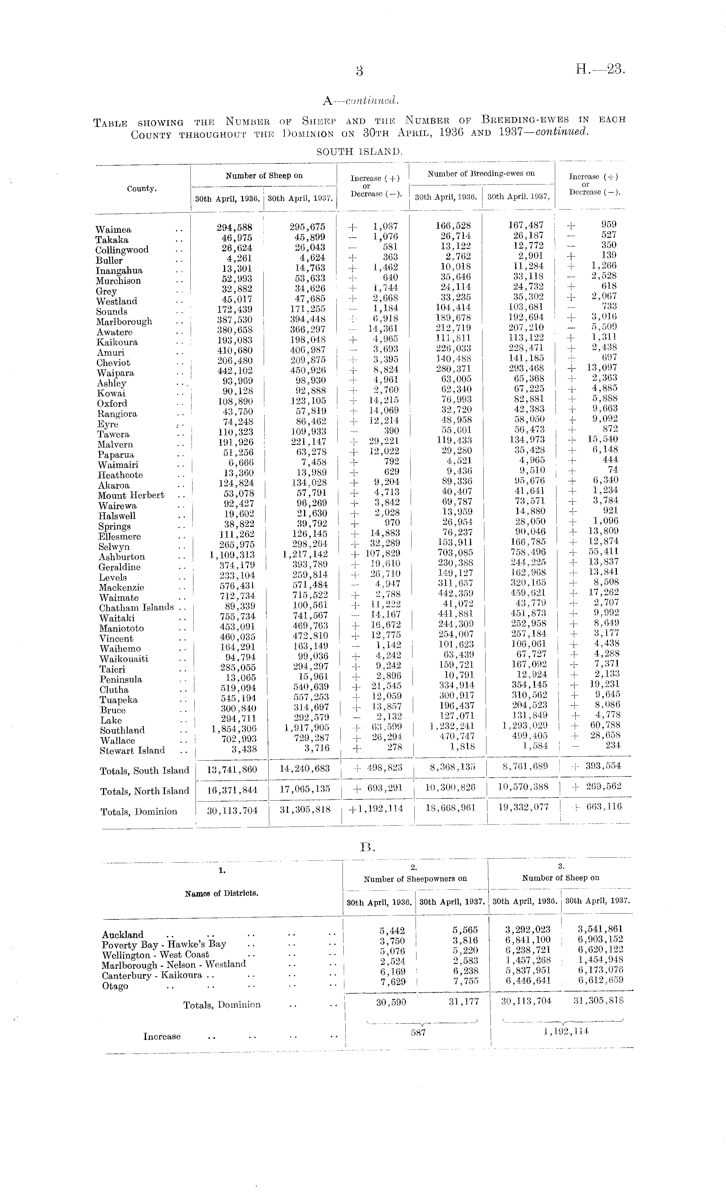 A—continued. Table showing the Number of Sheep and the Number of Breeding-ewes in each County throughout the Dominion on 30th April, 1936 and 1937—continued. SOUTH ISLAND.
