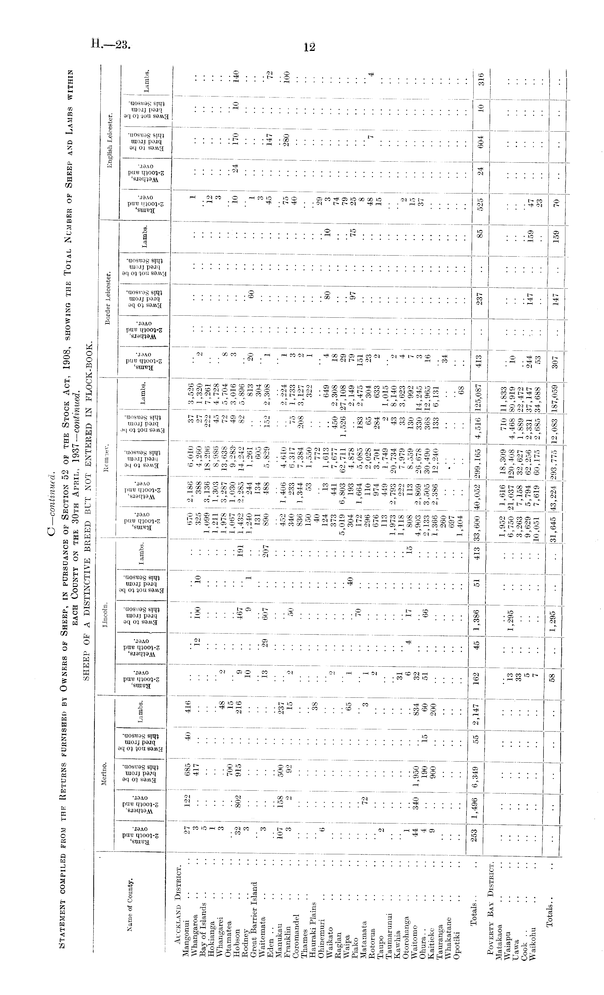 C— continued. Statement compiled from the Returns furnished by Owners of sheep, in pursuanse of Section 52 of the Stock Act, 1908,showing the Total Number of sheep and Lambs within each County on the 30th April, 1937—continued. SHEEP OF A DISTINCTIVE BREED BUT NOT ENTERED IN FLOCK-BOOK.