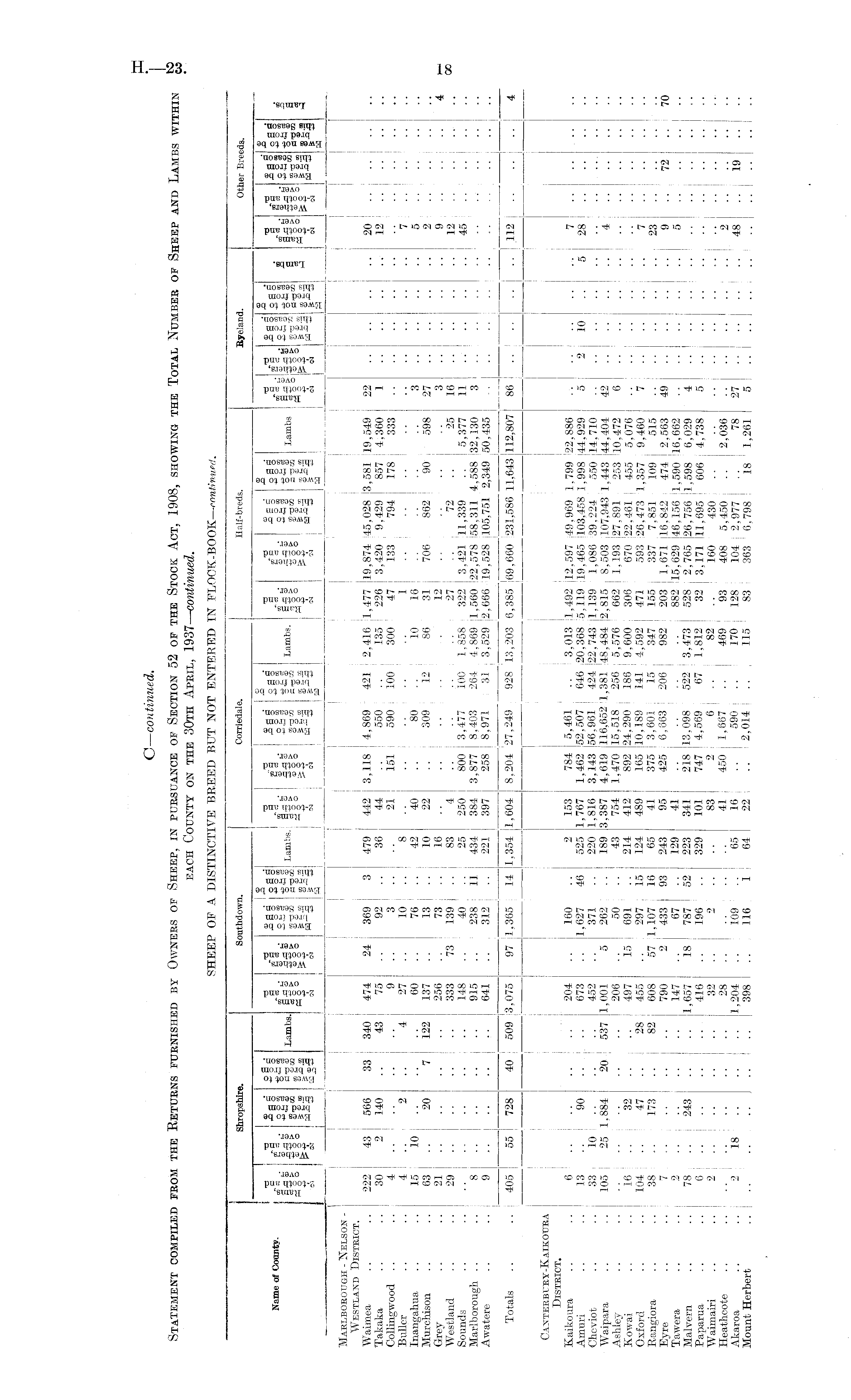 C—continued. Statement compiled from the Returns Furnis hed by Owners of Sheep, in pursuance of Section 52 of the Stock Act, 1908, showing the Total Number of Sheep and Lambs within each County on the 30th April, 1937— continued. SHEEP OF A DISTINCTIVE BREED BUT NOT ENTERED IN FLOCK-BOOK—continued.