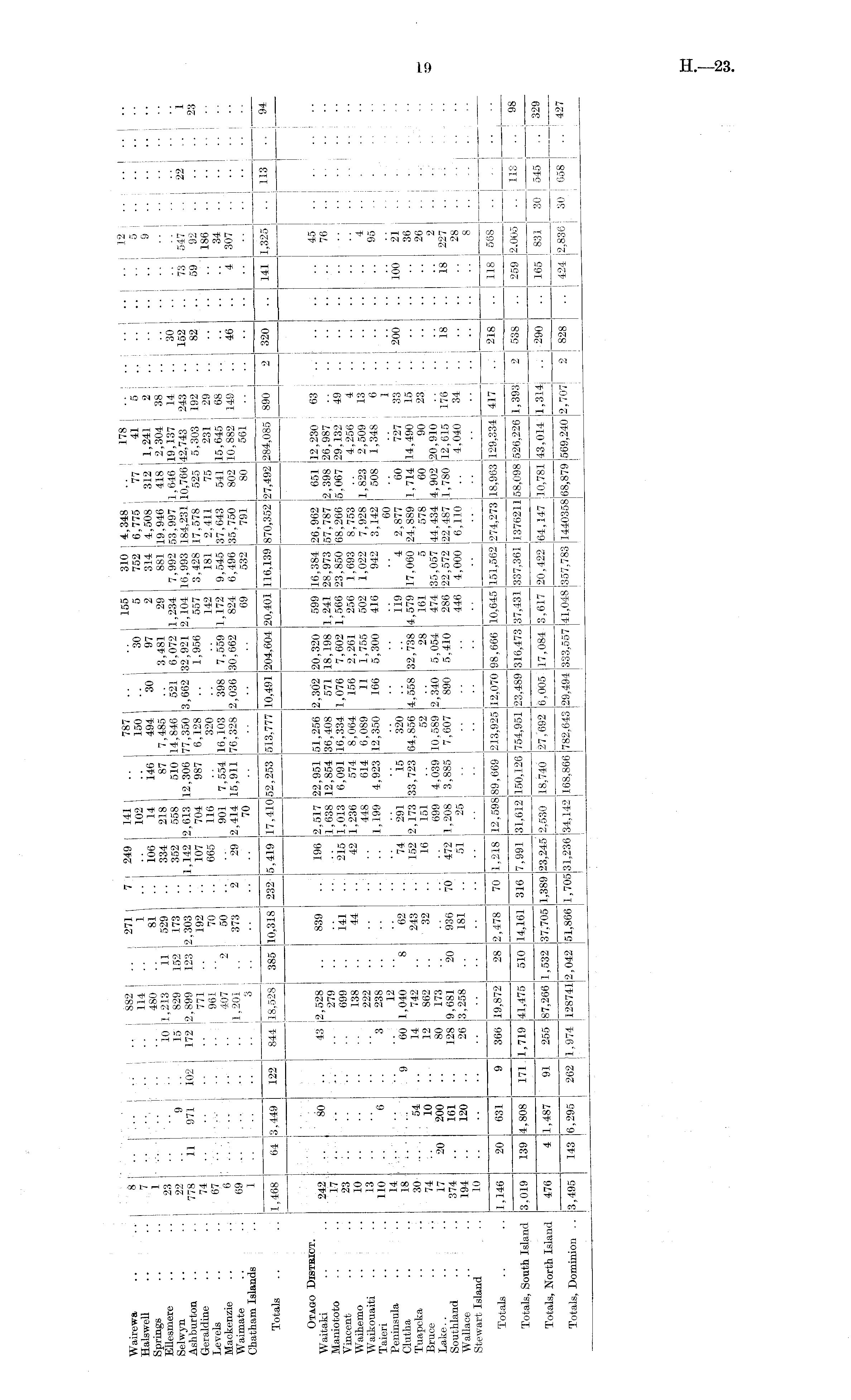 ô , ooo . 271 7 i 249 141 I . • 787 .. ! • • 155 310 4,348 .. 178 j .. .. i .. .. • • 12 • • ; • • • • j Wairewa .. .. :.§ •• . •• .. 102 150 .1 30 5 752 6,775 77 41 j 5 ! .. .. .. 5 .. j .. .. | -• H alswe11 •• 1 '■ " ■■ 480 81 i06 14 146 494 30 97 2 314 4,508 312 1,241 2 . 9 ■■ |P rm g s •• '• J ' •• 'io 1213 'll 529 .. 334 218 87 7,485 .. 3,481 29 881 19,946 418 2,304 38 .. . ! Ellesmere .. .. 23 .. .. 152 173 .. 352 558 510 14,846 521 6,072 1,234 7,992 53,997 1,646 19,137! 14 .. 30 .. .. .. • • ■■ •• Selwyn .. •• 22 .. 9 • • 1», | 613 12 306 77 350 3,662 32,921 2,104 16,993 184,231 10,766 42,743 243 .. 152 .. 73 547 .. 22 .. 1 Ash burton .. .. 778 11 971 102 1,2 2,899 123 2,303 .. 1,142 2,bid I2,d00 525 5)303 192 .. 82 .. 59 92 23 Geraldine .. 74.. 961 " 70 ! 665 116 .. 320 .. .. 142 181 2,411 75 231 29 186 .. •• by . .. ■■ ■ 901 7,554 16,103 398 7,559 1,172 9,545 37,643 541 15,645 68 .. .. .. .. 34 Mackenzie .. .. > '• " , 201 373 2 29 2 414 15,911 76,328 2,036 30,662 824 6,496 35.750 802 10,882 149 .. 46 .. 4 307 • Waimate .. • ••• •" ' , " 70 .. .. .. 69 532 791 80 561 Chatham Islands .j 1 •• •• •• •• ' ■' -— — Totalg 64~ 122 *tT 18.528 385 10.318 232 5,419 17,41052,253 513,777 10,491 204.604 20,401 116,139 870,352 27,492 284,085 890 2 320 .. 141 1,325 ... 113 .. 94^ i : . i I Otagk, Distbict. ; . 2 528 839 .. 196 2,517 22,951 51,256 2,302 20,320 599 16,384 26,962 651 12,230 63 .. .. .. .. 45 j •• Waltakl •• '• 279 " 1 638 12,854 36,408 571 18,198 1,241 28,973 57,787 2,398 26,987 •• •• 76 ... .. , | •• Mamototo .. • . • •• •• 215 1,013 6,091 16,334 1,076 7,602 1,566 23,850 68,266 5,067 29,132 49 .. •• •• | •• •• f* 138 " 44 .. 42 1,236 574 8,064 156 2,261 256 1,693 8,753 .. 4,256 4 Waihemo _ 10 222 " J 448 614 6,089 11 1,755 502 1,022 7,928 1,823 2,509 13 4 .. 1 . , j •• W aikouaiti .. •• • " " " „ " "o 900 " ' .. 1,199 4,923 12,350 166 5,300 416 942 3,142 508 1,348 6 .. .. •• •• 95 •• . ••• j " ! " Taieri ..... 110 .. b • . .. 60 .. 1 • • •• I " Peninsula .. .. ' •• ' '001040 " 8 '62 " '74 291 16 320 .. .. 119 4 2,877 60 727 33 .. 200 .. 100 21 .. . •• •• J* •• 14 ' 742 243 .. 152 2,173 33,723 64,856 4,558 32,738 4,579 17,060 24,889 1,714 14,490 15 36 .. T™P eka •• " 30 .... ■ 54 .. 14 742 .. « 16 ' 151 52 __ 28 161 5 578 60 90 23 26 .. ®™ ce '• ,, ÔA 200 " 80 173 " 699 4,039 10,589 2,340 5,054 474 35,057 44,434 4,902 20,910 •• •• •• 2 •; •• Q rtV rl " ! " 374 161 " 128 9 681 *20 936 70 472 1,208 3,885 7,607 890 5,410 286 22,572 22,487 1,780 12,615 176 .. 18 .. 18 227 .. .. Wallace !! ! !! lit " " 26 . 181 . . 61 25 446 4,000 6,110 .. 4,040 34 .. .. .. .. 28 .. .. .. .. Stewart. Island ... 10 -. • - • • • • • • • • • ■ 1 Totalg 9 366 19,872 2fT2,478 70 1,218 12,59889,669 213,925 12,070 98,666 10,645 151,562 274,273 18,963 129,334 417 .. 218 ■ ■ 118 568 „ Totals. South Island īāŌ" W ĪtT 1,719 41,475 510 14,161 316 7,991 31,612 150,126 754,951 23,489 316,4t7 37,431 337,361 137621158,098 526,226 1,393 2 538 J259_ 98_ Totals', North Island 9? 255 87,266 1,532 37,705 1,389 23,245 2,530 18,740 27,692 6,005 17,084 3,617 20,422 64,147 10,781 43,014 1,314 .. 290 30 545 .. 329 Dominion 262 1,974 1287412,042 51,866 1,70531,236 34,142 168,866 782,643 29,494 333,557 41,048 357,783 1440358 68,879 569,240 2,707 2 828 .. 424 2,836 30 658 .. 427