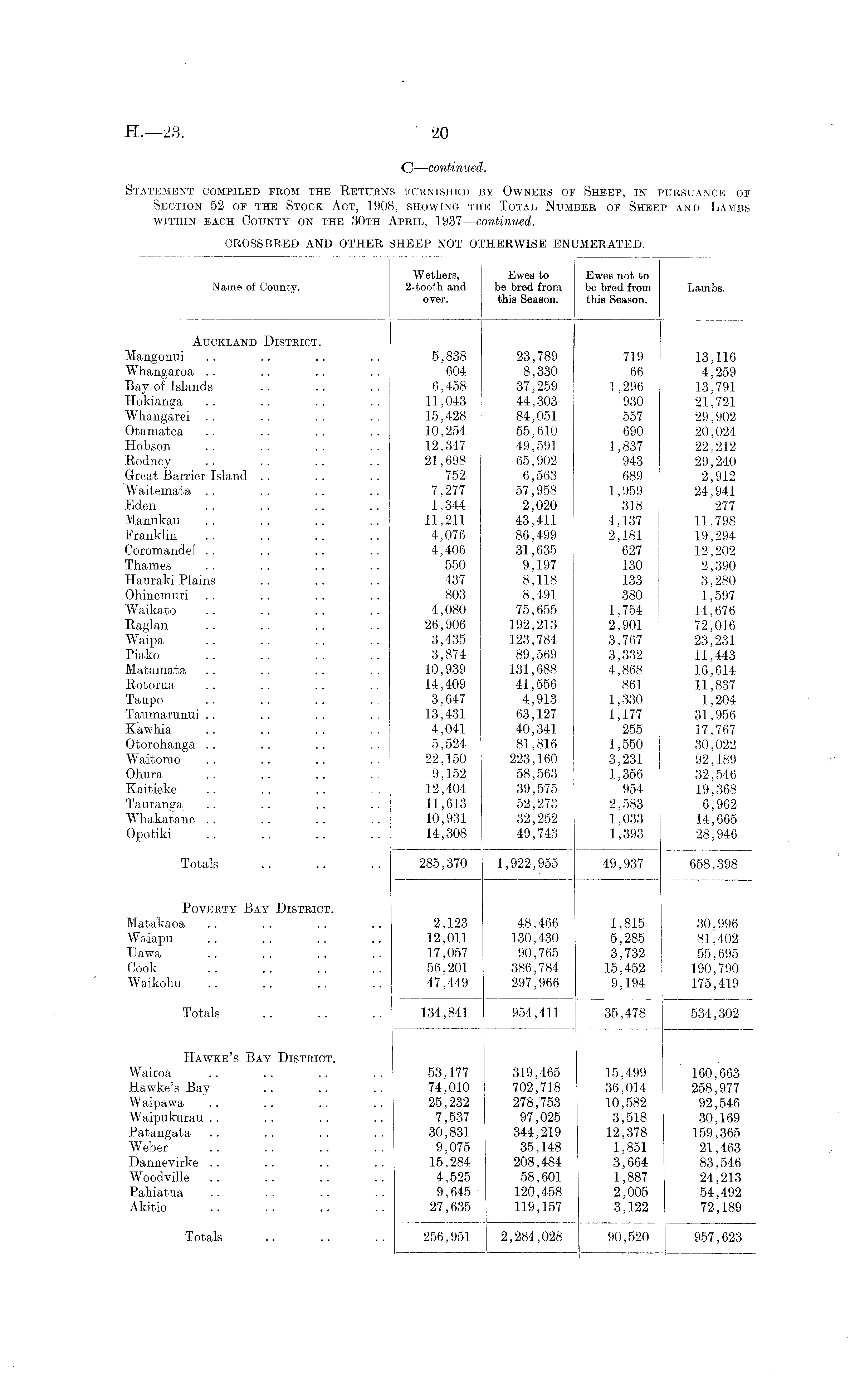 C —continued. Statement compiled from the Returns furnished by Owners of Sheep, in pursuance of Section 52 of the Stock Act, 1908, showing the Total Number of Sheep and Lambs within each County on the 30th April, 1937—continued. CROSSBRED AND OTHER SHEEP NOT OTHERWISE ENUMERATED.