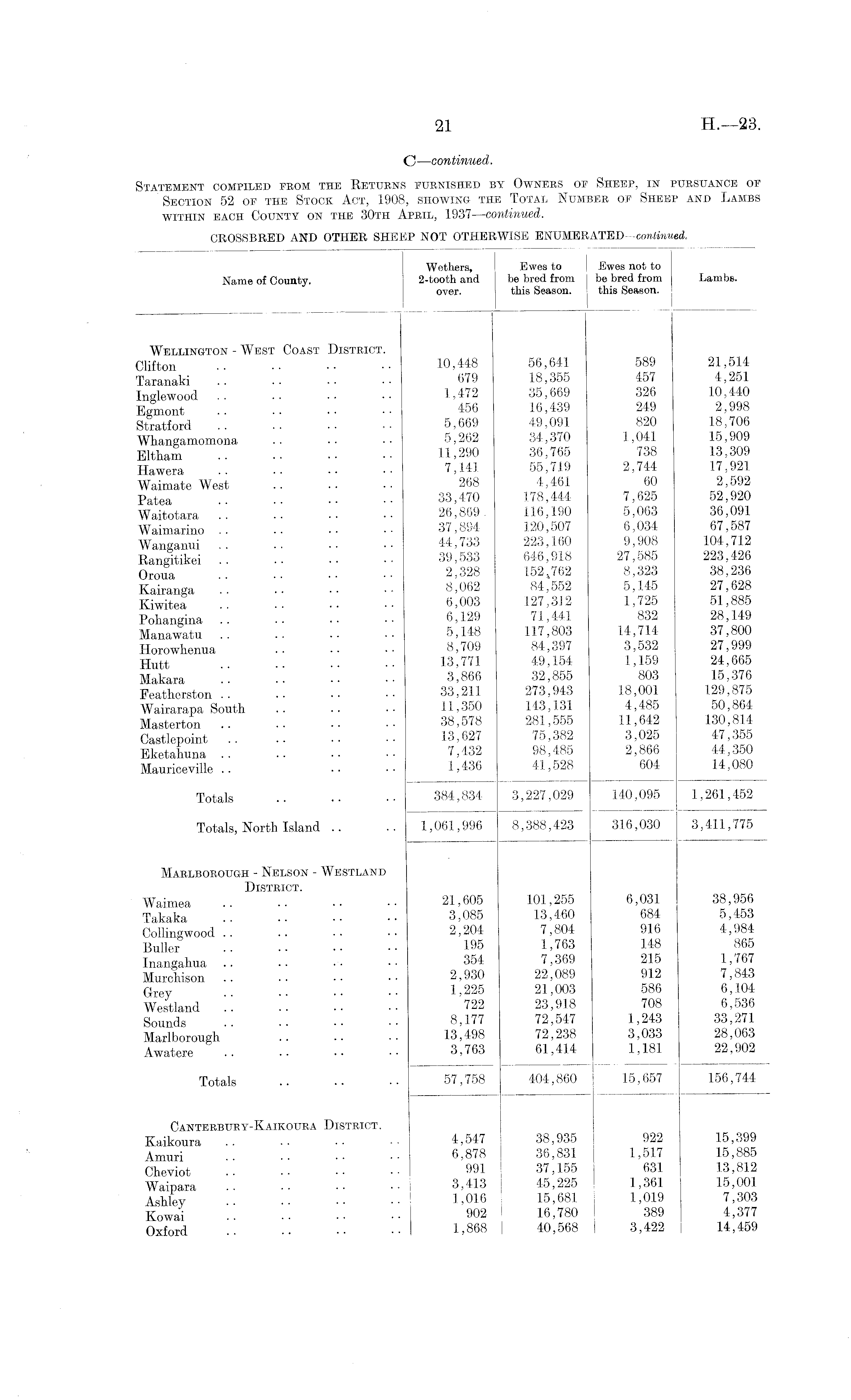 C —continued. Statement compiled from the Returns furnished by Owners of Sheep, in pursuance of Section 52 of the Stock Act, 1908, showing the Total Number of Sheep and Lambs within each County on the 30th April, 1937 —continued. CROSSBRED AND OTHER SHEEP NOT OTHERWISE ENUMERATED —continued.