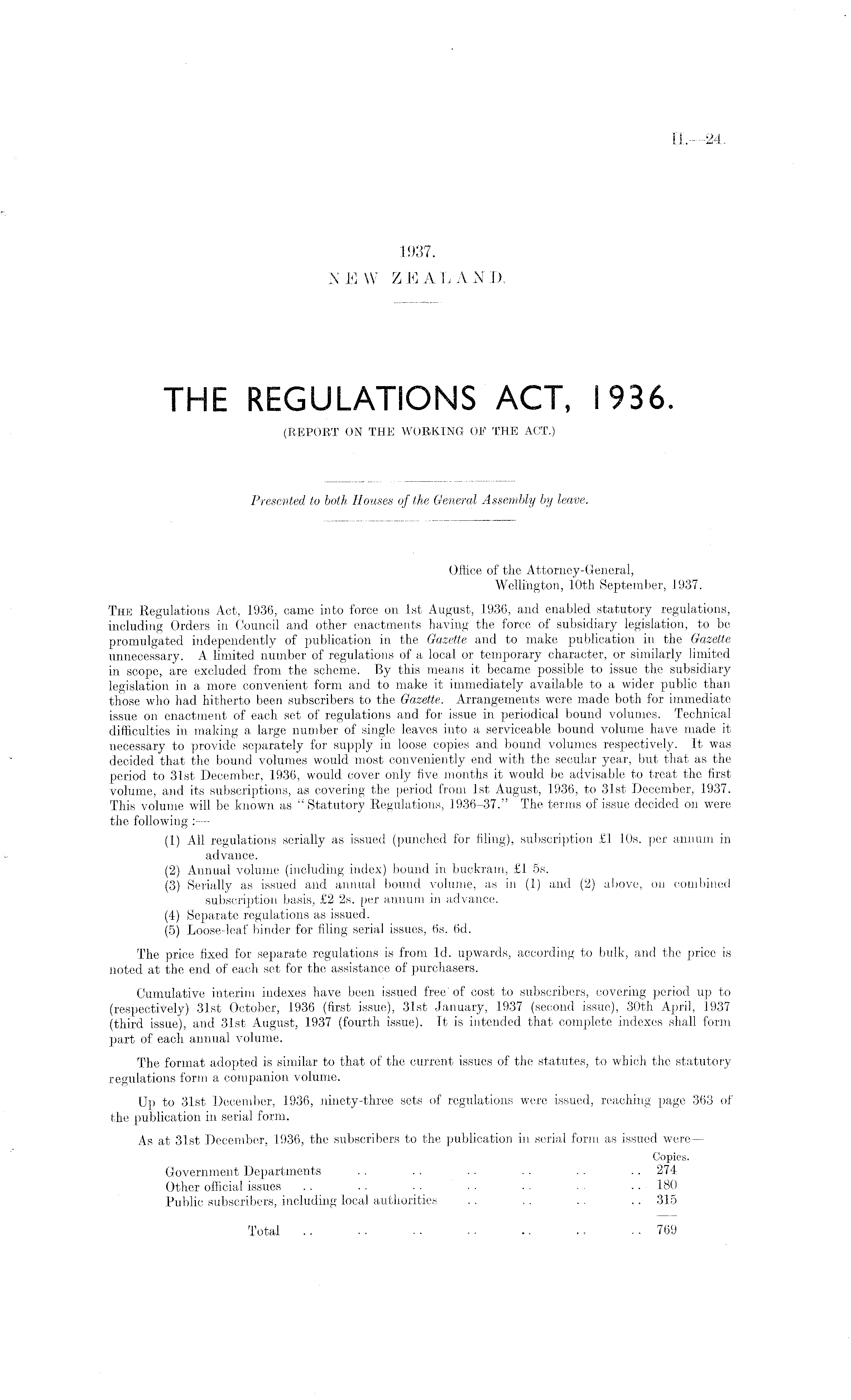 Office of the Attorney-General, Wellington, 10th September, 1937. The Regulations Act, 1936, came into force on Ist August, 1936, and enabled statutory regulations, including Orders in Council and other enactments having the force of subsidiary legislation, to be promulgated independently of publication in the Gazette and to make publication in the Gazette unnecessary. A limited number of regulations of a local or temporary character, or similarly limited in scope, are excluded from the scheme. By this means it became possible to issue the subsidiary legislation in a more convenient form and to make it immediately available to a wider public than those who had hitherto been subscribers to the Gazette. Arrangements were made both for immediate issue on enactment of each set of regulations and for issue in periodical bound volumes. Technical difficulties in making a large number of single leaves into a serviceable bound volume have made it necessary to provide separately for supply in loose copies and bound volumes respectively. It was decided that the bound volumes would most conveniently end with the secular year, but that as the period to 31st December, 1936, would cover only five months it would be advisable to treat the first volume, and its subscriptions, as covering the period from Ist August, 1936, to 31st December, 1937. This volume will be known as " Statutory Regulations, 1936-37." The terms of issue decided on were the following : — (1) All regulations serially as issued (punched for filing), subscription £1 10s. per annum in advance. (2) Annual volume (including index) bound in buckram, £1 ss. (3) Serially as issued and annual bound volume, as in (1) and (2) above, on combined subscription basis, £2 2s. per annum in advance. (4) Separate regulations as issued. (5) Loose-leaf binder for filing serial issues, 6s. 6d. The price fixed for separate regulations is from Id. upwards, according to bulk, and the price is noted at the end of each set for the assistance of purchasers. Cumulative interim indexes have been issued free'of cost to subscribers, covering period up to (respectively) 31st October, 1936 (first issue), 31st January, 1937 (second issue), 30th April, 1937 (third issue), and 31st August, 1937 (fourth issue). It is intended that complete indexes shall form part of each annual volume. The format adopted is similar to that of the current issues of the statutes, to which the statutory regulations form a companion volume. Up to 31st December, 1936, ninety-three sets of regulations were issued, reaching page 363 of the publication in serial form. As at 31st December, 1936, the subscribers to the publication in serial form as issued were — Copies. Government Departments . . . . . . .. . . .. 274 Other official issues .. • • ■ • • ■ • • . . • . 180 Public subscribers, including local authorities .. .. .. .. 315 Total ..769