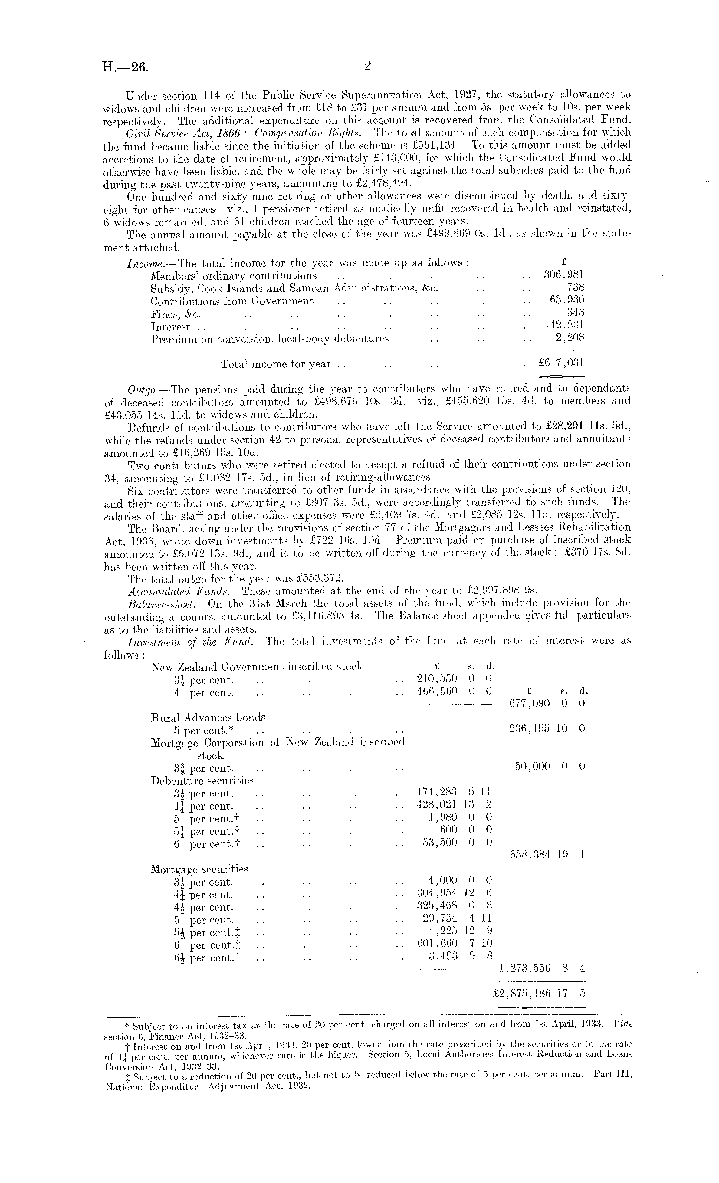 Under section 114 of the Public Service Superannuation Act, 1927, the statutory allowances to widows and children were incieased from £18 to £31 per annum and from ss. per week to 10s. per week respectively. The additional expenditure on this account is recovered from the Consolidated Fund. Civil Service Act, 1866 : Compensation Rights.—The total amount of such compensation for which the fund became liable since the initiation of the scheme is £561,134. To this amount must be added accretions to the date of retirement, approximately £143,000, for which the Consolidated Fund would otherwise have been liable, and the whole may be fairly set against the total subsidies paid to the fund during the past twenty-nine years, amounting to £2,478,494. One hundred and sixty-nine retiring or other allowances were discontinued by death, and sixtyeight for other causes —viz., 1 pensioner retired as medically unfit recovered in health and reinstated, 6 widows remarried, and 61 children reached the age of fourteen years. The annual amount payable at the close of the year was £499,869 os. Id., as shown in the statement attached. Income. —The total income for the year was made up as follows : — £ Members'ordinary contributions .. .. .. .. .. 306,981 Subsidy, Cook Islands and Samoan Administrations, &c. . . . . 738 Contributions from Government .. .. .. .. .. 163,930 Fines, &c. .. . • •. ■ • • • • • • • 343 Interest .. .. .. •• •• ■■ 142,831 Premium on conversion, local-body debentures . . .. .. 2,208 Total income for year .. .. .. .. .. £617,031 Outgo. —The pensions paid during the year to contributors who have retired and to dependants of deceased contributors amounted to £498,676 10s. 3d.—viz., £455,620 15s. 4d. to members and £43,055 14s. lid. to widows and children. Refunds of contributions to contributors who have left the Service amounted to £28,291 lis. 5d., while the refunds under section 42 to personal representatives of deceased contributors and annuitants amounted to £16,269 15s. lOd. Two contributors who were retired elected to accept a refund of their contributions under section 34, amounting to £1,082 17s. 5d., in lieu of retiring-allowances. Six contributors were transferred to other funds in accordance with the provisions of section 120, and their contributions, amounting to £807 3s. 5d., were accordingly transferred to such funds. The salaries of the staff and other office expenses were £2,409 7s. 4d. and £2,085 12s. lid. respectively. The Board, acting under the provisions of section 77 of the Mortgagors and Lessees Rehabilitation Act, 1936, wrote down investments by £722 16s. lOd. Premium paid on purchase of inscribed stock amounted to £5,072 13s. 9d., and is to be written off during the currency of the stock ; £370 17s. Bd. has been written off this year. The total outgo for the year was £553,372. Accumulated Funds. —These amounted at the end of the year to £2,997,898 9s. Balance-sheet. —On the 31st March the total assets of the fund, which include provision for the outstanding accounts, amounted to £3,116,893 4s. The Balance-sheet appended gives full particulars as to the liabilities and assets. Investment of the Fund. —The total investments of the fund at each rate of interest were as follows :— New Zealand Government inscribed stock— £ s. d. 3| per cent. .. .. .. .. 210,530 0 0 4 per cent. .. .. . . . • 466,560 0 0 £ s. d. 677,090 0 0 Rural Advances bonds — 5 per cent.* .. .. 236,155 10 0 Mortgage Corporation of New Zealand inscribed stock — 3f per cent. .. ■■ 50,000 0 0 Debenture securities — per cent. .. .. •• 174,283 511 4J per cent. .. .. •• ■■ 428,021 13 2 5 per cent.f .. .. • ■ • ■ 1, 980 0 0 5| per cent.| . . • ■ • ■ ■ • 600 0 0 6 per cent.]" .. .. • • ■ • 33,500 0 0 638,384 19 1 Mortgage securities — 3| per cent. •• •• 4,000 0 0 41 per cent. .. •• ■■ 304,954 12 6 4| per cent. .. • • • ■ • ■ 325,468 0 8 5 percent. .. •• •• 29,754 411 5A per cent.s .. -. •• •• 4,225 12 9 6 per cent.J 601,660 7 10 64 per cent, j .. .. •• •• 3,493 9 8 1,273,556 8 4 £2,875,186 17 5