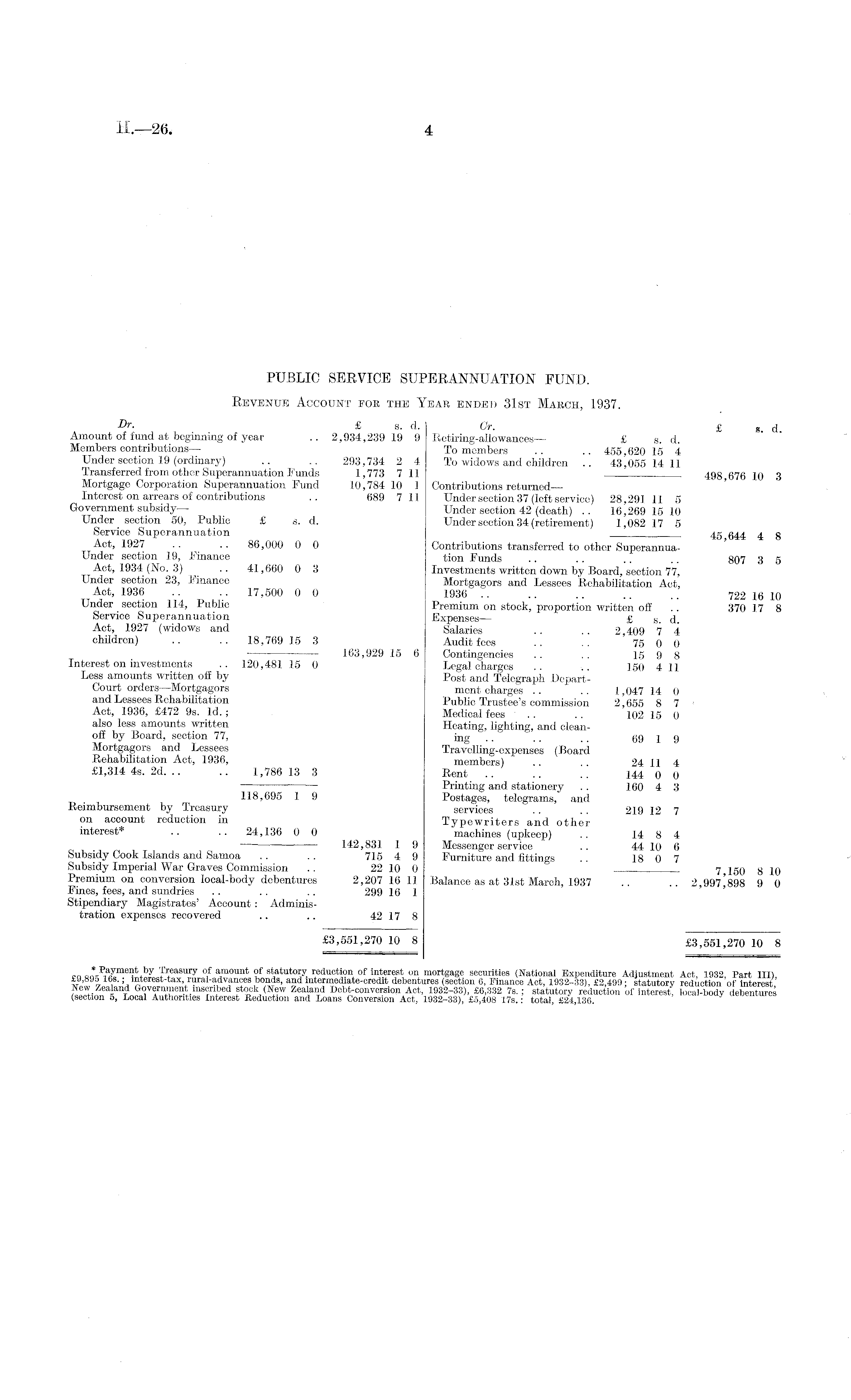 PUBLIC SERVICE SUPERANNUATION FUND. Revenue Account for the Year ended 31st March, 1937. E> r - £ s. d. Or. £ K d Amount of fund at beginning of year .. 2,934,239 19 9 Retiring-allowances— £ s. d. Members contributions— To members .. .. 435,620 15 4 Under section 19 (ordinary) .. .. 293,734 2 4 To widows and children .. 43,055 14 11 Transferred from other Superannuation Funds 1,773 7 11 498 676 10 3 Mortgage Corporation Superannuation Fund 10,784 10 1 Contributions returned— Interest on arrears of contributions .. 689 711 Under section 37 (left service) 28,291 11 5 Government subsidy— Under section 42 (death) .. 16,269 15 10 Under section 50, Public £ s. d. Under section 34 (retirement) 1,082 17 5 Service Superannuation g Act, 1927 .. . . 86,000 0 0 Contributions transferred to other SuperannuaUnder section 19, Finance tion Funds .. . . 807 3 5 Act, 1934 (No. 3) .. 41,660 0 3 Investments written down by Board, section 77, Under section 23, Finance Mortgagors and Lessees Rehabilitation Act, Act, 1936 .. . . 17,500 0 0 1936 .. .. .. .. .. 722 16 10 Under section 114, Public Premium on stock, proportion written off .. 370 17 8 Service Superannuation Expenses— £ s. d Act, 1927 (widows and Salaries .. .. 2,409 7 4 children) .. .. 18,769 15 3 Audit fees .. .. 75 0 0 163,929 15 6 Contingencies .. .. 15 9 8 Interest on investments .. 120,481 15 0 Legal charges .. .. 150 411 Less amounts written off by Post and Telegraph DepartCourt orders—Mortgagors ment charges .. .. 1,047 14 0 and Lessees Rehabilitation Public Trustee's commission 2,655 8 7 Act, 1936, £472 9s. Id.; Medical fees .. .. 102 15 0 also less amounts written Heating, lighting, and cleanoff by Board, section 77, ing .. .. _ _ 69 1 9 Mortgagors and Lessees Travelling-expenses (Board Rehabilitation Act, 1936, members) 24 11 4 £1,314 4s. 2d. .. .. 1,786 13 3 Rent .. !144 0 0 Printing and stationery . . 160 4 3 118,695 1 9 Postages, telegrams, and Reimbursement by Treasury services .. 219 12 7 on account reduction in Typewriters and other interest* .. .. 24,136 0 0 machines (upkeep) .. 14 8 4 142,831 1 9 Messenger service .. 44 10 6 Subsidy Cook Islands and Samoa .. .. 715 4 9 Furniture and fittings .. 18 0 7 Subsidy Imperial War Graves Commission .. 22 10 0 7 J5O 8 {() Premium on conversion local-body debentures 2,207 16 11 Balance as at 31st March, 1937 .. .. 2,997*898 9 0 Fines, fees, and sundries .. .. .. 299 16 1 Stipendiary Magistrates' Account: Administration expenses recovered .. .. 42 17 8 £3,551,270 10 8 £3,551,270 10 8 en onc P i a / me " t < by H easury °, f ® mollllt ° f statutory reduction of interest on mortgage securities (National Expenditure Adjustment Act, 1932, Part III) £9,895 16s. • interest-tax, rural-advances bonds, and intermediate-credit debentures (section 6, Finance Act, 1932-33). £2,499; statutory rednction of Interest Sif„ ea i an T »o ve / n ' n ™t. msc r n , be d stock (New Zealand Debt-conversion Act, 1932-33), £6,332 7s. ; statutory reduction of interest, local-body debentures (section 5, local Authorities Interest .Reduction and Loans Conversion Act, 1932-33), £5,408 175.: total, £24,136.