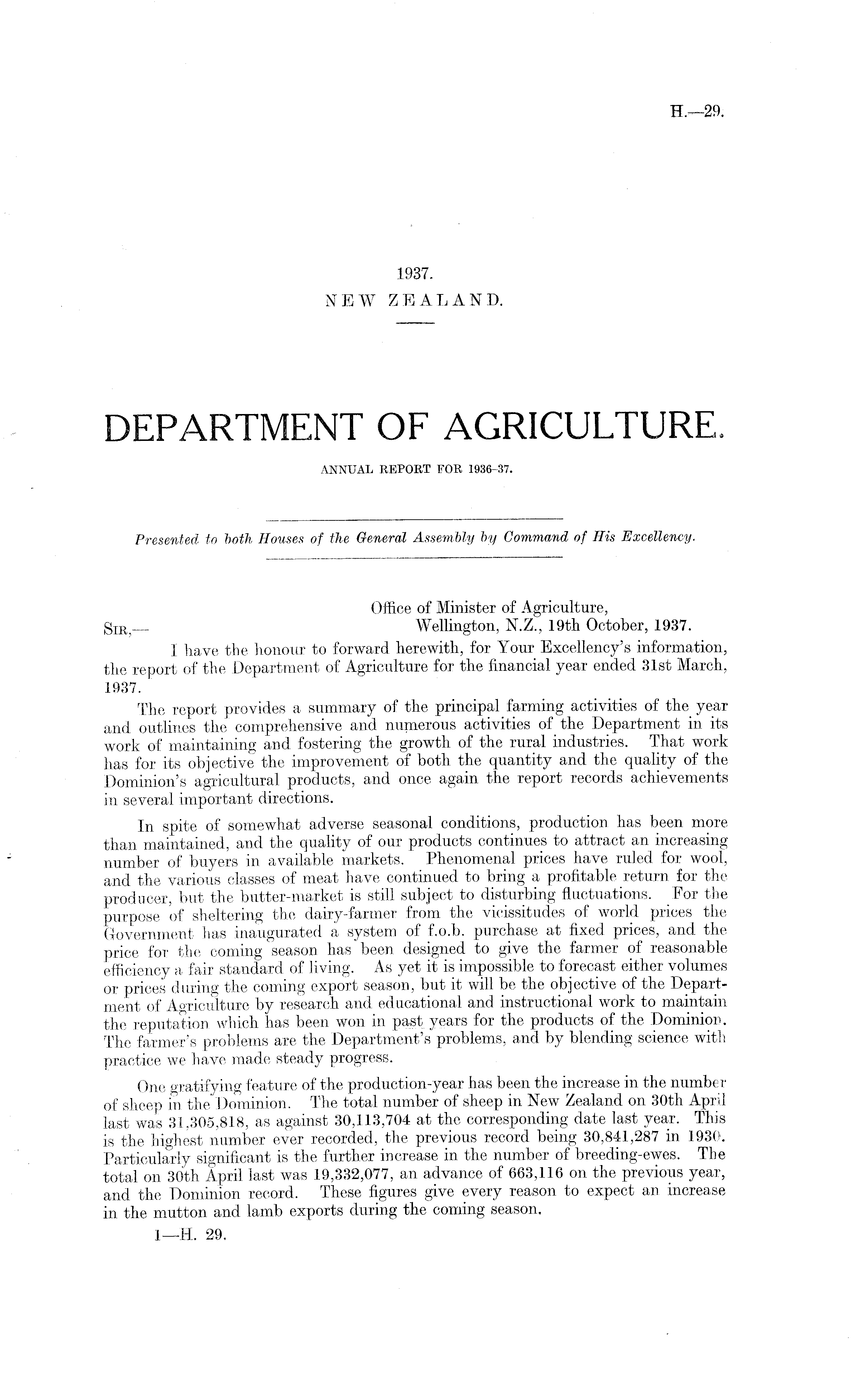 Office of Minister of Agriculture, g IR; Wellington, N.Z., 19th October, 1937. I have the honour to forward herewith, for Your Excellency's information, the report of the Department of Agriculture for the financial year ended 31st March, 1937. The report provides a summary of the principal farming activities of the year and outlines the comprehensive and numerous activities of the Department in its work of maintaining and fostering the growth of the rural industries. That work lias for its objective the improvement of both the quantity and the quality of the Dominion's agricultural products, and once again the report records achievements in several important directions. In spite of somewhat adverse seasonal conditions, production has been more than maintained, and the quality of our products continues to attract an increasing number of buyers in available markets. Phenomenal prices have ruled for wool, and the various classes of meat have continued to bring a profitable return for the producer, but the butter-market is still subject to disturbing fluctuations. For the purpose of sheltering the dairy-farmer from the vicissitudes of world prices the Government has inaugurated a system of f.o.b. purchase at fixed prices, and the price for the coming season has been designed to give the farmer of reasonable efficiency a fair standard of living. As yet it is impossible to forecast either volumes or prices daring the coming export season, but it will be the objective of the Department of Agriculture by research and educational and instructional work to maintain the reputation which has been won in past years for the products of the Dominion. The farmer's problems are the Department's problems, and by blending science with practice we have made steady progress. One gratifying feature of the production-year has been the increase in the number of sheep in the Dominion. The total number of sheep in New Zealand on 30th April last was 31,305,818, as against 30,113,704 at the corresponding date last year. This is the highest number ever recorded, the previous record being 30,841,287 in 1930. Particularly significant is the further increase in the number of breeding-ewes. Tlie total on 30th April last was 19,332,077, an advance of 663,116 on the previous year, and the Dominion record. These figures give every reason to expect an increase in the mutton and lamb exports during the coming season.